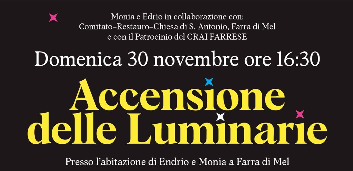 BORGO VALBELLUNA L’Accensione delle Luminarie di Farra di Mel, in Contrada delle Crosere, è diventata un appuntamento attesissimo che richiama persone da tutta la provincia. Domenica 30, alle 16:30, Monia Conti ed Endrio Da Canal inaugureranno lo spettacolo di luci e musica realizzato sulla loro casa, in collaborazione con il comitato per il restauro della chiesetta di S. Antonio e con il patrocinio del Cral Farrese. Da oltre dieci anni creano installazioni luminose con materiali riciclati, attive ogni sera dalle 17 alle 23 fino al 6 gennaio, visibili anche dall’auto sintonizzandosi sulla frequenza 107.3. L’evento ospita il coro Vocal Waves e sostiene il restauro della chiesa. Nel periodo natalizio saranno visitabili anche il presepio di S. Teonisto e il Museo del Latte.