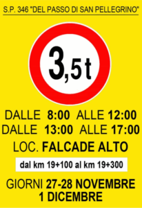 LIVINALLONGO La strada provinciale 563 di Salesei, nel tratto compreso tra Pian di Salesei e Costa di Pian, sarà fino al 28 novembre sarà chiusa dalle 8.00 alle 12.40 e dalle 13.40 alle 16.15, dal lunedì al venerdì. FALCADE S.P. 25 “Passo Valles”, nel tratto tra il Bivio Valles e Caverson, fino al 28 novembre sarà soggetta a chiusure temporanee per lavori di taglio di piante pericolanti, nei giorni feriali dalle ore 8 alle 12 e dalle 13 alle 16, con chiusure di massimo 30 minuti.