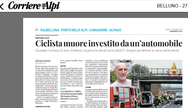 Tragico incidente ieri pomeriggio intorno alle 14.30 a Cadola, nel territorio di Ponte nelle Alpi. Il 65enne Giuseppe Fontana, residente a Belluno, stava percorrendo in bicicletta la Statale 51 di Alemagna all’uscita dell’autostrada A27 quando è stato investito da un’auto che procedeva nello stesso senso di marcia. Secondo le prime ricostruzioni della Polizia Stradale di Belluno, l’uomo sarebbe stato colpito da dietro, ma la dinamica resta ancora da chiarire.