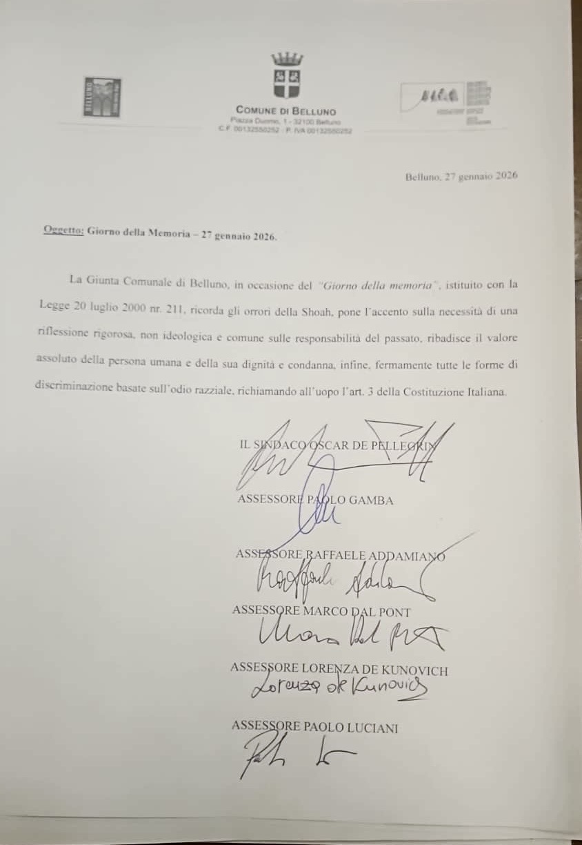BELLUNO In occasione del Giorno della Memoria, istituito dalla Legge 20 luglio 2000 n. 211, la Giunta Comunale di Belluno rinnova il proprio impegno nel ricordare gli orrori della Shoah. L’Amministrazione sottolinea l’importanza di una riflessione rigorosa, condivisa e non ideologica sulle responsabilità storiche del passato, affinché la memoria diventi strumento di consapevolezza civile. Viene ribadito il valore assoluto della persona umana e della sua dignità, condannando con fermezza ogni forma di discriminazione fondata sull’odio razziale. Un richiamo esplicito è rivolto all’articolo 3 della Costituzione Italiana, fondamento di uguaglianza, rispetto e convivenza democratica.