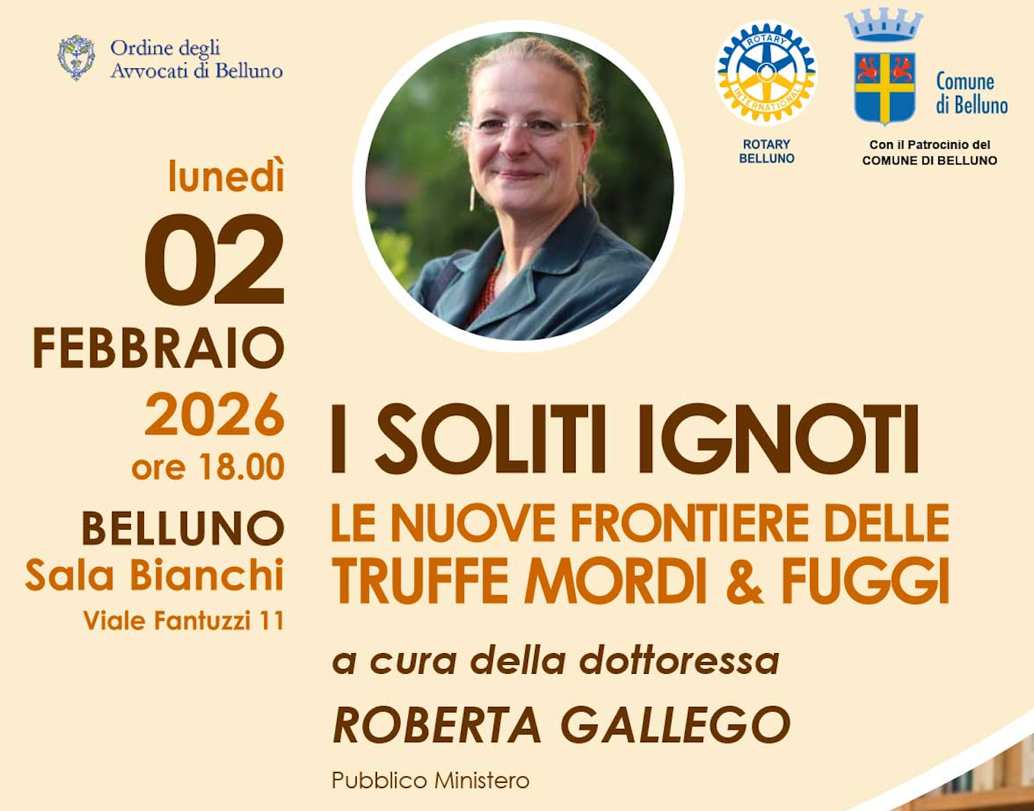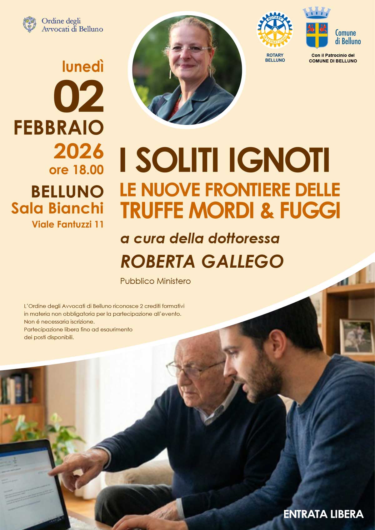 BELLUNO Il Rotary Club Belluno, in collaborazione con l’Ordine degli Avvocati e con il patrocinio del Comune di Belluno, organizza l’incontro “I soliti ignoti. Le nuove frontiere delle truffe mordi e fuggi”. La serata, guidata dalla Pubblico Ministero Roberta Gallego, si terrà lunedì 2 febbraio alle ore 18.00 nella Sala Bianchi di Belluno. L’accesso è libero e gratuito, senza prenotazione, fino a esaurimento posti. L’iniziativa mira a fornire strumenti concreti di prevenzione e sensibilizzare la comunità sui nuovi raggiri. Per gli avvocati è previsto il riconoscimento di due crediti formativi. Secondo il presidente Luca Luchetta, l’evento rappresenta un’importante occasione di aggiornamento pratico e informativo per cittadini e professionisti.