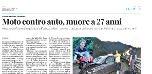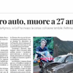 SCONTRO MORTALE A PEDEROBBA: MUORE CENTAURO 27ENNE, GRAVISSIMA LA FIDANZATA