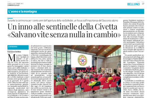 ALLEGHE Un importante sabato di fine settembre 2025, con un evento organizzato dal comune di Alleghe con il patrocinio della Comunità Montana, la Provincia di Belluno, della Regione Veneto e sotto l’alto patrocinio del Parlamento Europeo: “In Civetta nasce il sesto grado”, centesimo anniversario della via sulla parete Nord Ovest che ha preso il nome dai due scalatori Emil Solleder e Gustav Lettembauer protagonisti i componenti del soccorso alpino di Agordo, Rocca Pietore ed Alleghe, e nel pomeriggio i testimoni delle scalate della nord-ovest con storie e aneddoti raccontati dagli alpinisti con Alessandro Baù e Luca Vallata. Grande partecipazione e grandi applausi per l’evento.