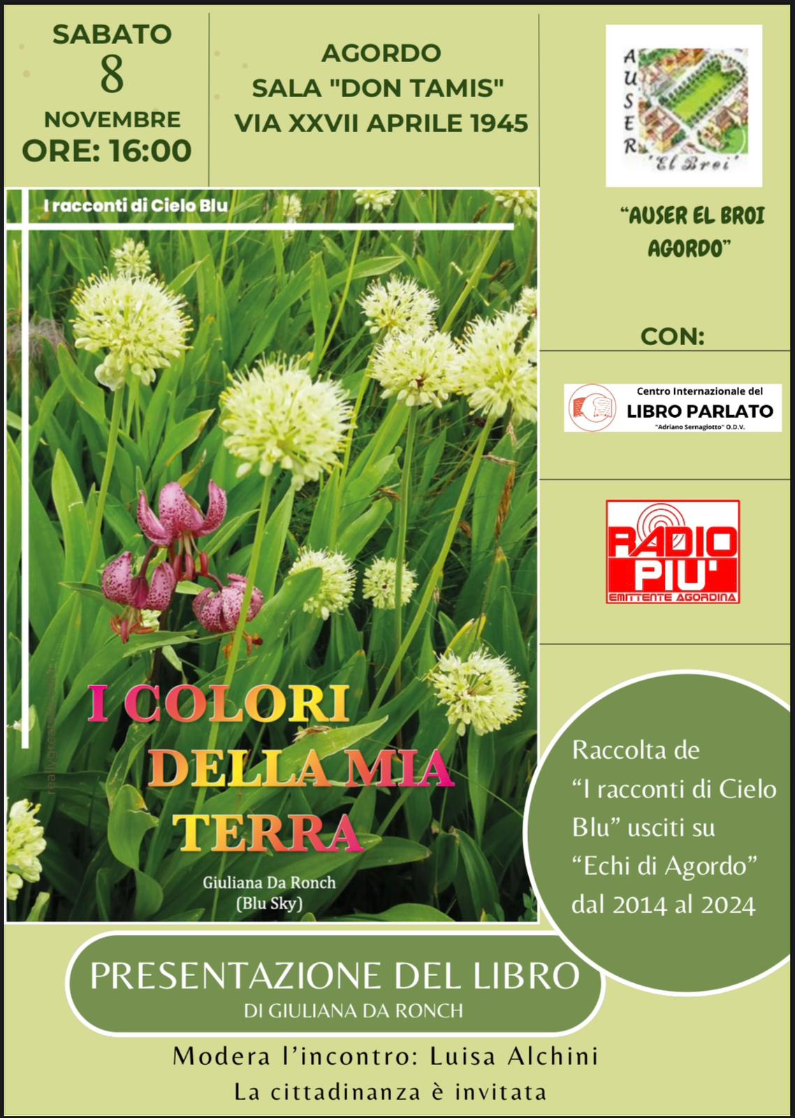 ALLE 8.05 LA RASSEGNA STAMPA LOCALE 8.25 PIU SIAMO, DI MARINA DONA’ 900 la musica country di alex nascinben 9.40 OGGI COME IERI, CON SILVIA BALDO 10.10 sei in radio se… da facebook con Marina Donà 10.30 i colori della mia terra, il libro di Giuliana Da Ronch 10.40 DALLO STAND DELL’APPIA AD ARREDAMONT, LONGARONE LE INTERVISE PER LE TRE RADIO 11.00 arcade show di elia casagrande 12 LISCIO NON TI LASCIO DI MIRCO BENVICENNI 13.10 TRE PER DUE PER TE… CON MARINA DONA’ 13.20 collage operazione nostalgia, con loris scussel 14.00 foglie e castagne musica d’autunno 14.30 GOLDEN CLASSIC CON MARCO EDELVAIS 15.00 UEEEB LA STORICA VOCE DI NINO FIABANE AL SECOLO MAURIZIO SALINBENI CON MARINA DONA’ 16 45 LE HIT STORICHE DI MIRCO BENCIVENNI 19.05 LE ANTICIPAZIONI DAL TG DI ANTENNA 3 DA UN’IDEA DI TIZIANA BOLOGNANI