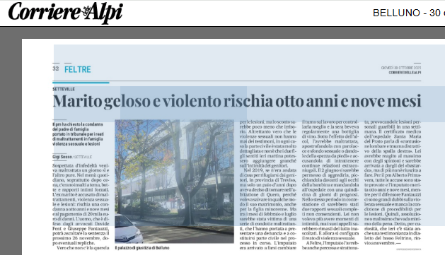 QUERO Una donna ha denunciato anni di maltrattamenti, insulti, botte e rapporti forzati da parte dell’ex marito, che ora rischia una condanna a otto anni e nove mesi di carcere e al pagamento di 20 mila euro di risarcimento. L’uomo, difeso dagli avvocati Davide Fent e Giuseppe Fantauzzi, avrebbe controllato la moglie, insultandola e picchiandola, anche davanti alla figlia. Gli episodi più gravi risalirebbero al 2021, dopo il tentativo della donna di salvare il matrimonio. Il pm Alberto Primavera ha chiesto la condanna piena, mentre la difesa contesta la violenza sessuale e la procedibilità delle lesioni. La sentenza è attesa il 26 novembre.