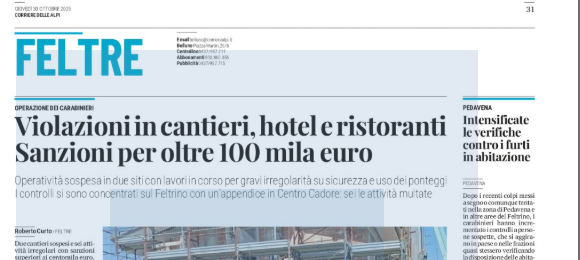 BELLUNO Proseguono con ritmo serrato le verifiche dei Carabinieri del Nucleo Operativo del Gruppo Tutela Lavoro di Venezia, in collaborazione con il Nucleo Ispettorato del Lavoro (NIL) di Belluno e con il supporto delle Compagnie dell’Arma di Feltre e Cortina d’Ampezzo, su tutto il territorio provinciale. L’obiettivo è accertare la regolarità dei rapporti di lavoro e garantire il rispetto delle normative in materia di salute e sicurezza nei luoghi di lavoro. Le ispezioni, che hanno riguardato in particolare i settori edile, ristorazione e alberghiero, hanno portato a diverse sanzioni e sospensioni. Nel Centro Cadore, un’impresa edile è stata sospesa per gravi violazioni delle norme di sicurezza: mancavano parapetti e impalcature idonee, e i ponteggi risultavano inadeguati, con un concreto rischio di caduta dall’alto per i lavoratori. A Feltre, invece, in un altro cantiere sono state sospese tre imprese edili. Le verifiche hanno accertato l’utilizzo di ponteggi non a norma, con aperture verso il vuoto e passerelle precarie, condizioni tali da mettere in serio pericolo l’incolumità degli operai. Sono inoltre emerse carenze nella gestione documentale del cantiere, con difformità nel P.I.M.U.S. (Piano di montaggio, uso e smontaggio dei ponteggi) e nel P.O.S. (Piano operativo di sicurezza), documenti fondamentali per la corretta conduzione dei lavori. Sanzioni sono state inflitte anche al CSE – Coordinatore per la Sicurezza in fase di Esecuzione – per mancata vigilanza sull’osservanza delle norme da parte delle ditte presenti. Sempre nel Feltrino, i controlli hanno interessato anche una struttura alberghiera e un locale di gastronomia etnica. Nel primo caso sono emerse carenze nella rete e nell’impianto elettrico, con la necessità di interventi di manutenzione per prevenire il rischio di folgorazione; nel secondo, le violazioni hanno riguardato la mancata formazione del personale, l’assenza del medico competente e insufficienze nell’organizzazione delle emergenze, a causa del numero ridotto di addetti antincendio e di pronto soccorso. A fronte delle irregolarità riscontrate, sono state comminate sanzioni e ammende per un importo complessivo superiore ai 100.000 euro. L’attività ispettiva proseguirà anche nei prossimi giorni, con l’obiettivo di rafforzare la cultura della sicurezza nei luoghi di lavoro e contrastare ogni forma di sfruttamento o negligenza a danno dei lavoratori.