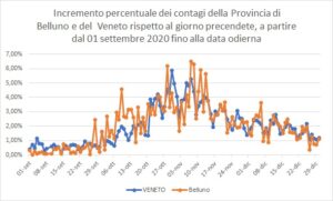 Veneto una situazione preoccupante, dal 7 gennaio con Calabria e Liguria rischia di passare in fascia arancione, anche se il rapporto tamponi-contagi è sceso al 5,7% e l’indice di contagio Rt è sceso da 1,11 a 1,07. Il Ministro D’Incà propone di prolungare la zona rossa fino all’11 gennaio. Fa spallucce il Presidente Luca Zaia, anzi al Ministro manda a dire “Lo capisco che cerca di rendersi utile per il suo Veneto visto che ha la delega per i rapporti con il Parlamento, ma le restrizioni sono un fatto tecnico che non competono nè a lui nè all’assessore Manuela Lanzarin, quanto alla riapertura della scuola il 7 gennaio finalmente il Governo ha capito che era meglio tornare in classe al 50% nelle superiori”. Intanto in Veneto nelle ultime 24 ore si sono contati altri 120 decessi per covid, a Verona sono oltre 20mila gli infetti. Quasi 4000 positivi in più (254 attualmente postiivi nelle 24 ore), 30 ricoveri in meno in area medica e 3 in più nelle terapie intensive ormai alla soglia delle 400 (398 a ieri). Luciano Flor il segretario regionale ieri ha spiegato il piano per i vaccini anticovid con una novità “Chi non vuole il vaccino lo dovrà motivare, inviate 220mila dosi, si accorcia di una settimana la durata della prima fase mentre è in corso la trattativa con le case di riposo per stilare un protocollo per il consenso degli anziani”. Le Farmacie pronte a partire con i tamponi rapidi senza ricetta del medico di base (costo 26 euro), i farmacisti poi segnaleranno i positivi al sistema regionale. In Provincia di Belluno subito la novità, l’indagine dell’Istat che conferma un aumento dei decessi del 6,9% dallo scorso marzo ad ottobre con incrementi del 32% ad aprile e il 23,8% a novembre in Veneto la percentuale dei decessi è stata del 42,8%. Dal 1 marzo al 31 ottobre secondo l’Istat sono decedute 1774 persone, 275 i morti nella prima ondata primaverile, nella fascia di età over 65 da marzo c’è stato un incremento di decessi dell’ 8,35%.