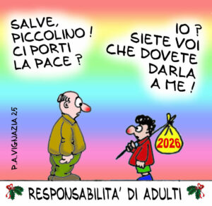 In questa vignetta di Pieraldo Vignazia (“VIP”) un adulto chiede ingenuamente a un bambino se porterà la pace. La risposta ribalta tutto: “Siete voi che dovete darla a me!”. Il sacco con scritto 2026 dice che il futuro pesa sulle spalle dei più giovani. Il messaggio è chiaro e scomodo: la pace non è una promessa da delegare, ma una responsabilità degli adulti, oggi.