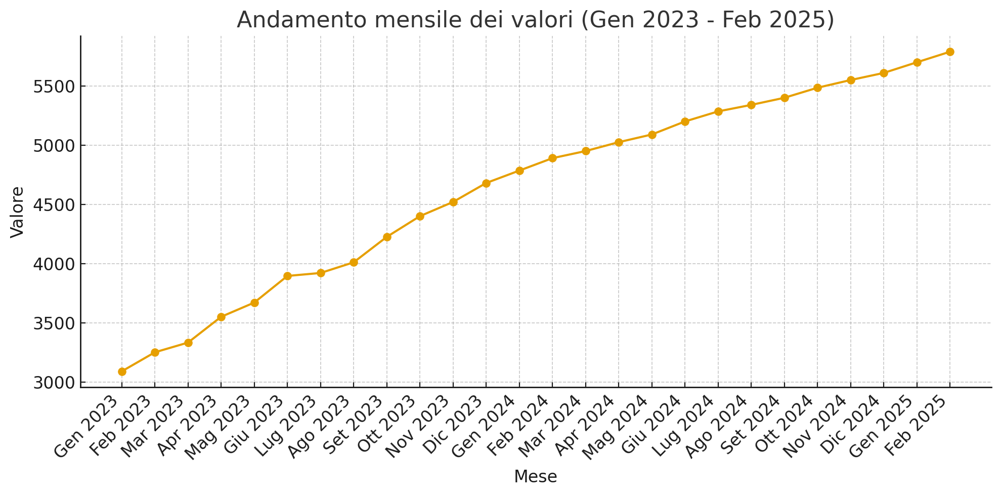Ecco il grafico dell’andamento mensile dei valori da gennaio 2023 a febbraio 2025 Si nota una crescita costante e regolare, con lievi oscillazioni ma un trend complessivamente in aumento.