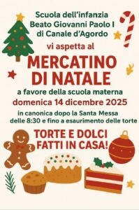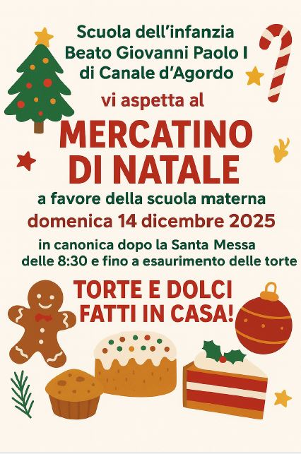 CANALE D’AGORDO La Scuola dell’infanzia Beato Giovanni Paolo I di Canale d’Agordo organizza il tradizionale Mercatino di Natale, un appuntamento molto atteso dalla comunità locale. L’evento si terrà domenica 14 dicembre 2025, in canonica, dalle 8:30, e proseguirà fino a esaurimento delle torte. Il ricavato sarà interamente destinato a favore della scuola materna, contribuendo al sostegno delle attività educative. Tra i protagonisti della giornata ci saranno le torte e i dolci fatti in casa, preparati con cura da genitori e volontari. Un’occasione speciale non solo per sostenere l’istituto, ma anche per condividere lo spirito natalizio attraverso sapori genuini e momenti di convivialità per grandi e piccoli.