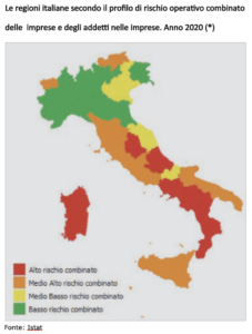 Secondo l’indagine Istat realizzata verso la fine dell’anno scorso, dall’incrocio dei dati relativi al numero di imprese che hanno denunciato di essere a rischio operativo Alto e Medio Alto con il corrispondente numero di addetti interessati, è possibile mappare il rischio operativo del nostro sistema economico. Dal risultato di questa operazione è emerso che il Mezzogiorno è la ripartizione geografica più colpita dalla pandemia: cinque regioni sono ad Alto rischio combinato (Abruzzo, Campania, Basilicata, Calabria e Sardegna), altre 2, invece, sono a Medio Alto rischio (Puglia e Sicilia). Nel Sud solo il Molise si trova in una situazione di rischio combinato Medio-Basso. Al Centro, invece, preoccupa la situazione dell’Umbria (Alto-Rischio), del Lazio e della Toscana (Medio-Alto Rischio). Al Nord, infine, preoccupa la situazione emersa in Valle d’Aosta e nella provincia autonoma di Bolzano che ricadono nell’area a Medio-Alto rischio combinato. Rispetto a tutte le principali regioni settentrionali, il Veneto presenta un livello di vulnerabilità superiore; tale situazione è riconducibile alla sua forte vocazione turistica e alla crisi registrata, in particolar modo, del settore delle pelli e del tessile/abbigliamento.