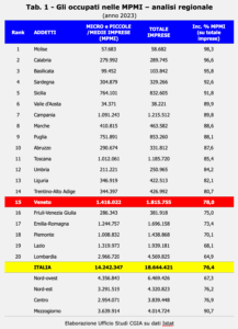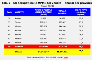 Come abbiamo avuto modo di segnalare all’inizio di questa analisi, le nostre Pmi sono uno straordinario serbatoio occupazionale, in particolar modo nel Mezzogiorno (vedi Tab. 1) che è la ripartizione geografica del Paese che, a differenza delle altre, dispone di poche grandi imprese, quasi nessuna multinazionale e un numero contenutissimo di grandi banche e di assicurazioni. Come dicevamo più sopra, in Veneto su oltre 1,8 milioni di lavoratori dipendenti, 1,4 lavora nelle nostre Pmi. Rovigo presenta la quota più elevata di lavoratori occupati nelle Pmi sul totale provinciale (92,8 per cento). Seguono Treviso con il 83,6 per cento, Vicenza con il 79,5, Padova con il 79,2, Belluno con il 76,9, Venezia con il 73,3 e Verona con il 72,3 (vedi Tab. 2).