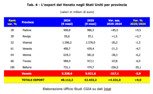 Se, come dicevamo più sopra, a livello regionale le nostre esportazioni nel mondo sono scese dello 0,6 per cento, molto più pesante è stata la contrazione registrata verso il mercato statinutense. Sempre tra gennaio e settembre 2025 rispetto allo stesso arco temporale del 2024, la flessione è stata addirittura del 5,9 per cento. Insomma, l’introduzione dei dazi ha pesantemente ostacolato le nostre esportazioni verso gli USA che, in termini assoluti, sono diminuite di 317 milioni di euro. Se Padova (+9,5 per cento) e Rovigo (+2,7) hanno accresciuto le quote di mercato negli States, Verona (-6,2), Treviso (-6,9) e in particolare Belluno (-35,1) sono “crollate” (vedi Tab. 3).
