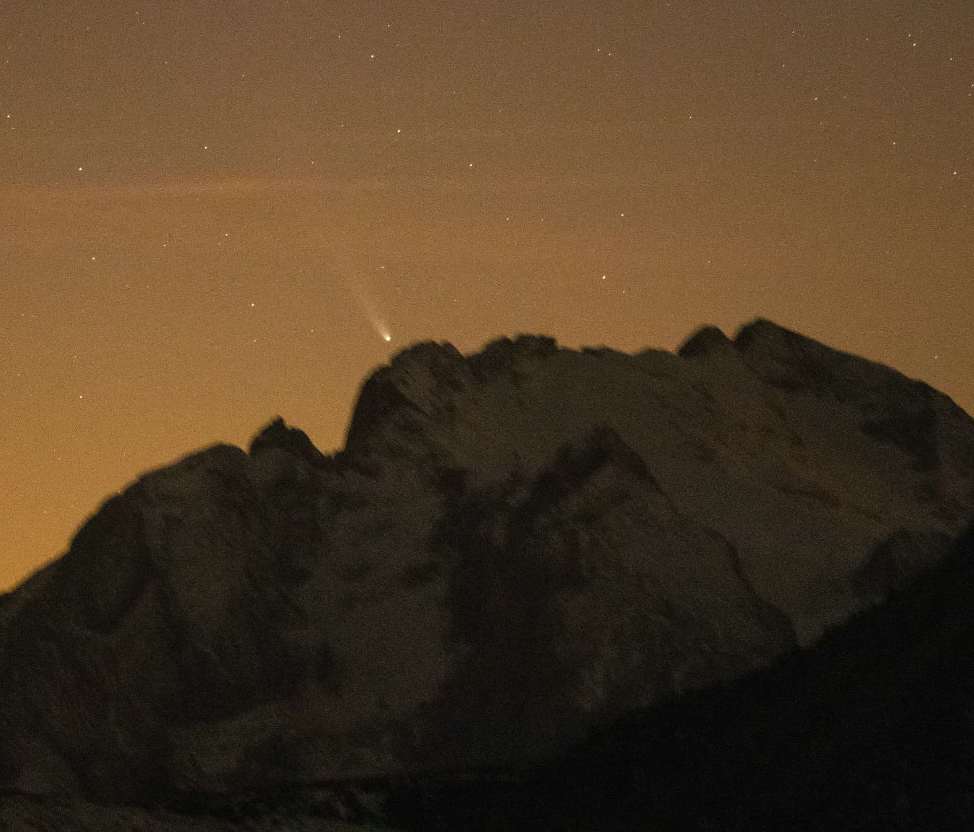 La cometa Lemmon, passata nel punto più vicino alla Terra il 28 ottobre e in quello più vicino al Sole l’8 novembre, si sta ora inesorabilmente allontanando. L’oggetto celeste ha dato spettacolo per un lungo periodo, favorito anche dal meteo stabile che ha permesso agli appassionati di ammirarlo al meglio specie a fine ottobre, quando è risultato percepibile (pur senza spiccare) a occhio nudo. Bellissima la sua lunga coda di gas rilevabile anche in piccoli binocoli. Ho dato l’ultimo saluto alla Lemmon nella serata del 10 novembre quando, ormai molto bassa sull’orizzonte, è tramontata sulla Marmolada. Tornerà fra oltre 1300 anni.