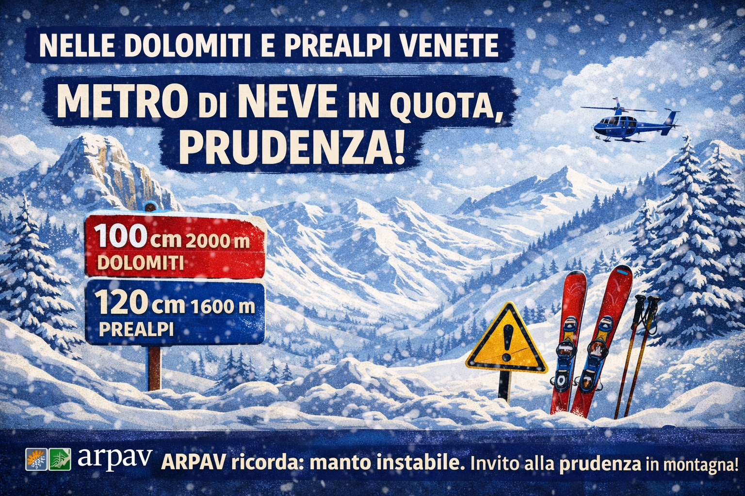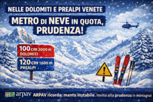 La neve è tornata a imbiancare in modo consistente Dolomiti e Prealpi venete. Secondo il bollettino ARPAV – Centro Valanghe di Arabba, aggiornato al 29 gennaio alle 8, alle quote di 2000 metri sulle Dolomiti si registrano spessori compresi tra 40 e 100 centimetri, con punte elevate tra Cortina, Falzarego, Arabba, Zoldo e Val Visdende. Nelle Prealpi, attorno ai 1600 metri, il manto nevoso varia mediamente tra 60 e oltre 100 centimetri nelle zone più esposte. Nelle ultime 24 ore sono caduti 15–25 centimetri di neve fresca in quota, con apporti localmente influenzati dal vento. La neve è presente anche a fondovalle in diverse località del Bellunese, mentre resta assente o solo a tratti alle quote più basse. ARPAV ricorda che i dati si riferiscono al manto nevoso naturale e non alla praticabilità delle piste, invitando alla prudenza in ambiente montano per le condizioni di instabilità del manto