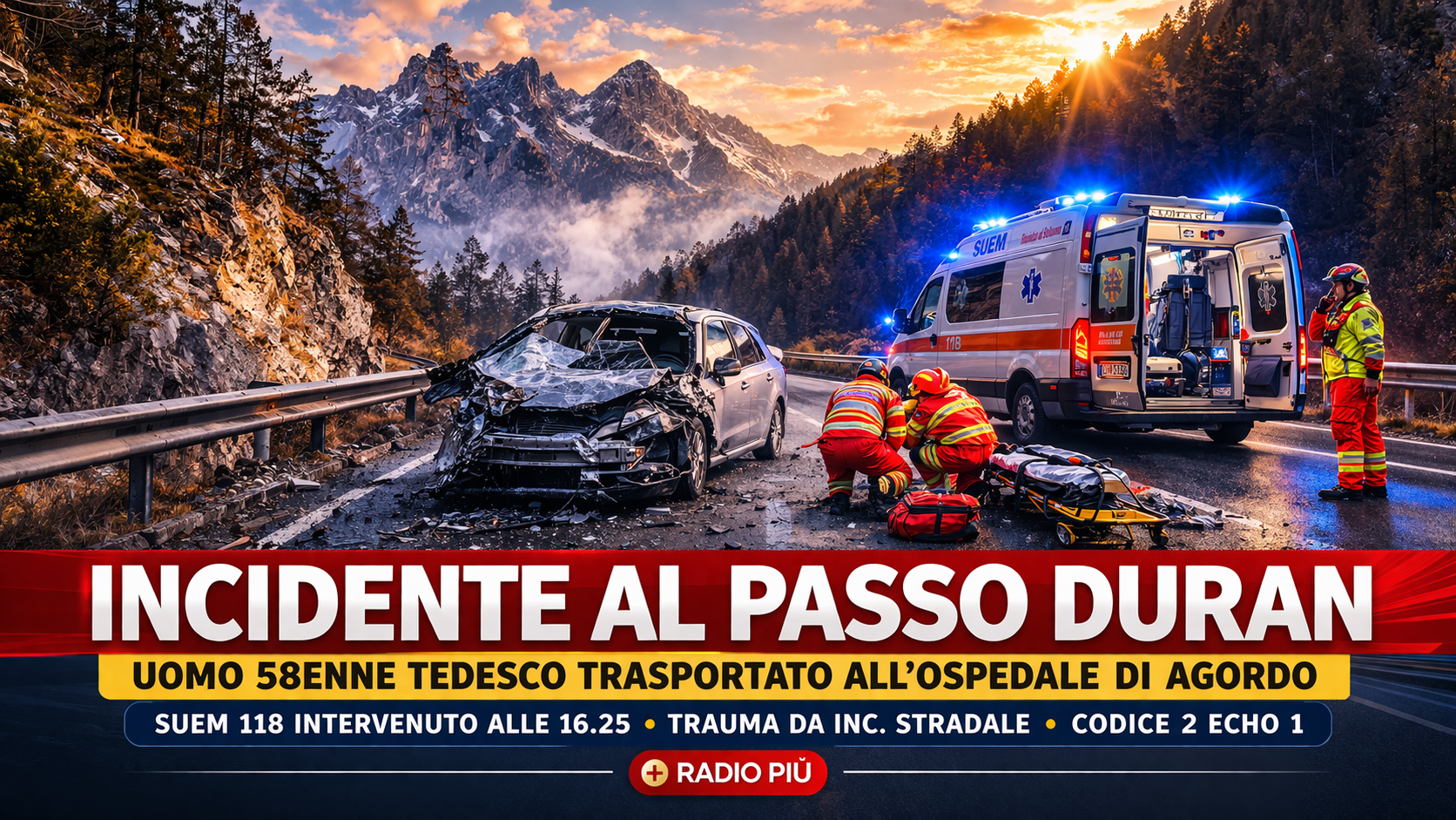 LA VALLE Ieri mattina il Suem non solo è intervenuto nella zona del Mulaz per la bonifica di una valanga fortunatamente senza coinvolti, nel pomeriggio, alle 16.25, altro importante intervento al Passo Duran per un incidente stradale che ha coinvolto un uomo di 58 anni di nazionalità tedesca. L’uomo ha riportato traumi di media gravità ed è stato trasportato all’ospedale di Agordo. Era a bordo di una moto che si è scontrata frontalmente con un mezzo pesante