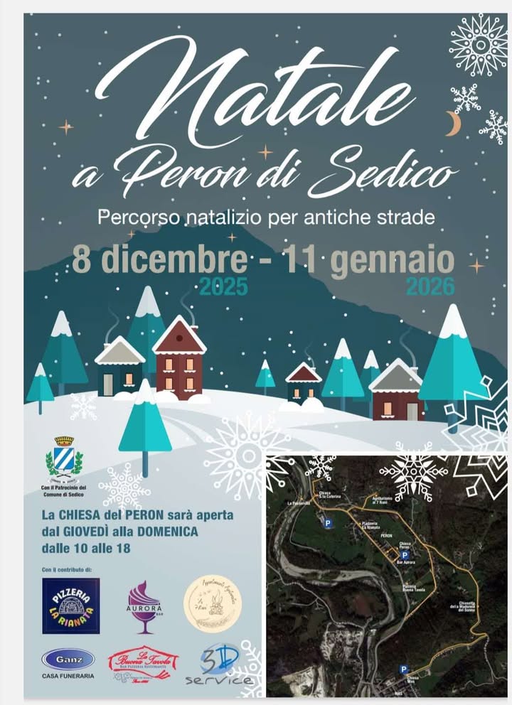 Peron di Sedico si prepara a vivere la magia del periodo natalizio con un’atmosfera tutta particolare: dal 8 dicembre 2025 all’11 gennaio 2026 il paese ospita Natale a Peron di Sedico – Percorso natalizio per antiche strade, un itinerario suggestivo che invita residenti e visitatori a scoprire il borgo attraverso luci, decorazioni e tappe dedicate alla tradizione. Un’iniziativa patrocinata dal Comune di Sedico e resa possibile grazie al contributo di diverse realtà locali, che hanno collaborato per donare al paese un progetto capace di valorizzare storia, comunità e spirito natalizio. La Chiesa del Perón, uno dei punti più significativi del percorso, sarà aperta al pubblico dal giovedì alla domenica, dalle 10 alle 18, per tutta la durata dell’evento. Il percorso si snoda tra vie storiche e punti panoramici, come mostrato nella mappa dell’iniziativa, offrendo un’occasione ideale per scoprire o riscoprire luoghi ricchi di fascino, immersi nella quiete invernale del territorio sedicense. Decorazioni, atmosfere luminose, presepi e scorci suggestivi accompagneranno i visitatori lungo la passeggiata, trasformando Peron in un piccolo villaggio natalizio diffuso. Un invito a vivere il Natale con lentezza, lasciandosi guidare dalla bellezza delle strade antiche e dall’accoglienza della comunità.
