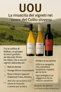 Tra le colline soleggiate di Solkan, un gruppo di amici guidato da Marinko Pintar ha deciso di ridare respiro a vecchi vigneti abbandonati. Così è nato UOU, un progetto che custodisce antiche varietà autoctone e le trasforma in vini autentici, realizzati con metodi naturali e tanta passione. Nei loro filari convivono Rebula, Merlot, Barbera, Refosco, Gamay e persino vigneti rarissimi. Il risultato? Vini intensi, vivi, che raccontano una storia di rinascita e amore per la terra. Da Dafrom e nei Dolomiti Beer & Wine Shop cerchiamo proprio questo: produttori veri, capaci di emozionare con ogni sorso. Ricorda: ogni persona è un buon bevitore.