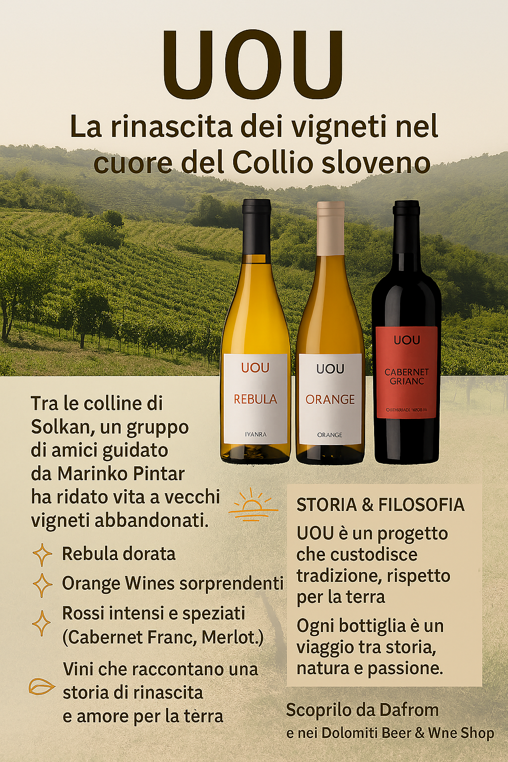 Tra le colline soleggiate di Solkan, un gruppo di amici guidato da Marinko Pintar ha deciso di ridare respiro a vecchi vigneti abbandonati. Così è nato UOU, un progetto che custodisce antiche varietà autoctone e le trasforma in vini autentici, realizzati con metodi naturali e tanta passione. Nei loro filari convivono Rebula, Merlot, Barbera, Refosco, Gamay e persino vigneti rarissimi. Il risultato? Vini intensi, vivi, che raccontano una storia di rinascita e amore per la terra. Da Dafrom e nei Dolomiti Beer & Wine Shop cerchiamo proprio questo: produttori veri, capaci di emozionare con ogni sorso. Ricorda: ogni persona è un buon bevitore.