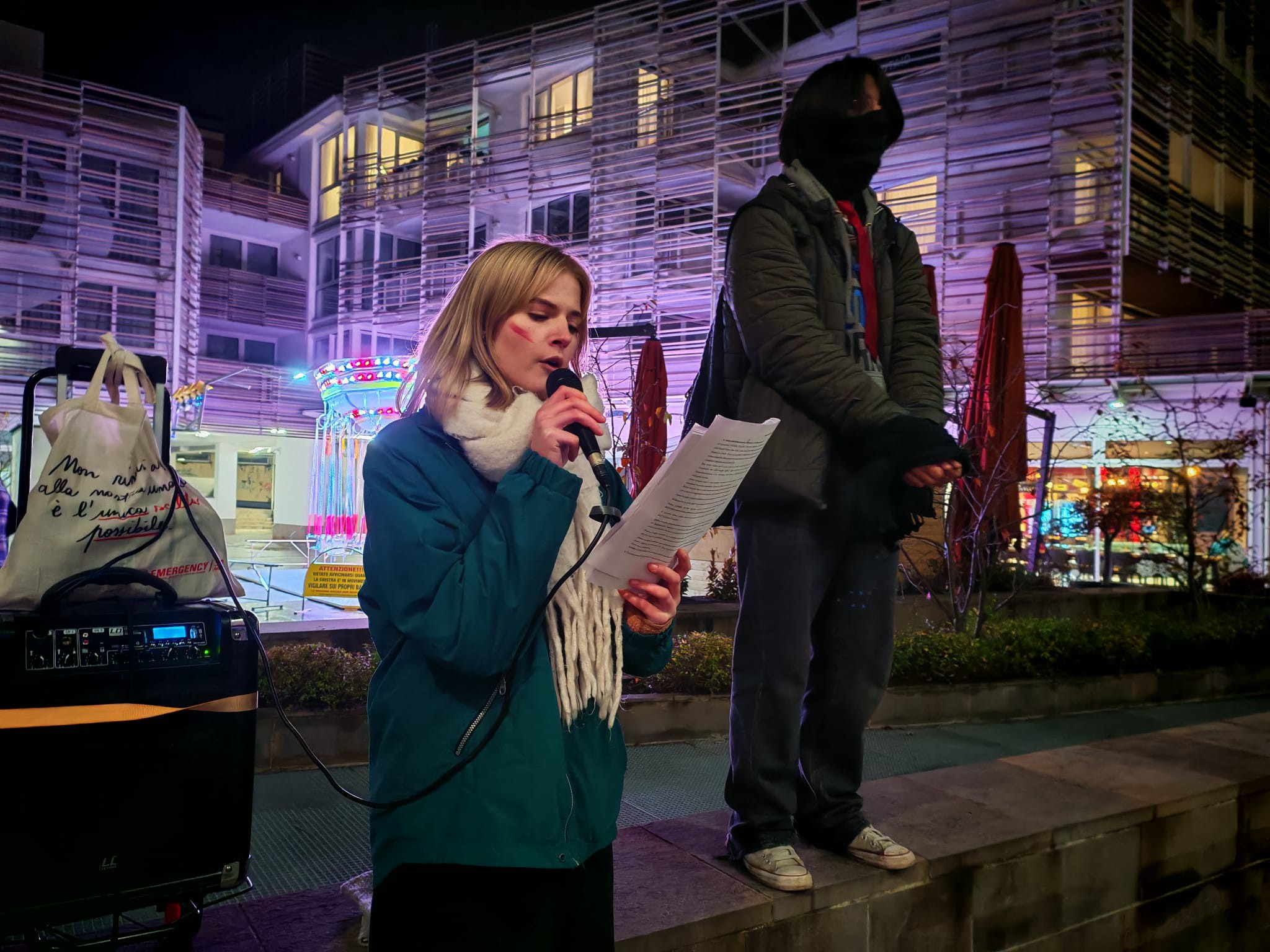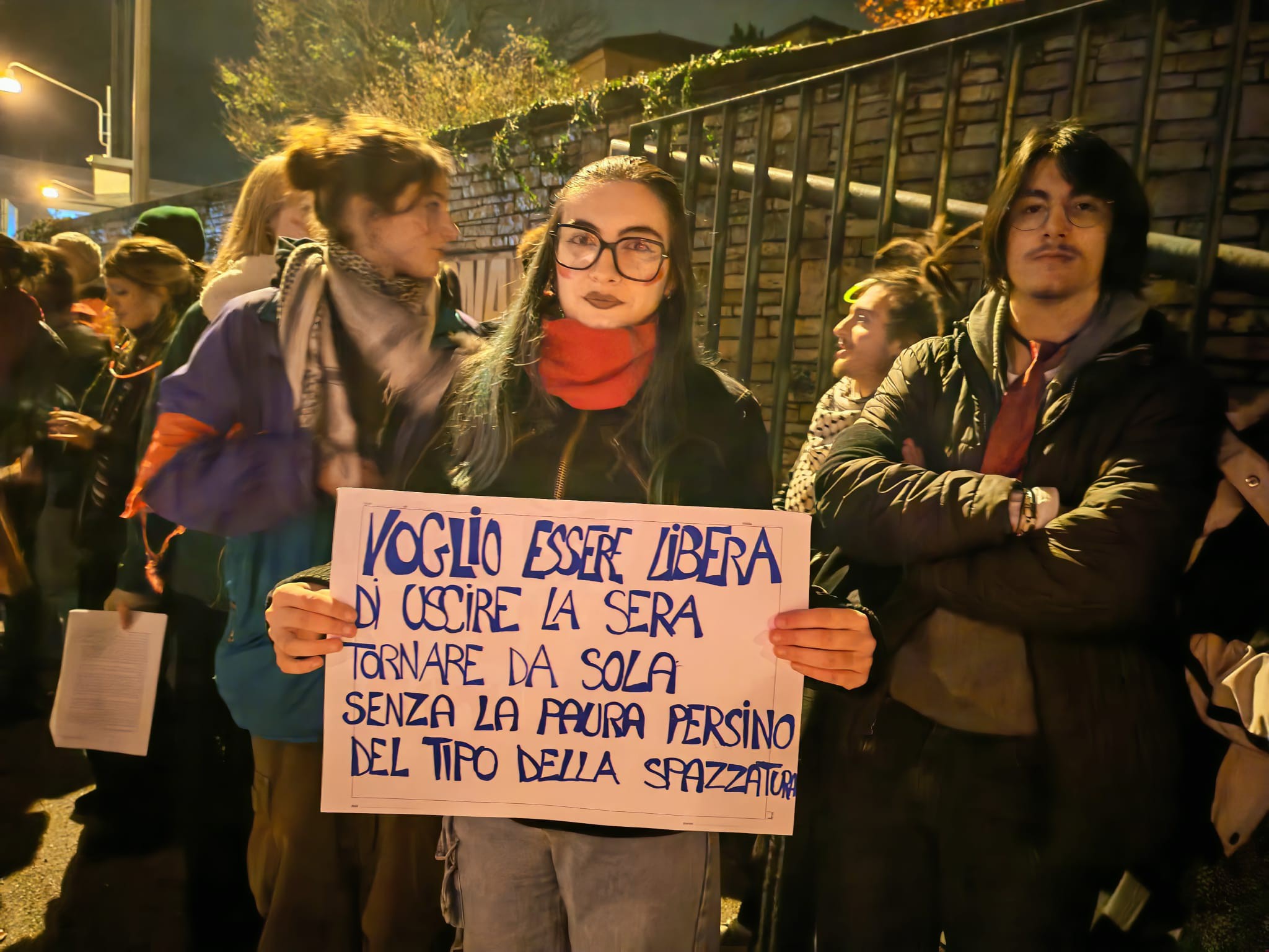 Nel corso dell’iniziativa, sono state rilanciate le parole di Non una di meno Belluno, che ha ricordato il significato della ricorrenza del 25 novembre – Giornata Internazionale per l’eliminazione della violenza maschile contro le donne: “Il 25 novembre è la Giornata Internazionale per l’eliminazione della violenza maschile contro le donne. Ad oggi, come ogni anno, il conto tragico delle morti è arrivato a 76 femminicidi, a cui vanno ad aggiungersi 6 suicidi indotti la cui causa accertata è la violenza di genere. È macabro, ed è solo, lo sappiamo e lo ripetiamo fino alla nausea, l’esito più palese e ineluttabile di un fenomeno enorme: quello della cultura della violenza che respiriamo tutti i giorni e del patriarcato da cui trae linfa e sostentamento.” Il collettivo ha spiegato come la mobilitazione nasca anche da dinamiche territoriali: Belluno, come ogni luogo, non è immune da episodi di violenza né da decisioni politiche che rischiano di riprodurre stereotipi. Richiamando, con tono critico, la recente decisione del Consiglio Comunale di Belluno di approvare l’idea di una statua dedicata alla maternità, il collettivo ha sottolineato: “Non è escludente, se non violento, celebrare la donna solo in quanto madre? Non sarebbe prioritario rendere la vita meno difficile a genitori e famiglie? […] Abbiamo deciso che la passeggiata (molto) arrabbiata della sera del 25 novembre era per noi il percorso in un museo. Abbiamo ‘esposto’, ma ben parlanti, le nostre statue alla violenza.” Durante il percorso, infatti, sono state installate simboliche “statue” che rappresentavano mancanze, diritti negati, istanze inascoltate, tutte realtà che, secondo il collettivo, richiedono interventi politici concreti e immediati. La passeggiata si è conclusa in un clima intenso e partecipato. Le voci del collettivo hanno ribadito il senso profondo di questa mobilitazione: “Sorellanza (che non riguarda solo le donne) è questo: accorgersi che la violenza che vivi riguarda anche me. Se me ne accorgo, se la vedo e ti vedo, allora forse possiamo uscirne. Accorgersene è l’inizio della cura.” Una serata forte, necessaria, che ha trasformato le strade di Belluno in un luogo di testimonianza, denuncia e solidarietà. Un richiamo potente a non voltarsi dall’altra parte, a continuare a lottare contro ogni forma di violenza e a immaginare una società più giusta, libera e sicura per tutte e tutti.