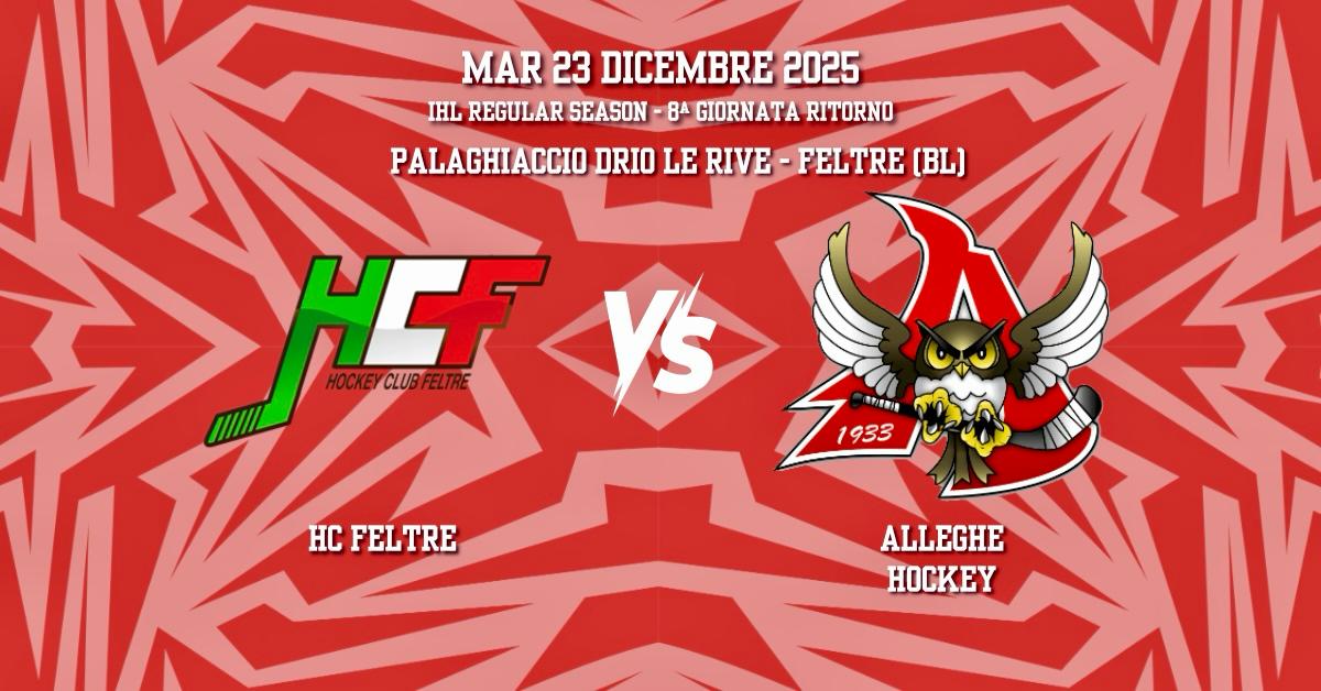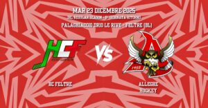HC FELTRE – ALLEGHE HOCKEY Martedì 23 Dicembre ore 20:30 PalaFeltre – Feltre (BL). Arbitri: Massimo De Col e Riccardo Pignatti con giudici di linea Giacomo Comunian e Fabio Zen. Collegamenti in DIRETTA RADIOFONICA su Radio Più (www.radiopiu.net) con “hockey al punto giusto”, in studio Marco Gaz e da Feltre interventi di Federico Paganin