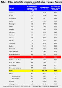 Secondo gli ultimi dati resi noti nei giorni scorsi dal Ministero dell’Economia e delle Finanze, nel 2022 l’evasione fiscale in Italia ammontava a 102,5 miliardi di euro. Grazie alla disponibilità dei dati relativi all’economia non osservata presente in ciascuna regione che sono rapportabili al valore aggiunto prodotto nella stessa, l’Ufficio studi della CGIA è riuscito a “redistribuire” territorialmente il mancato gettito potenziale. Ebbene, se calcoliamo la propensione all’evasione (vale a dire quanto evade la popolazione/imprese presenti in una determinata area geografica in rapporto alla ricchezza prodotta), in Calabria è al 20,9 per cento (3,1 miliardi di evasione), in Puglia al 18,9 per cento (6,8 miliardi di mancato gettito) e in Campania del 18,5 per cento (9,4 miliardi evasi). Le regioni meno coinvolte, invece, sono la Provincia Autonoma di Trento che presenta un tasso del 9,7, la Lombardia dell’8,8 e la Provincia Autonoma di Bolzano che registra l’incidenza più contenuta d’Italia, pari all’8,4. Il Veneto è al quintultimo posto a livello nazionale con una evasione del 10,3 per cento.