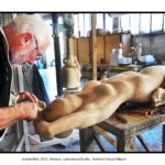 Le immagini di Elio Aricò raccontano non solo l’opera compiuta, ma anche il processo creativo: Fiabane colto nel gesto lento e concentrato dell’incisione, mentre definisce i volumi, leviga, approfondisce le ombre. È uno sguardo intimo dentro il laboratorio dell’artista, dove la scultura prende forma attraverso il rapporto fisico con il legno.