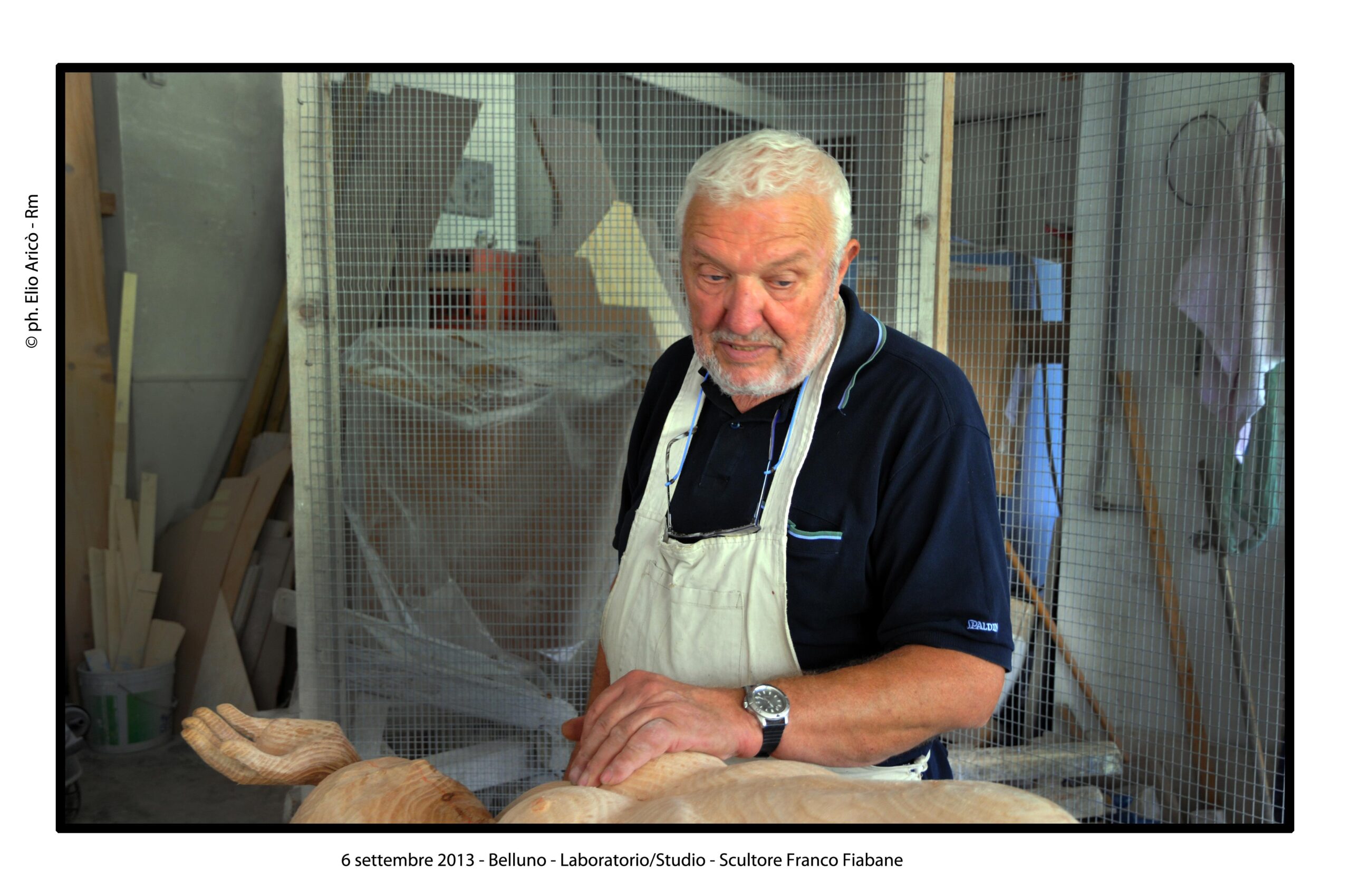 Nel suo laboratorio il tempo sembra rallentare, seguendo il ritmo paziente delle mani e del legno. Le immagini raccontano Franco Fiabane al lavoro nell’estate del 2011: uno scultore immerso nel dialogo silenzioso con la materia, circondato da trucioli, attrezzi e forme che nascono poco alla volta. Nel laboratorio si vedono opere in diverse fasi di lavorazione: grandi tronchi appena sbozzati, figure ancora incomplete, parti separate – braccia, busti, rilievi – che attendono di essere ricomposte o rifinite. Accanto alle sculture tridimensionali compaiono pannelli scolpiti a bassorilievo, scene narrative che richiamano il racconto popolare, la memoria collettiva, la vita quotidiana. È un mondo coerente, in cui il gesto artigianale si intreccia alla dimensione simbolica. Le fotografie di Elio Arico’ mostrano Fiabane concentrato, a volte sorridente, a volte assorto. Indossa il grembiule da lavoro, osserva l’opera da vicino, la tocca, la gira, come per verificarne l’equilibrio e l’anima. Il rapporto con il legno è fisico e diretto: martello e scalpello diventano strumenti di dialogo più che di forza, capaci di seguire le venature naturali del materiale e assecondarne le imperfezioni.