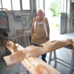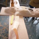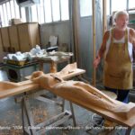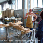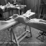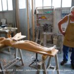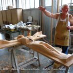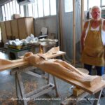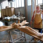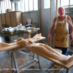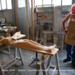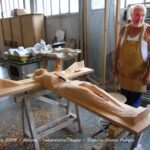 Il fotografo romano Elio Aricò ha inviato un nuovo prezioso contributo fotografico, riportando alla luce un momento intenso e profondamente umano vissuto nell’agosto del 2008. In quell’occasione, Elio e sua moglie Marcella visitarono l’atelier di Franco, maestro scultore capace di unire tecnica, sensibilità e una conoscenza anatomica fuori dal comune. Marcella – presente in alcune delle immagini – venne accolta dallo scultore con grande gentilezza. Franco si soffermò a spiegare le diverse tecniche che stava applicando al blocco “Saga familiare”, opera che già abbiamo avuto modo di commentare (vedi raccolta) e che rappresenta uno dei passaggi più significativi del suo percorso artistico. Non meno affascinante fu il momento dedicato al Cristo ligneo allora in lavorazione. Un’opera che, ricorda Elio, rivelava come pochi la capacità dello scultore di leggere il corpo umano, di comprenderne tensioni, pesi, dolori. Ed è proprio questa padronanza dell’anatomia a dare alla figura del Cristo in Croce quella forza drammatica che non è semplice rappresentazione, ma esperienza emotiva: la sofferenza dell’uomo che teme di essere abbandonato dal suo Dio. Elio Aricò, nel suo messaggio, accompagna le fotografie con un pensiero carico di stima e gratitudine, definendo quell’incontro una testimonianza viva della grandezza umana e artistica di Franco.