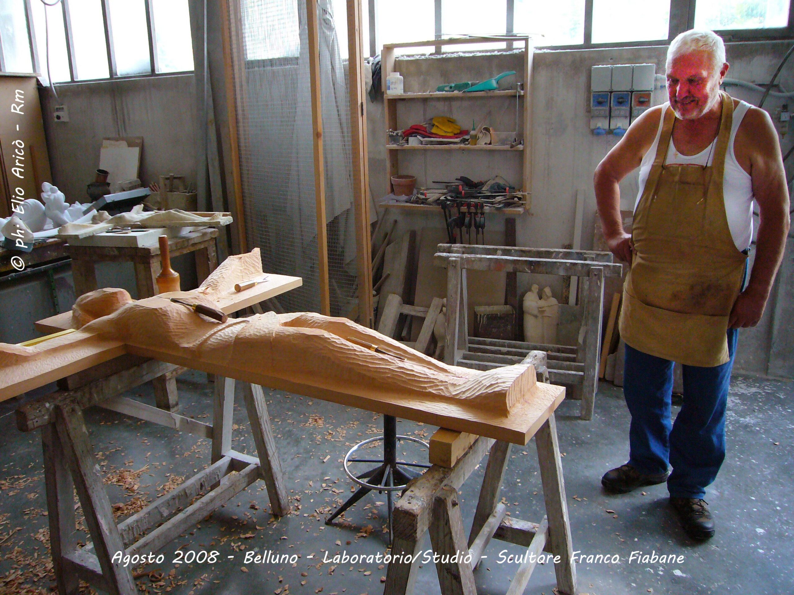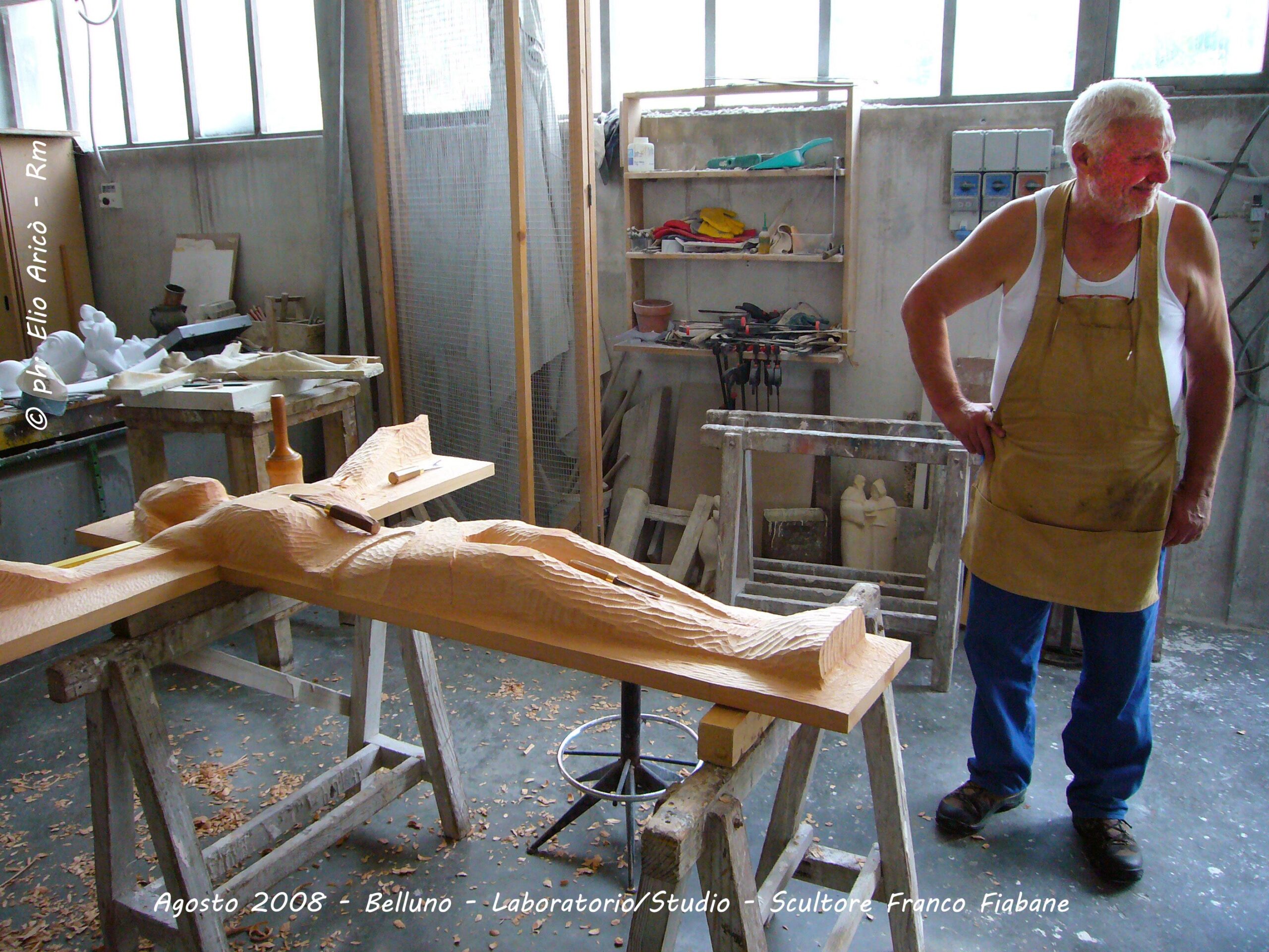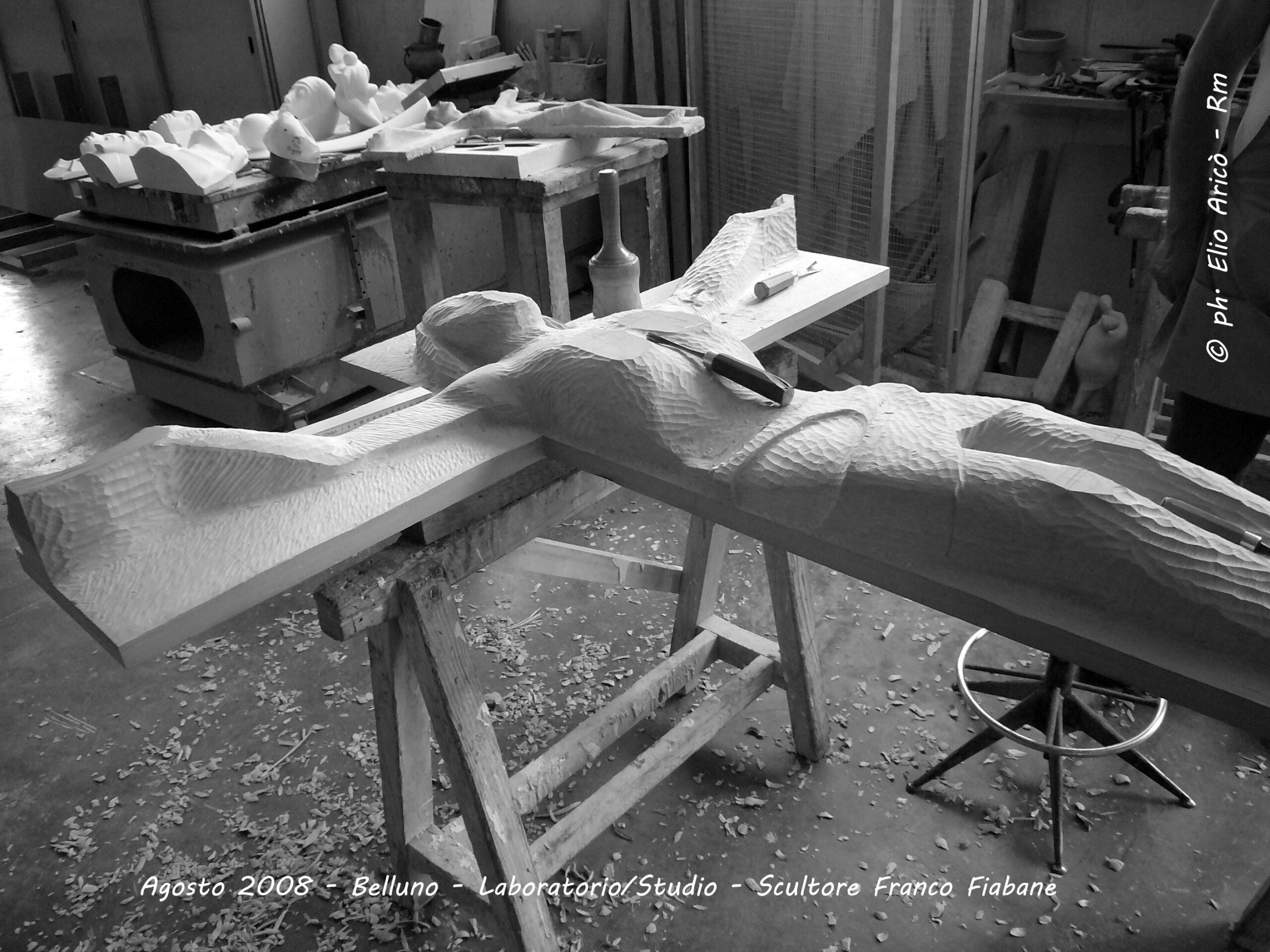 Il fotografo romano Elio Aricò ha inviato un nuovo prezioso contributo fotografico, riportando alla luce un momento intenso e profondamente umano vissuto nell’agosto del 2008. In quell’occasione, Elio e sua moglie Marcella visitarono l’atelier di Franco, maestro scultore capace di unire tecnica, sensibilità e una conoscenza anatomica fuori dal comune. Marcella – presente in alcune delle immagini – venne accolta dallo scultore con grande gentilezza. Franco si soffermò a spiegare le diverse tecniche che stava applicando al blocco “Saga familiare”, opera che già abbiamo avuto modo di commentare (vedi raccolta) e che rappresenta uno dei passaggi più significativi del suo percorso artistico. Non meno affascinante fu il momento dedicato al Cristo ligneo allora in lavorazione. Un’opera che, ricorda Elio, rivelava come pochi la capacità dello scultore di leggere il corpo umano, di comprenderne tensioni, pesi, dolori. Ed è proprio questa padronanza dell’anatomia a dare alla figura del Cristo in Croce quella forza drammatica che non è semplice rappresentazione, ma esperienza emotiva: la sofferenza dell’uomo che teme di essere abbandonato dal suo Dio. Elio Aricò, nel suo messaggio, accompagna le fotografie con un pensiero carico di stima e gratitudine, definendo quell’incontro una testimonianza viva della grandezza umana e artistica di Franco.