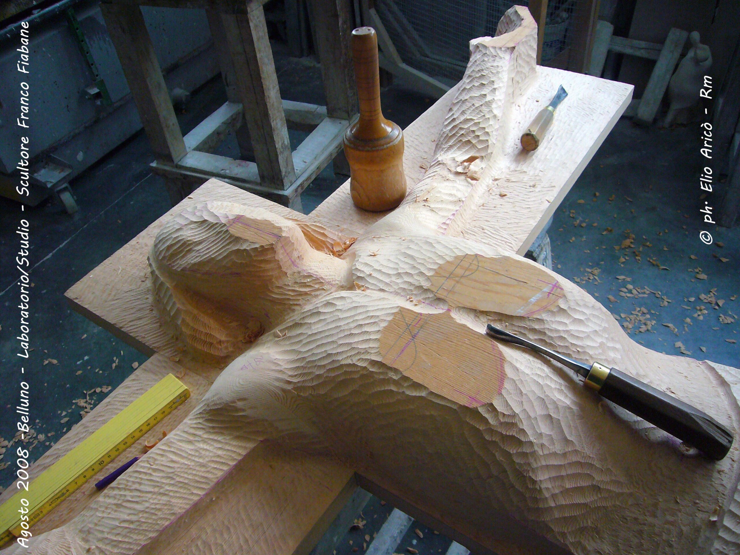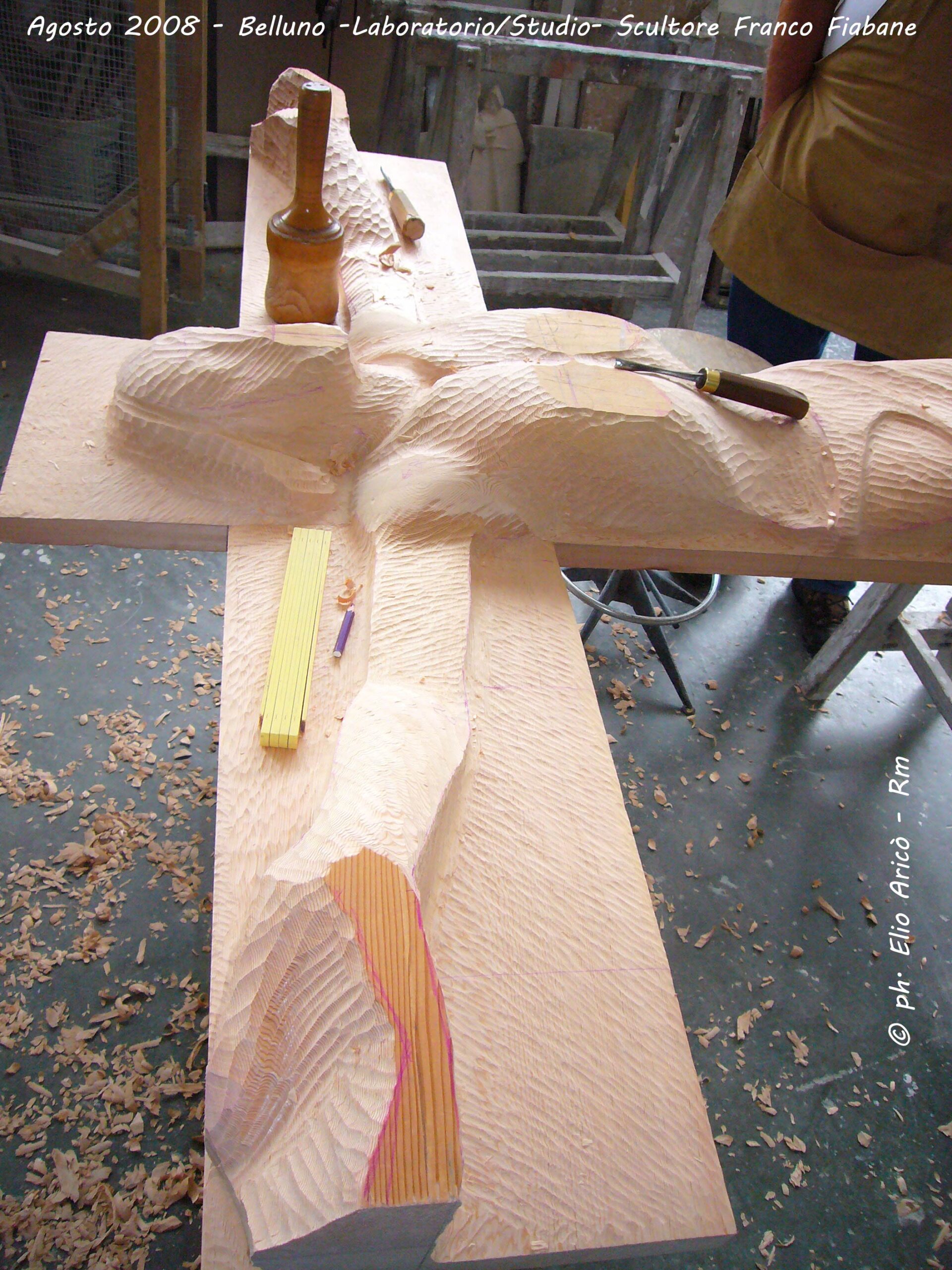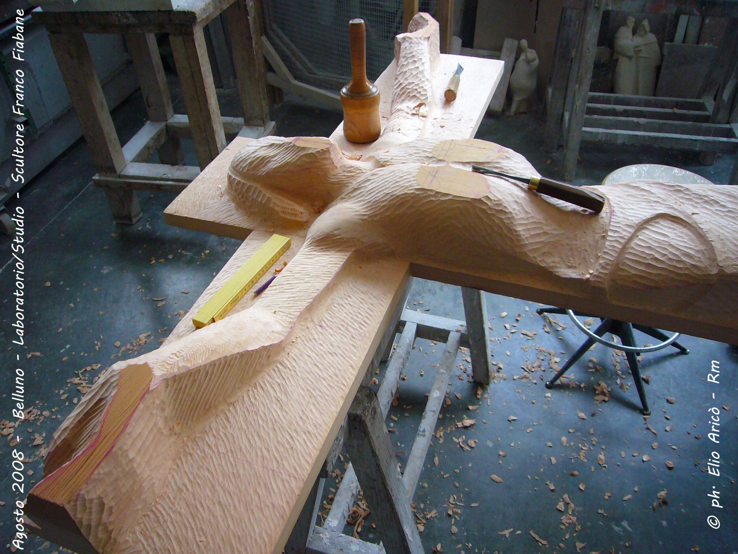 Il fotografo romano Elio Aricò ha inviato un nuovo prezioso contributo fotografico, riportando alla luce un momento intenso e profondamente umano vissuto nell’agosto del 2008. In quell’occasione, Elio e sua moglie Marcella visitarono l’atelier di Franco, maestro scultore capace di unire tecnica, sensibilità e una conoscenza anatomica fuori dal comune. Marcella – presente in alcune delle immagini – venne accolta dallo scultore con grande gentilezza. Franco si soffermò a spiegare le diverse tecniche che stava applicando al blocco “Saga familiare”, opera che già abbiamo avuto modo di commentare (vedi raccolta) e che rappresenta uno dei passaggi più significativi del suo percorso artistico. Non meno affascinante fu il momento dedicato al Cristo ligneo allora in lavorazione. Un’opera che, ricorda Elio, rivelava come pochi la capacità dello scultore di leggere il corpo umano, di comprenderne tensioni, pesi, dolori. Ed è proprio questa padronanza dell’anatomia a dare alla figura del Cristo in Croce quella forza drammatica che non è semplice rappresentazione, ma esperienza emotiva: la sofferenza dell’uomo che teme di essere abbandonato dal suo Dio. Elio Aricò, nel suo messaggio, accompagna le fotografie con un pensiero carico di stima e gratitudine, definendo quell’incontro una testimonianza viva della grandezza umana e artistica di Franco.