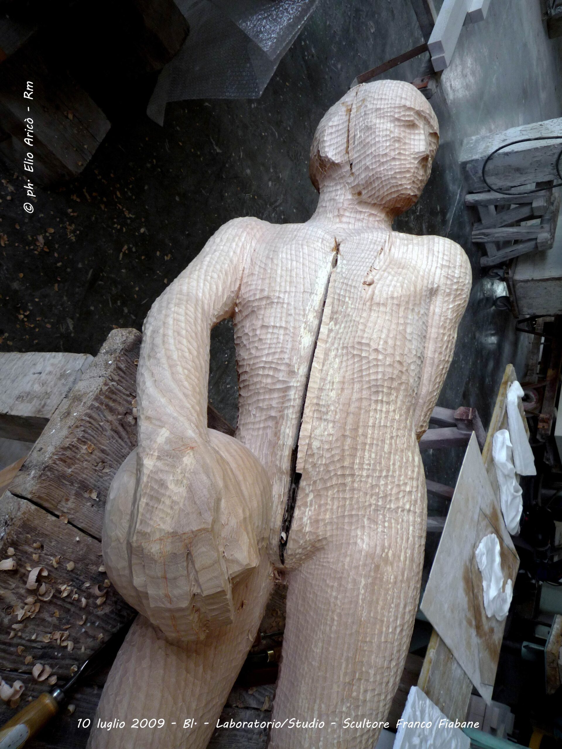 Il fotografo romano Elio Aricò ha inviato un nuovo prezioso contributo fotografico, riportando alla luce un momento intenso e profondamente umano vissuto nell’agosto del 2008. In quell’occasione, Elio e sua moglie Marcella visitarono l’atelier di Franco, maestro scultore capace di unire tecnica, sensibilità e una conoscenza anatomica fuori dal comune. Marcella – presente in alcune delle immagini – venne accolta dallo scultore con grande gentilezza. Franco si soffermò a spiegare le diverse tecniche che stava applicando al blocco “Saga familiare”, opera che già abbiamo avuto modo di commentare (vedi raccolta) e che rappresenta uno dei passaggi più significativi del suo percorso artistico. Non meno affascinante fu il momento dedicato al Cristo ligneo allora in lavorazione. Un’opera che, ricorda Elio, rivelava come pochi la capacità dello scultore di leggere il corpo umano, di comprenderne tensioni, pesi, dolori. Ed è proprio questa padronanza dell’anatomia a dare alla figura del Cristo in Croce quella forza drammatica che non è semplice rappresentazione, ma esperienza emotiva: la sofferenza dell’uomo che teme di essere abbandonato dal suo Dio. Elio Aricò, nel suo messaggio, accompagna le fotografie con un pensiero carico di stima e gratitudine, definendo quell’incontro una testimonianza viva della grandezza umana e artistica di Franco.