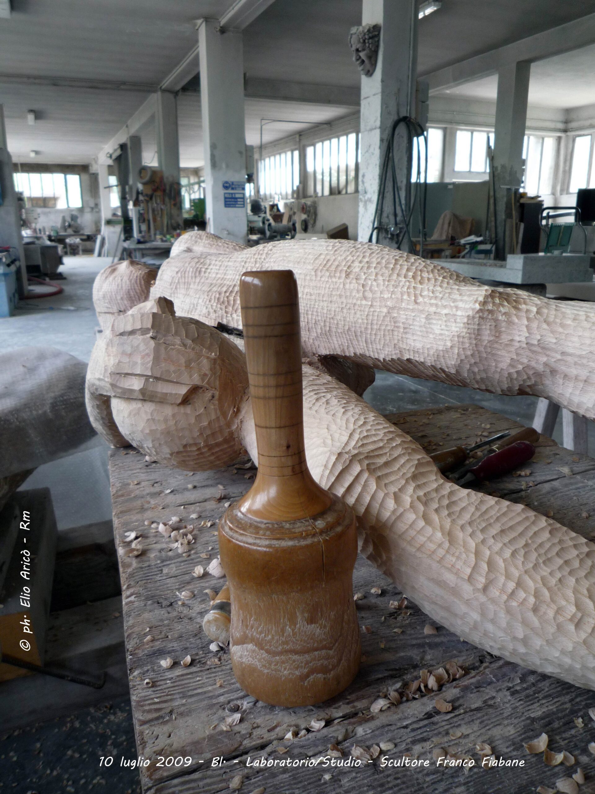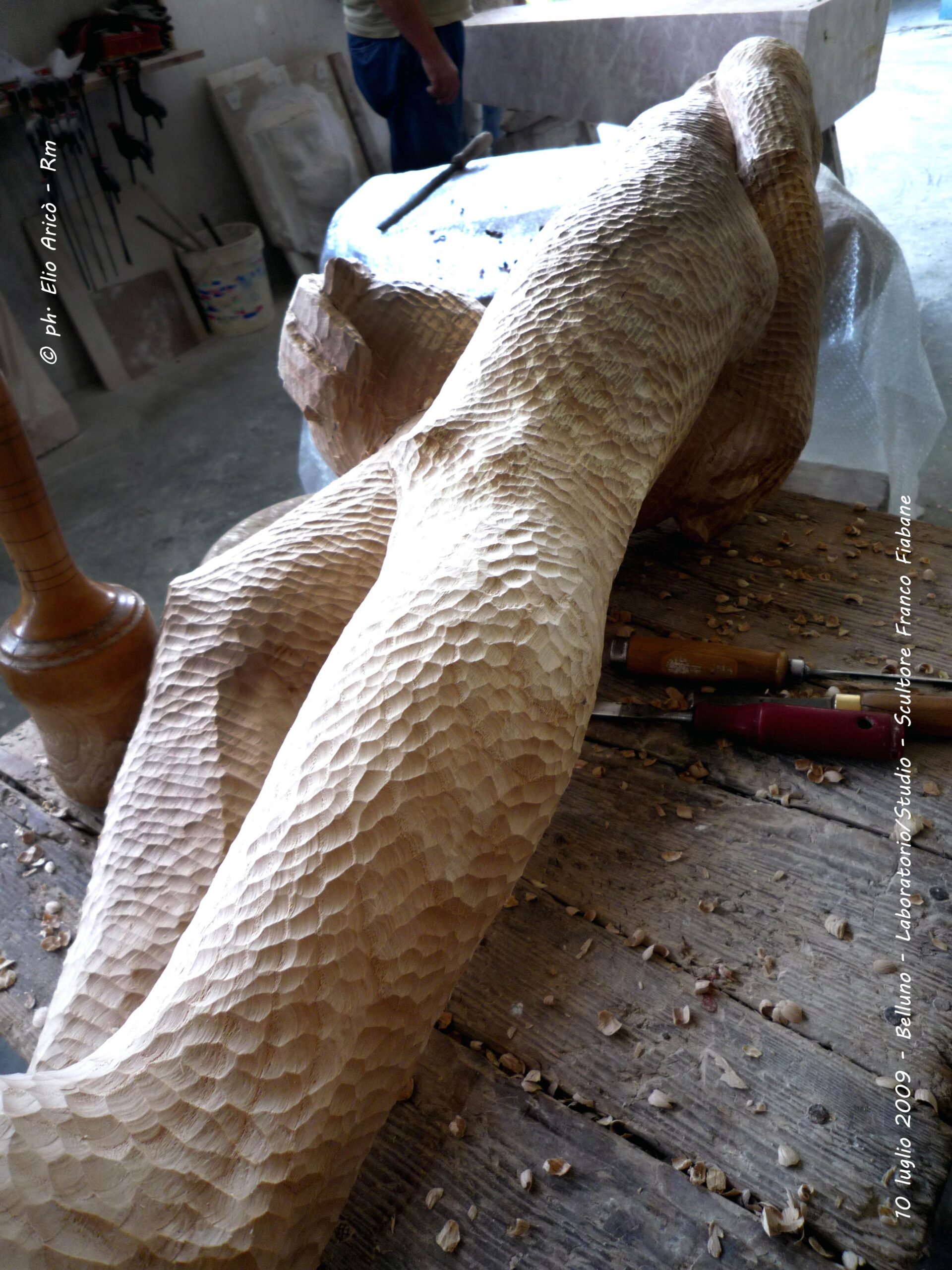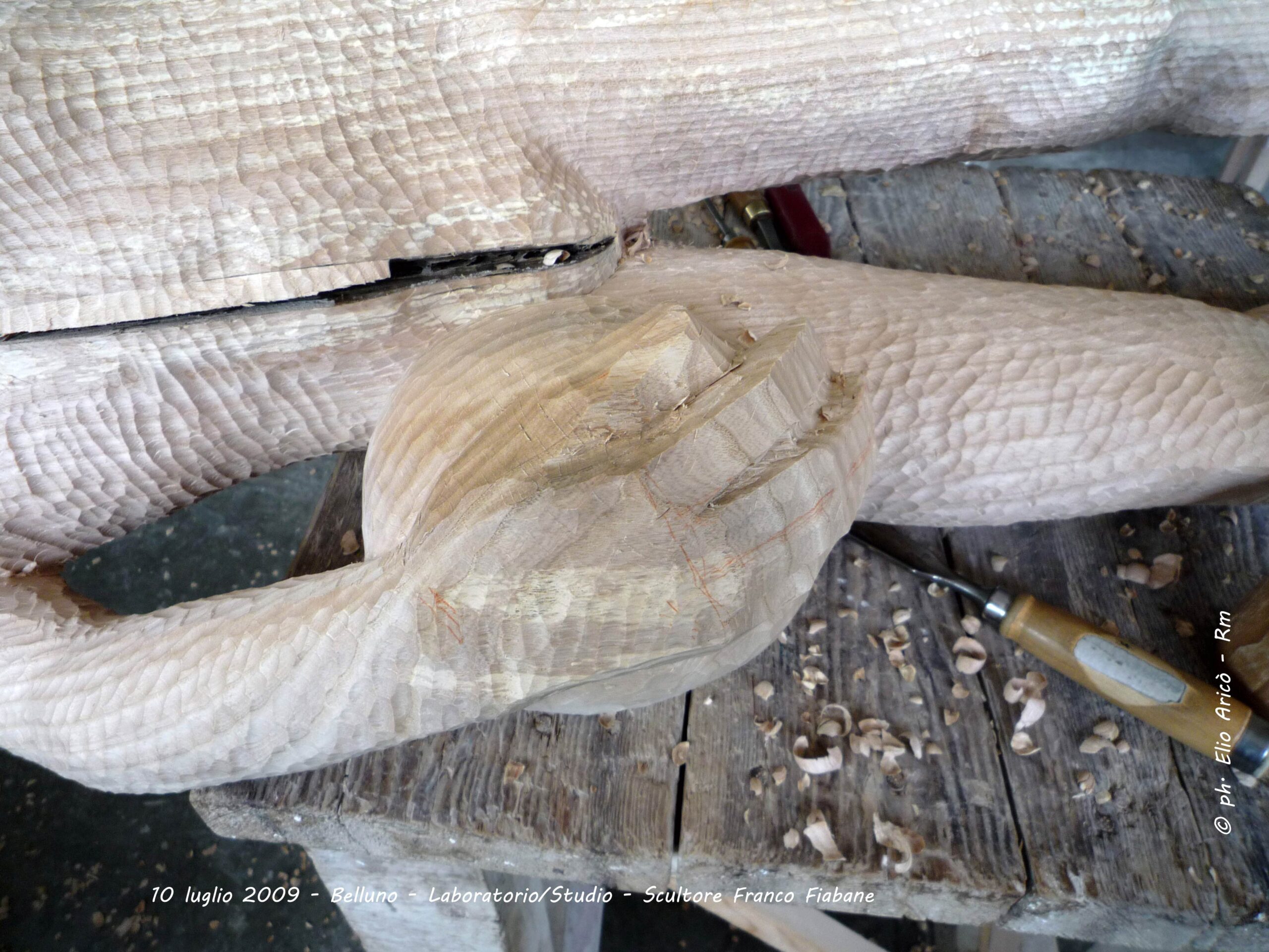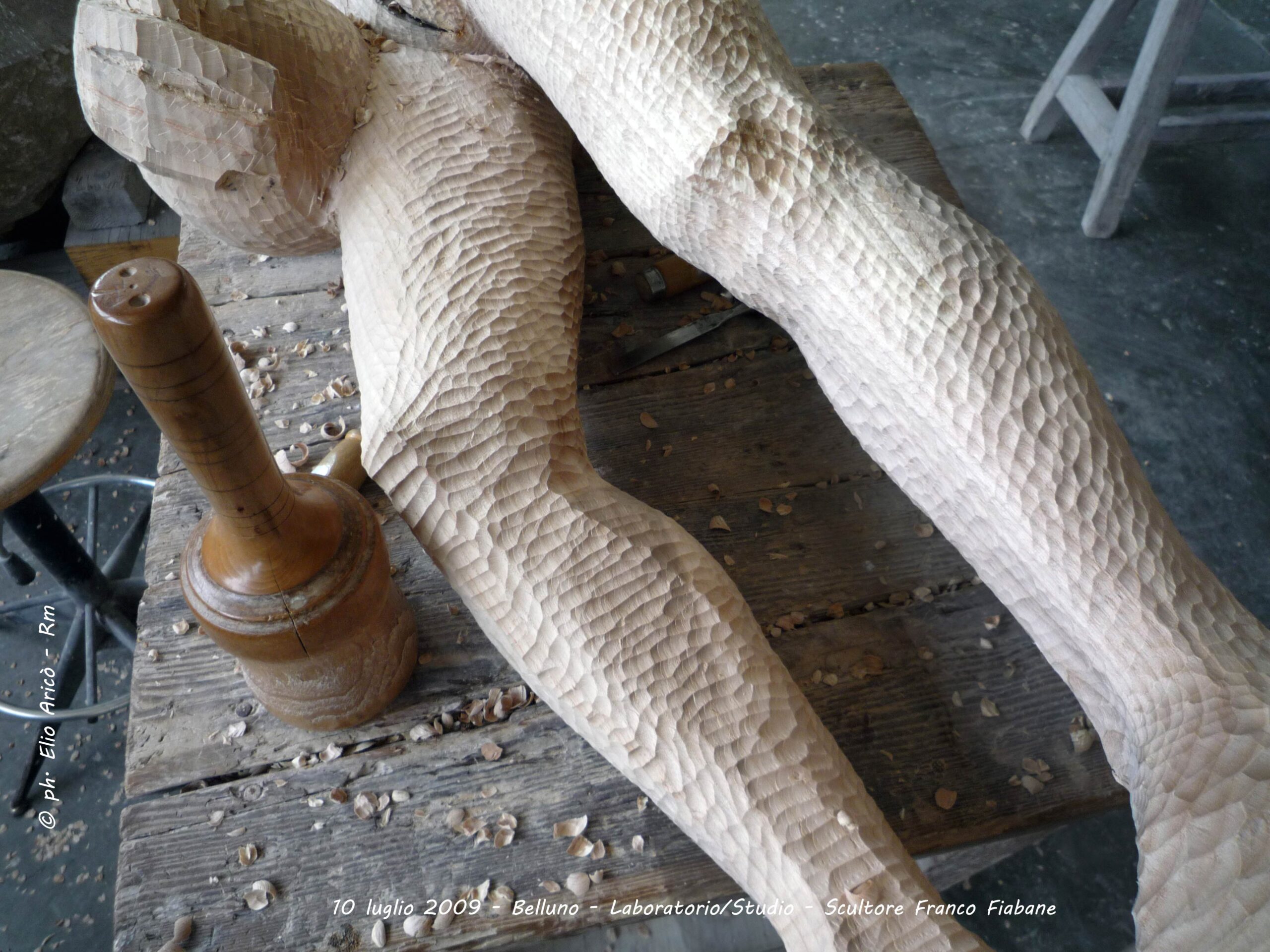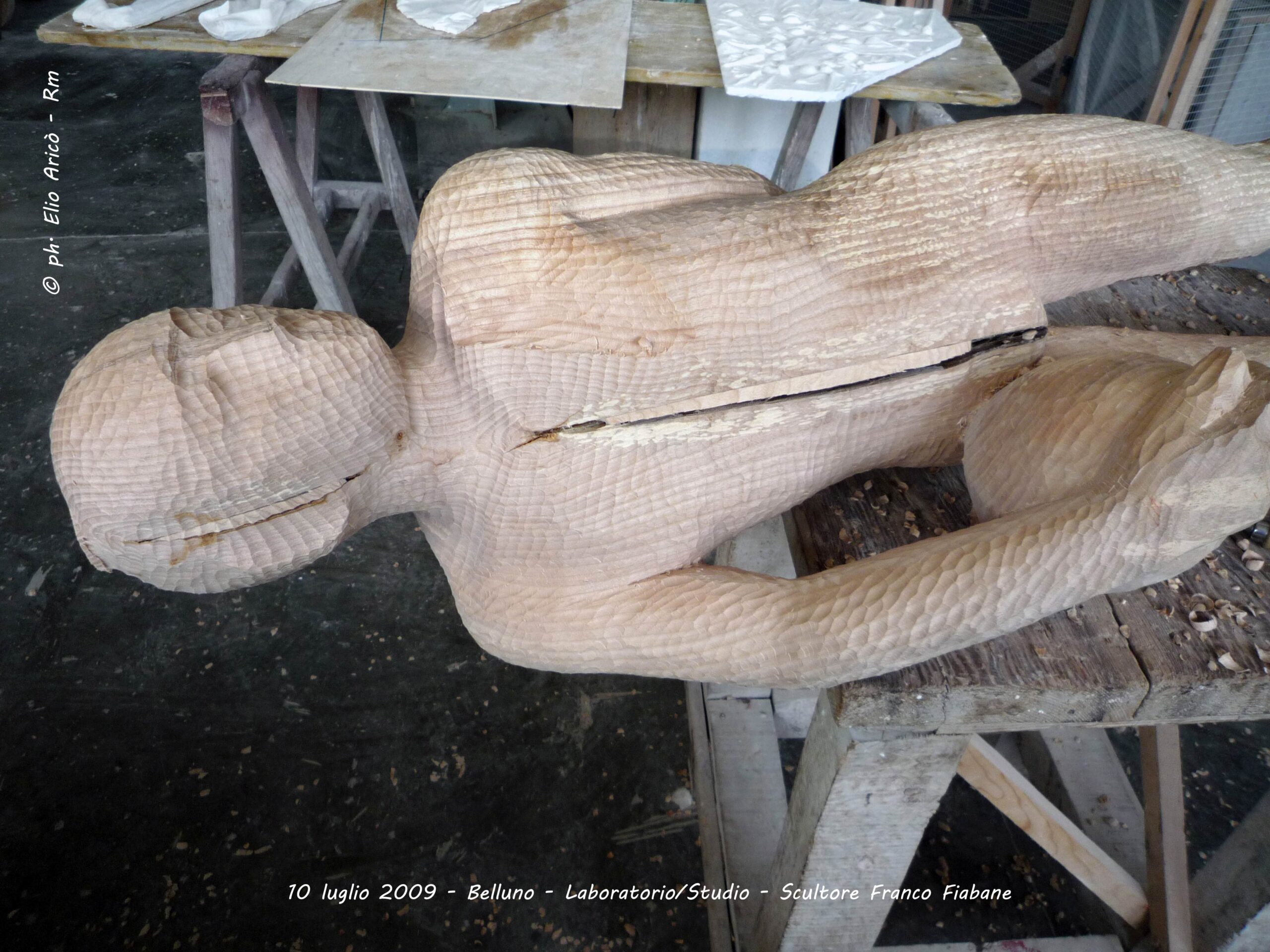 Il fotografo romano Elio Aricò apre il suo archivio e condivide con i lettori di Radiopiù un prezioso ricordo dell’artista bellunese Franco Fiabane. Un racconto per immagini e memoria che risale all’estate del 2009, quando Aricò seguì passo dopo passo la nascita della scultura lignea Il pallanuotista, documentandone l’intero processo creativo dal 10 luglio al 24 agosto. «Al primo impatto – racconta il fotografo – mi sono trovato di fronte a una figura classica, che richiamava gli atleti scolpiti nel marmo negli anni Trenta al Foro Italico». Un’impressione immediata di forza, equilibrio e bellezza che lo spinse a osservare e immortalare ogni gesto dell’artista. A una visione superficiale, le immagini possono sembrare simili tra loro. Ma è l’occhio attento a cogliere ciò che Aricò definisce «un vero manuale di tecnica scultorea»: il mazzuolo e lo scalpello che, nelle mani esperte di Fiabane, trasformano: la materia che si apre, si assottiglia, prende vita. Giorno dopo giorno la figura del pallanuotista diventava sempre più espressiva, rivelando una sorprendente armonia tra muscoli, ossa e venature naturali del legno. «La scultura, pur non essendo ancora definitiva, si faceva sempre più realistica ed esteticamente coinvolgente», ricorda Aricò. L’ultimo scatto è una piccola opera nell’opera: una composizione naturale di trucioli, residui della lavorazione, che chiude idealmente il percorso creativo.