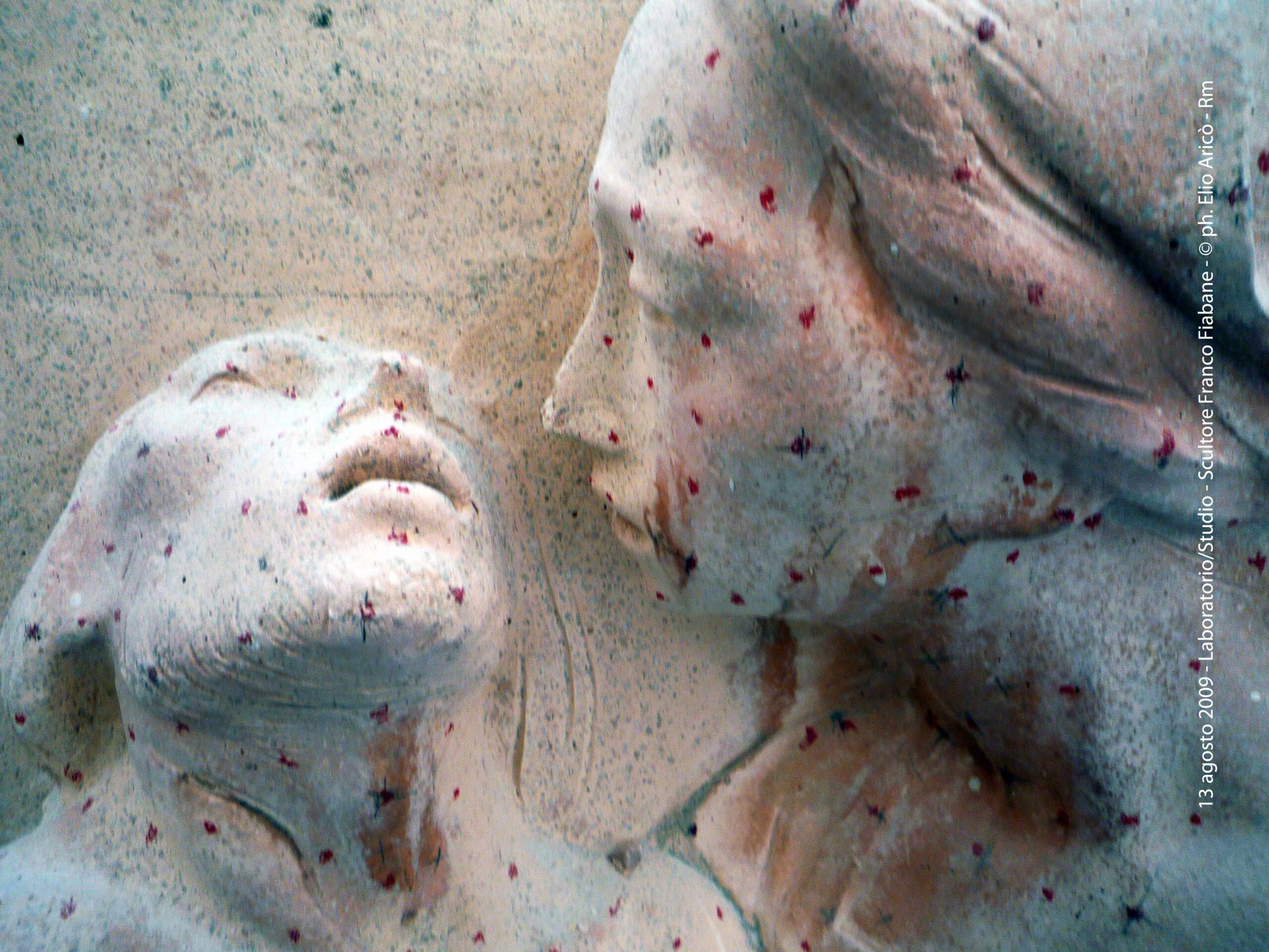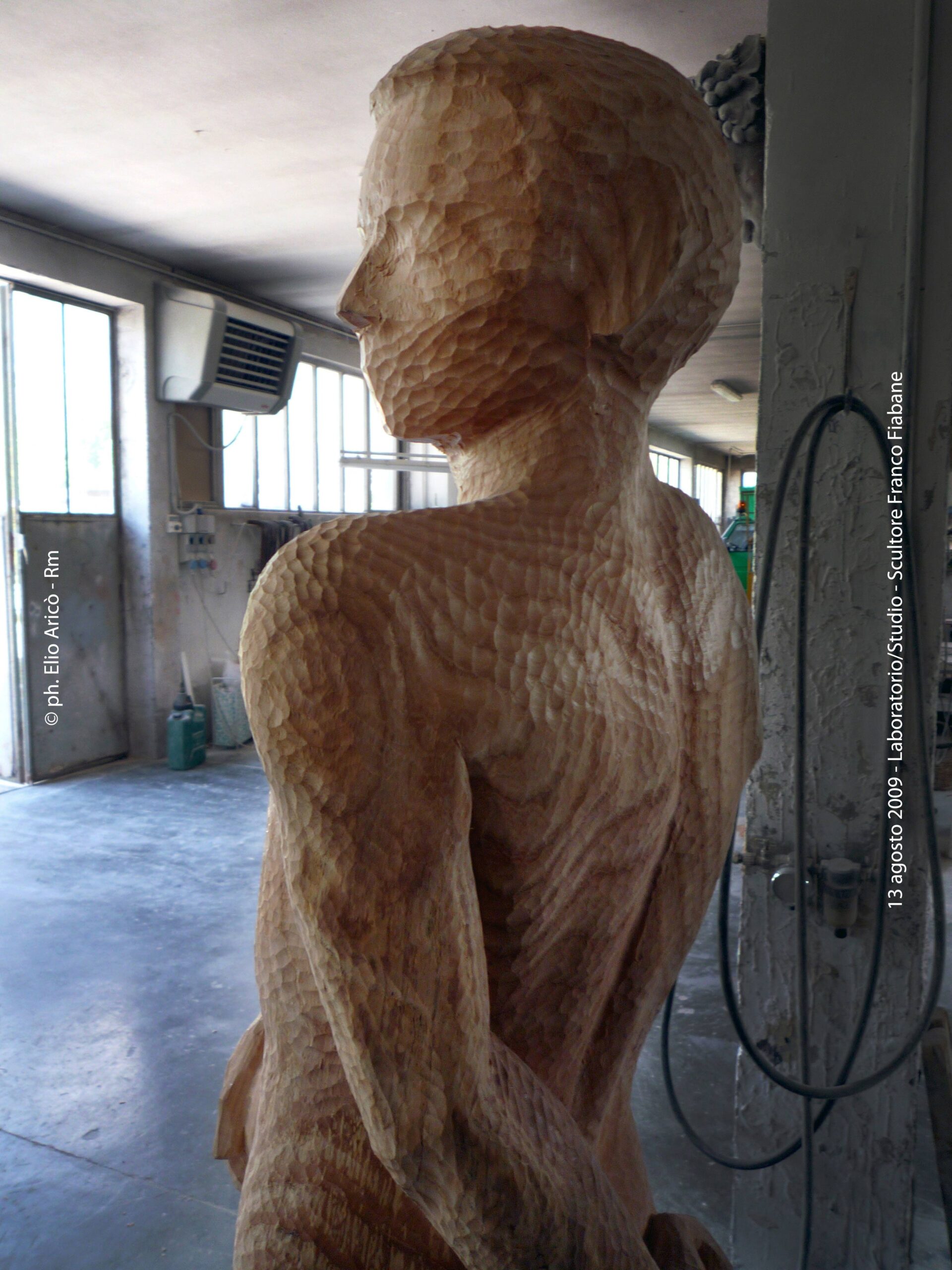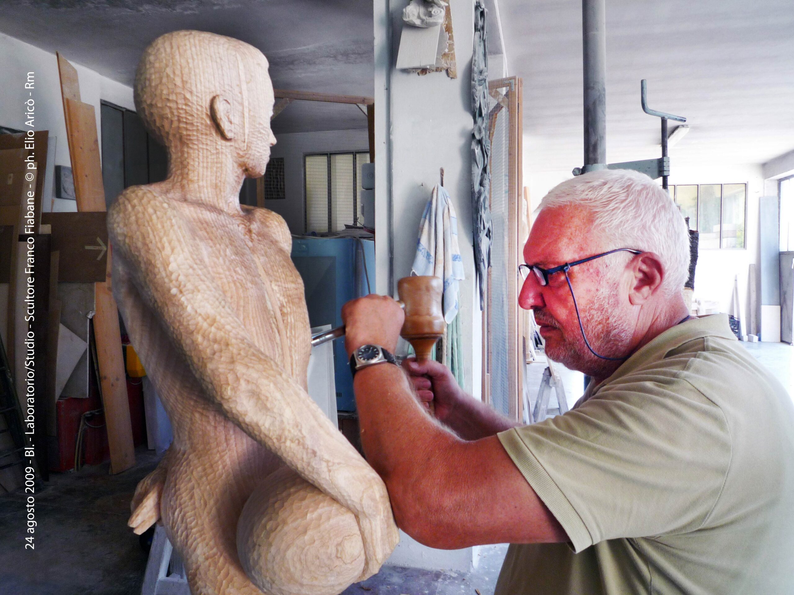 Il fotografo romano Elio Aricò ha inviato un nuovo prezioso contributo fotografico, riportando alla luce un momento intenso e profondamente umano vissuto nell’agosto del 2008. In quell’occasione, Elio e sua moglie Marcella visitarono l’atelier di Franco, maestro scultore capace di unire tecnica, sensibilità e una conoscenza anatomica fuori dal comune. Marcella – presente in alcune delle immagini – venne accolta dallo scultore con grande gentilezza. Franco si soffermò a spiegare le diverse tecniche che stava applicando al blocco “Saga familiare”, opera che già abbiamo avuto modo di commentare (vedi raccolta) e che rappresenta uno dei passaggi più significativi del suo percorso artistico. Non meno affascinante fu il momento dedicato al Cristo ligneo allora in lavorazione. Un’opera che, ricorda Elio, rivelava come pochi la capacità dello scultore di leggere il corpo umano, di comprenderne tensioni, pesi, dolori. Ed è proprio questa padronanza dell’anatomia a dare alla figura del Cristo in Croce quella forza drammatica che non è semplice rappresentazione, ma esperienza emotiva: la sofferenza dell’uomo che teme di essere abbandonato dal suo Dio. Elio Aricò, nel suo messaggio, accompagna le fotografie con un pensiero carico di stima e gratitudine, definendo quell’incontro una testimonianza viva della grandezza umana e artistica di Franco.