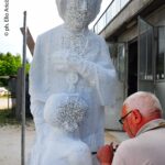 Il fotografo romano Elio Aricò ha inviato un nuovo prezioso contributo fotografico, riportando alla luce un momento intenso e profondamente umano vissuto nell’agosto del 2008. In quell’occasione, Elio e sua moglie Marcella visitarono l’atelier di Franco, maestro scultore capace di unire tecnica, sensibilità e una conoscenza anatomica fuori dal comune. Marcella – presente in alcune delle immagini – venne accolta dallo scultore con grande gentilezza. Franco si soffermò a spiegare le diverse tecniche che stava applicando al blocco “Saga familiare”, opera che già abbiamo avuto modo di commentare (vedi raccolta) e che rappresenta uno dei passaggi più significativi del suo percorso artistico. Non meno affascinante fu il momento dedicato al Cristo ligneo allora in lavorazione. Un’opera che, ricorda Elio, rivelava come pochi la capacità dello scultore di leggere il corpo umano, di comprenderne tensioni, pesi, dolori. Ed è proprio questa padronanza dell’anatomia a dare alla figura del Cristo in Croce quella forza drammatica che non è semplice rappresentazione, ma esperienza emotiva: la sofferenza dell’uomo che teme di essere abbandonato dal suo Dio. Elio Aricò, nel suo messaggio, accompagna le fotografie con un pensiero carico di stima e gratitudine, definendo quell’incontro una testimonianza viva della grandezza umana e artistica di Franco.