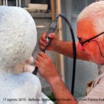 Il fotografo romano Elio Aricò apre il suo archivio e condivide con i lettori di Radiopiù un prezioso ricordo dell’artista bellunese Franco Fiabane. Un racconto per immagini e memoria che risale all’estate del 2009, quando Aricò seguì passo dopo passo la nascita della scultura lignea Il pallanuotista, documentandone l’intero processo creativo dal 10 luglio al 24 agosto. «Al primo impatto – racconta il fotografo – mi sono trovato di fronte a una figura classica, che richiamava gli atleti scolpiti nel marmo negli anni Trenta al Foro Italico». Un’impressione immediata di forza, equilibrio e bellezza che lo spinse a osservare e immortalare ogni gesto dell’artista. A una visione superficiale, le immagini possono sembrare simili tra loro. Ma è l’occhio attento a cogliere ciò che Aricò definisce «un vero manuale di tecnica scultorea»: il mazzuolo e lo scalpello che, nelle mani esperte di Fiabane, trasformano: la materia che si apre, si assottiglia, prende vita. Giorno dopo giorno la figura del pallanuotista diventava sempre più espressiva, rivelando una sorprendente armonia tra muscoli, ossa e venature naturali del legno. «La scultura, pur non essendo ancora definitiva, si faceva sempre più realistica ed esteticamente coinvolgente», ricorda Aricò. L’ultimo scatto è una piccola opera nell’opera: una composizione naturale di trucioli, residui della lavorazione, che chiude idealmente il percorso creativo.