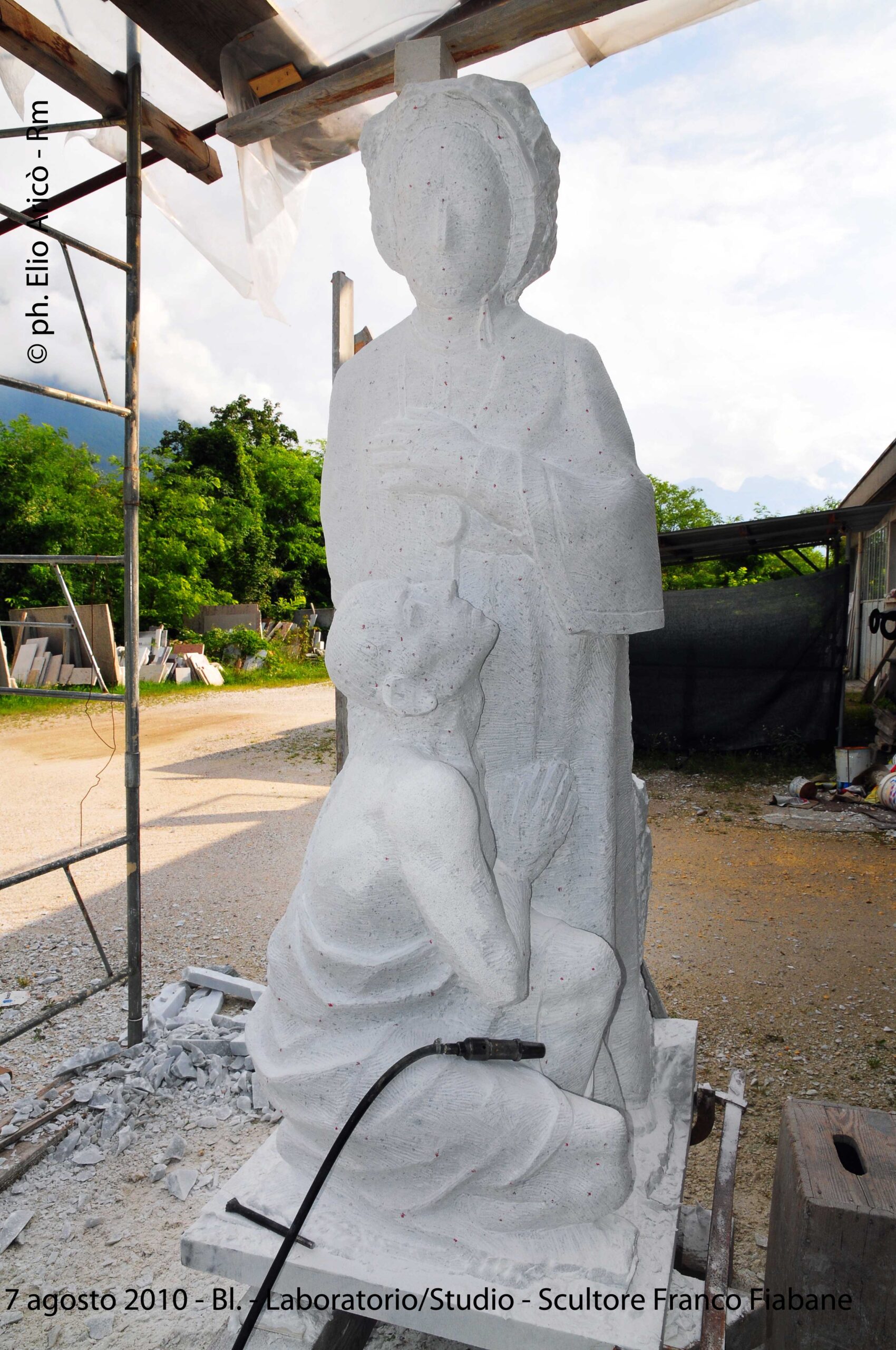 Un dialogo tra arte, memoria e verità emerge dalle fotografie realizzate dal fotografo romano Elio Aricò, dedicate al trittico in marmo di Carrara dello scultore Franco Fiabane, installato nel Cimitero monumentale di Fortogna, frazione di Longarone. L’opera, dedicata alle vittime del Vajont, è una delle più intense testimonianze artistiche della tragedia, scolpita con rigore e devozione da Fiabane, artista-artigiano di rara sensibilità. Fu lo stesso Franco Fiabane, il 24 agosto 2005, ad accompagnare Elio Aricò a Fortogna per mostrargli il monumento completato, dopo che il fotografo lo aveva visto in lavorazione l’anno precedente (vedi raccolta di foto seguenti_2004). Quelle immagini, oltre a documentare con eleganza la potenza del marmo e la profondità del messaggio, assunsero presto un valore speciale per l’artista: “Mi era molto riconoscenti — ricorda Aricò — perché, a suo dire, le fotografie servivano a tacitare le malelingue che cercavano di sminuire il suo lavoro insinuando l’uso del pantografo, la più grave offesa per un vero scultore”. Così, attraverso l’obiettivo di Aricò, il trittico di Fortogna si rivela non solo come monumento alla memoria del Vajont, ma anche come testimonianza di autenticità e orgoglio artigiano, un tributo al valore del fare manuale e alla dedizione di chi, nel marmo, scolpisce anche la propria verità.