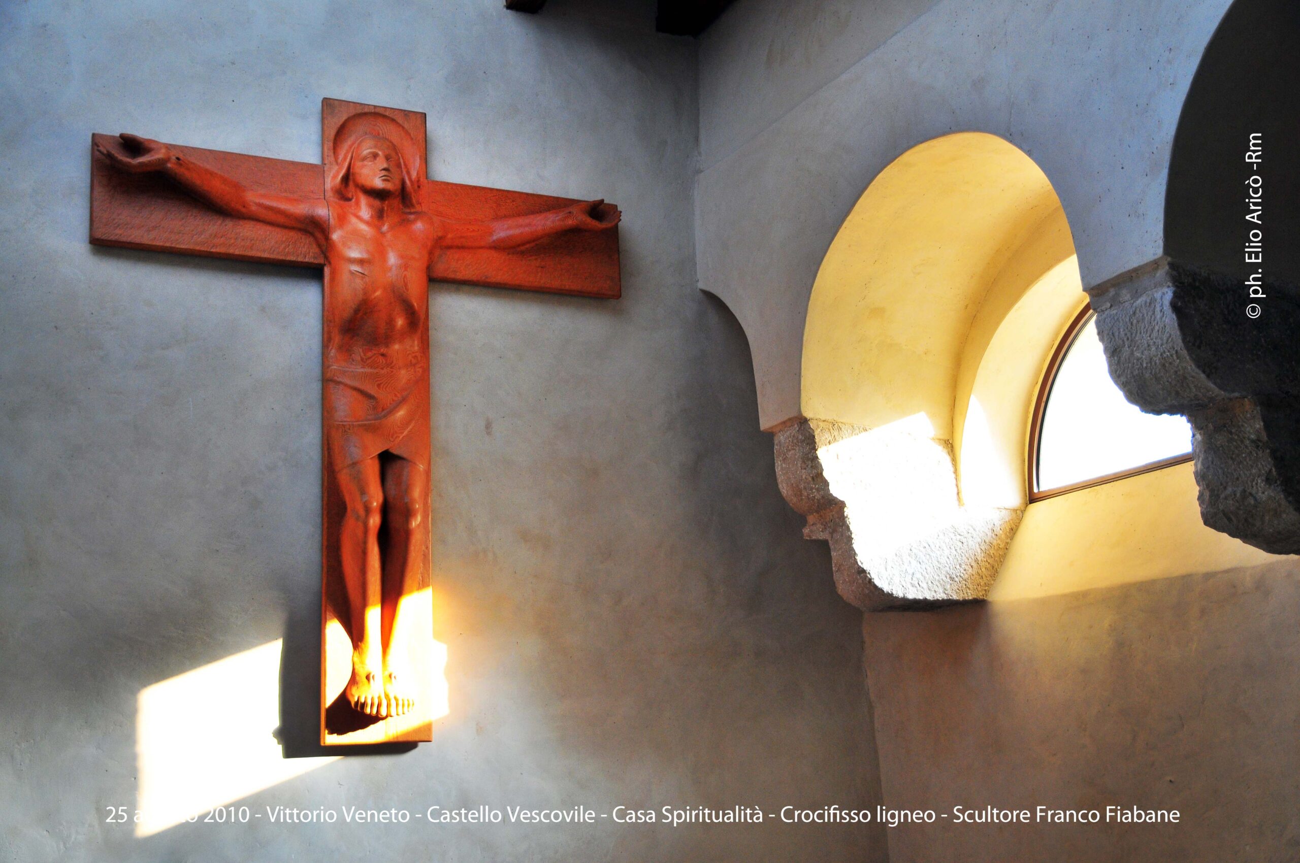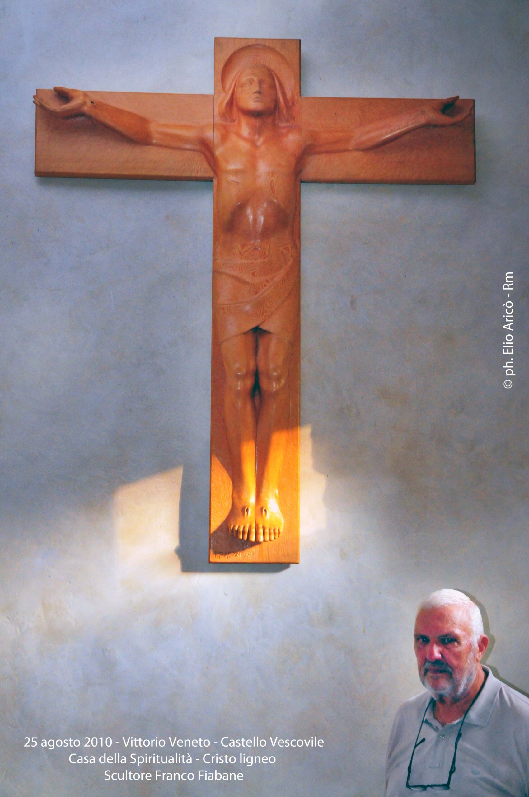 Il fotografo romano Elio Aricò ha inviato un nuovo prezioso contributo fotografico, riportando alla luce un momento intenso e profondamente umano vissuto nell’agosto del 2008. In quell’occasione, Elio e sua moglie Marcella visitarono l’atelier di Franco, maestro scultore capace di unire tecnica, sensibilità e una conoscenza anatomica fuori dal comune. Marcella – presente in alcune delle immagini – venne accolta dallo scultore con grande gentilezza. Franco si soffermò a spiegare le diverse tecniche che stava applicando al blocco “Saga familiare”, opera che già abbiamo avuto modo di commentare (vedi raccolta) e che rappresenta uno dei passaggi più significativi del suo percorso artistico. Non meno affascinante fu il momento dedicato al Cristo ligneo allora in lavorazione. Un’opera che, ricorda Elio, rivelava come pochi la capacità dello scultore di leggere il corpo umano, di comprenderne tensioni, pesi, dolori. Ed è proprio questa padronanza dell’anatomia a dare alla figura del Cristo in Croce quella forza drammatica che non è semplice rappresentazione, ma esperienza emotiva: la sofferenza dell’uomo che teme di essere abbandonato dal suo Dio. Elio Aricò, nel suo messaggio, accompagna le fotografie con un pensiero carico di stima e gratitudine, definendo quell’incontro una testimonianza viva della grandezza umana e artistica di Franco.