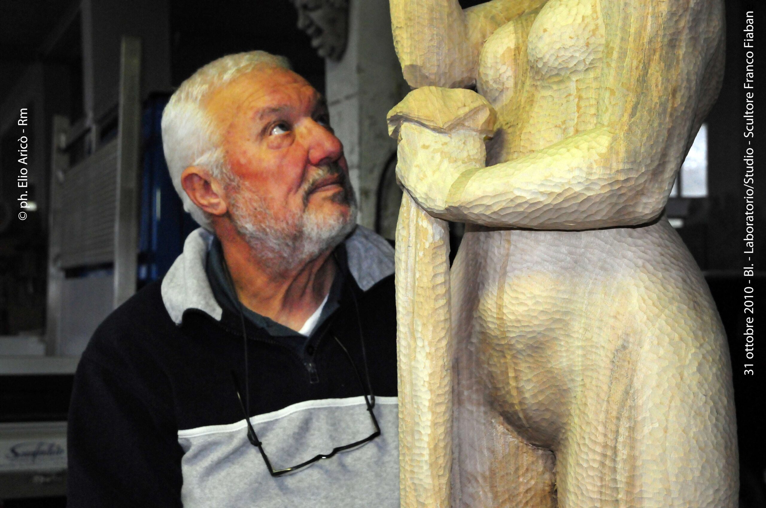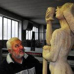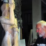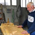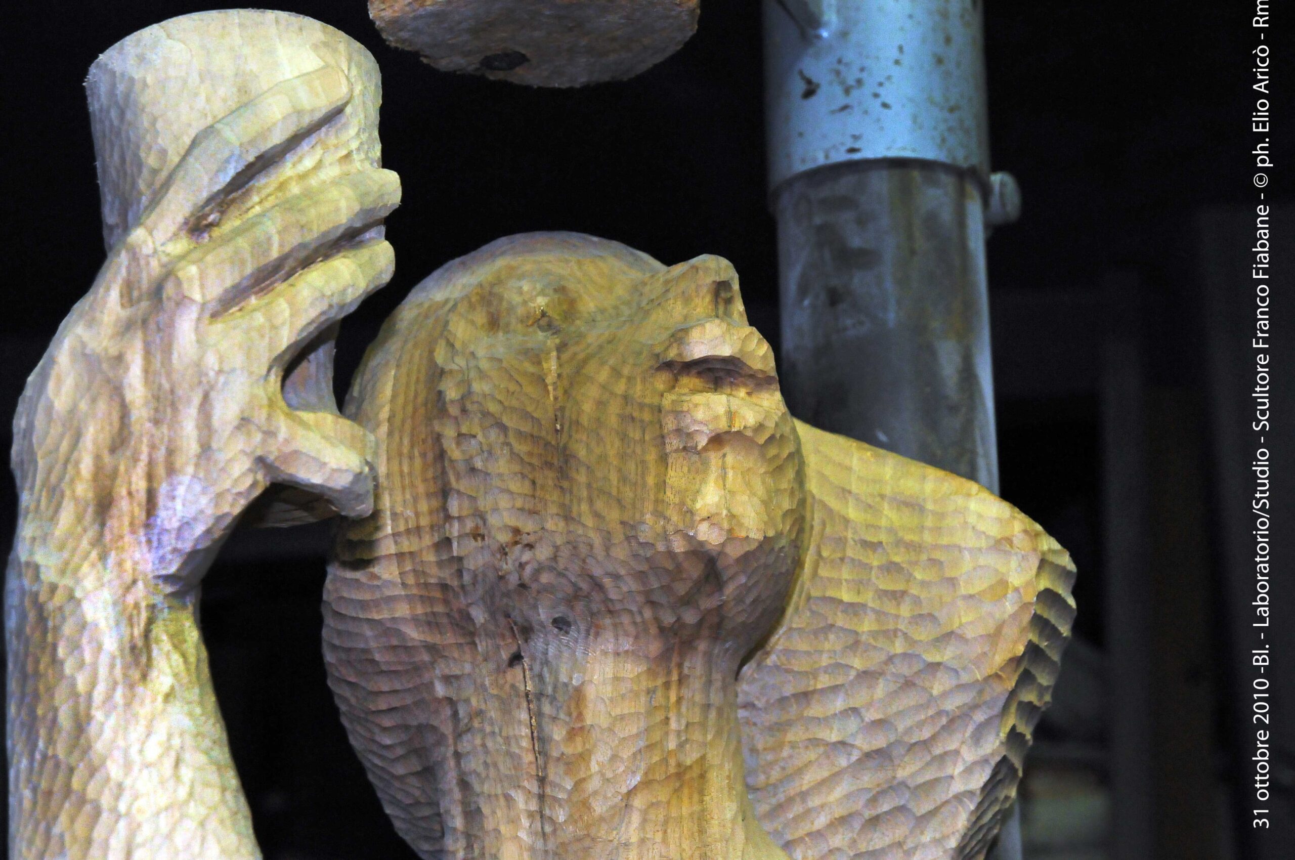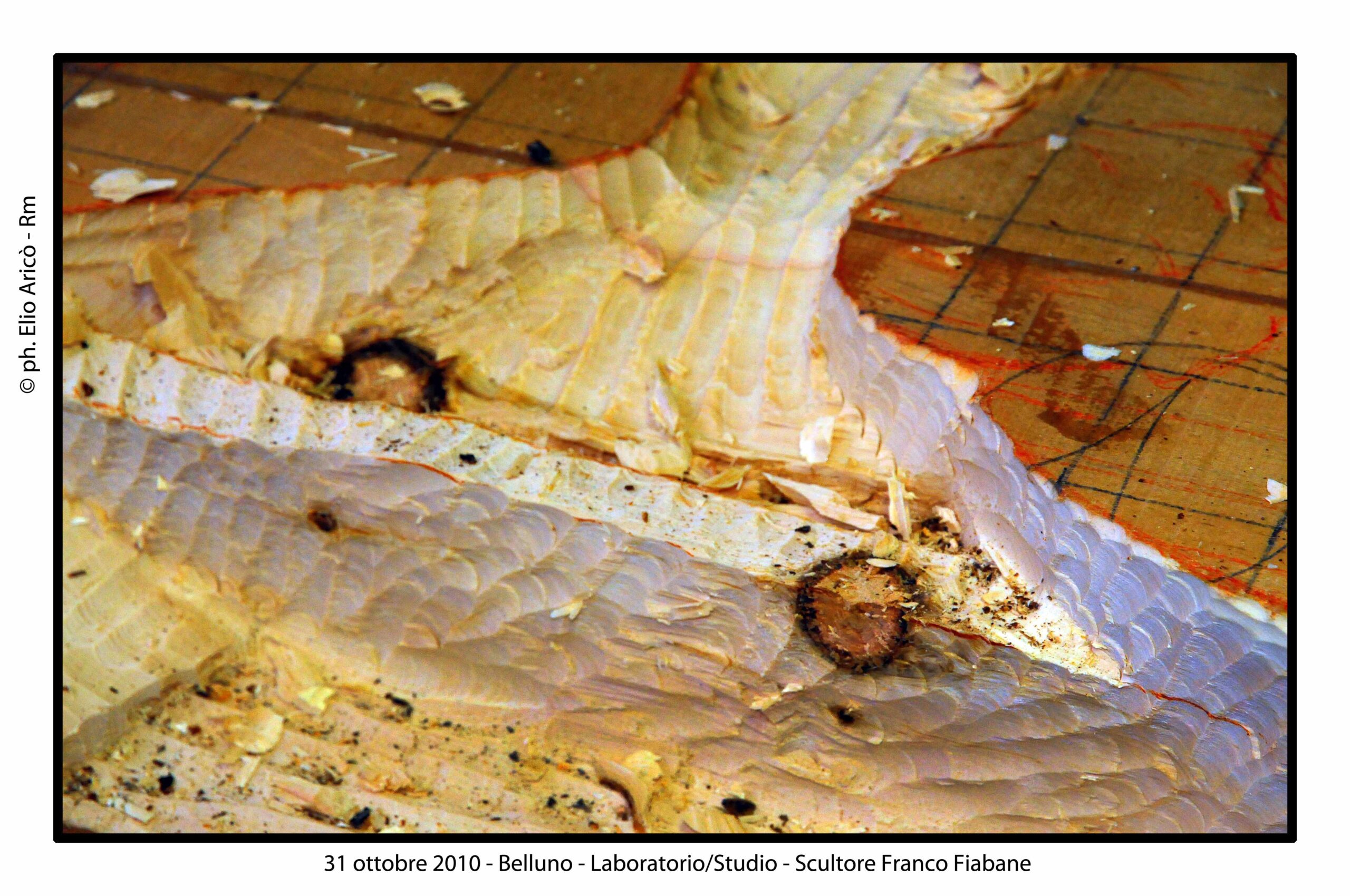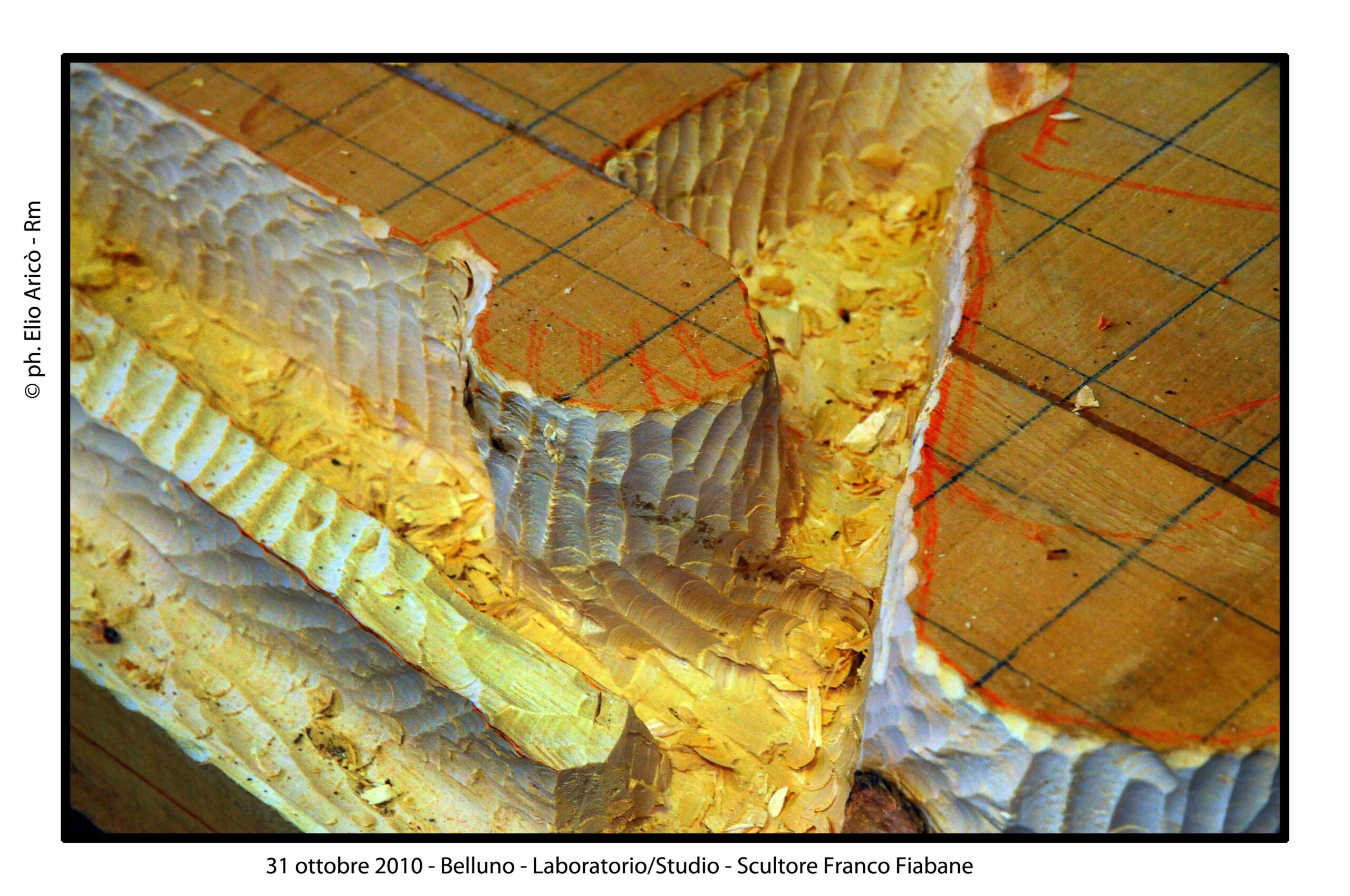 Le immagini di Elio Aricò raccontano non solo l’opera compiuta, ma anche il processo creativo: Fiabane colto nel gesto lento e concentrato dell’incisione, mentre definisce i volumi, leviga, approfondisce le ombre. È uno sguardo intimo dentro il laboratorio dell’artista, dove la scultura prende forma attraverso il rapporto fisico con il legno.