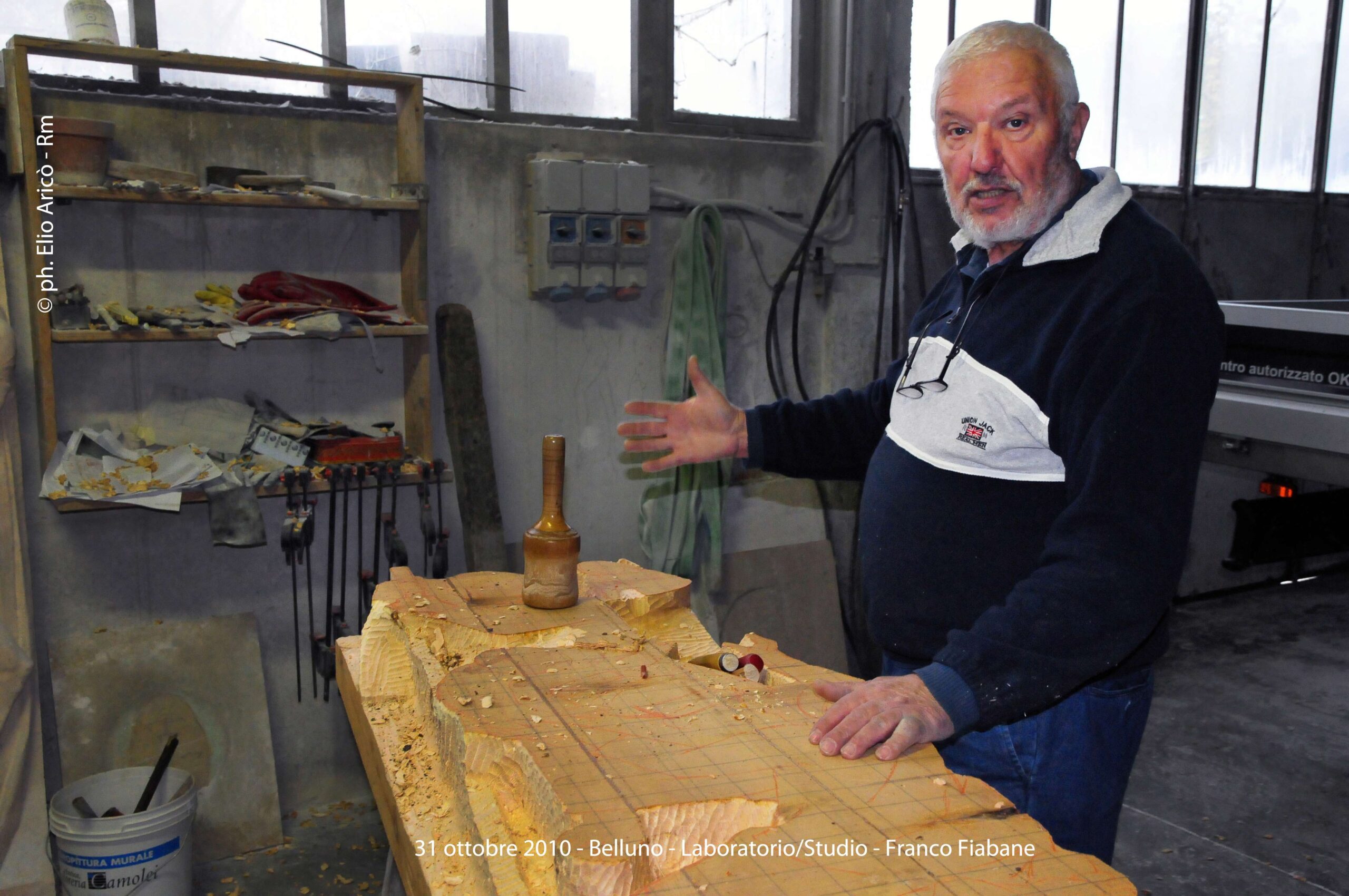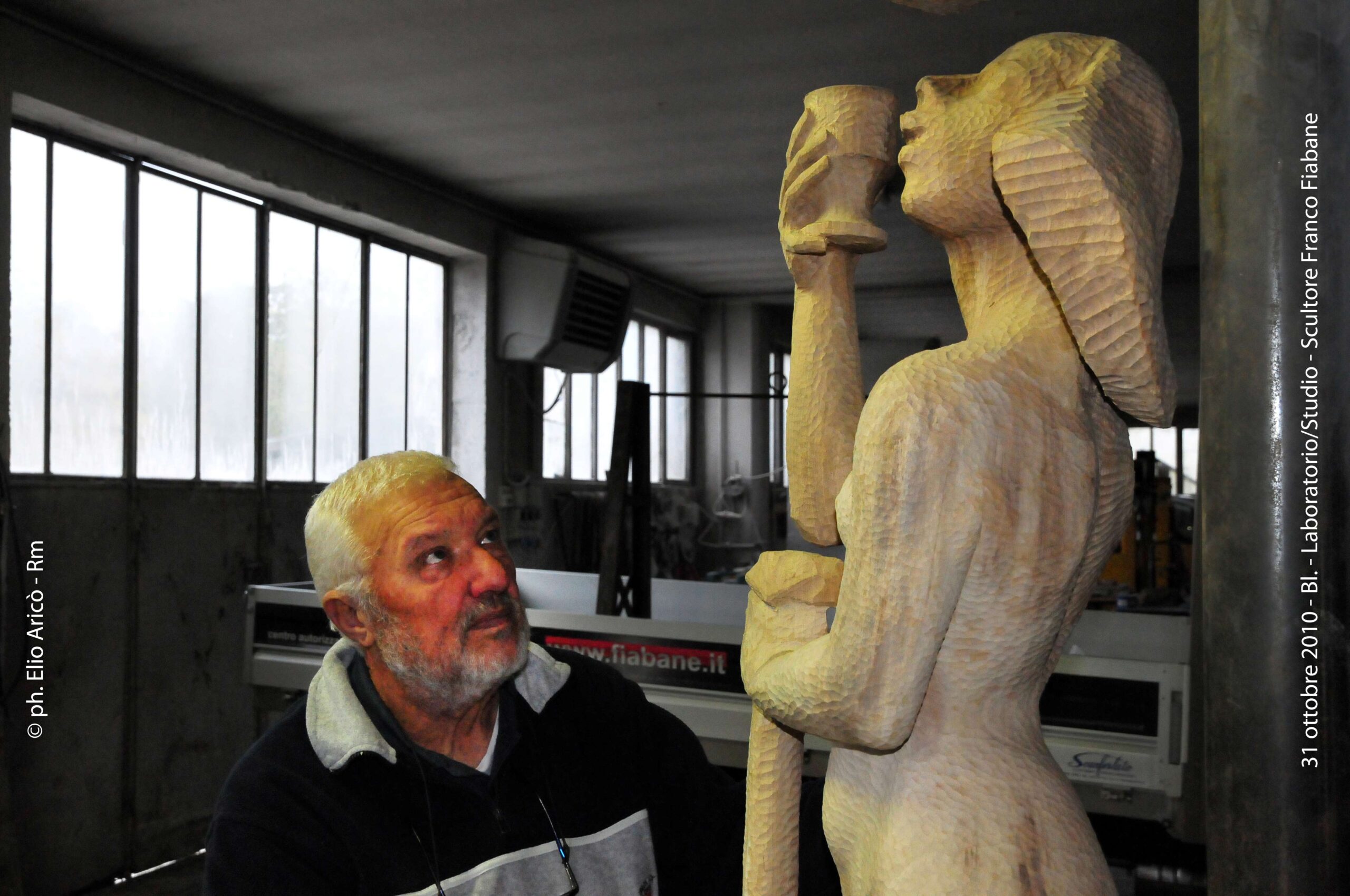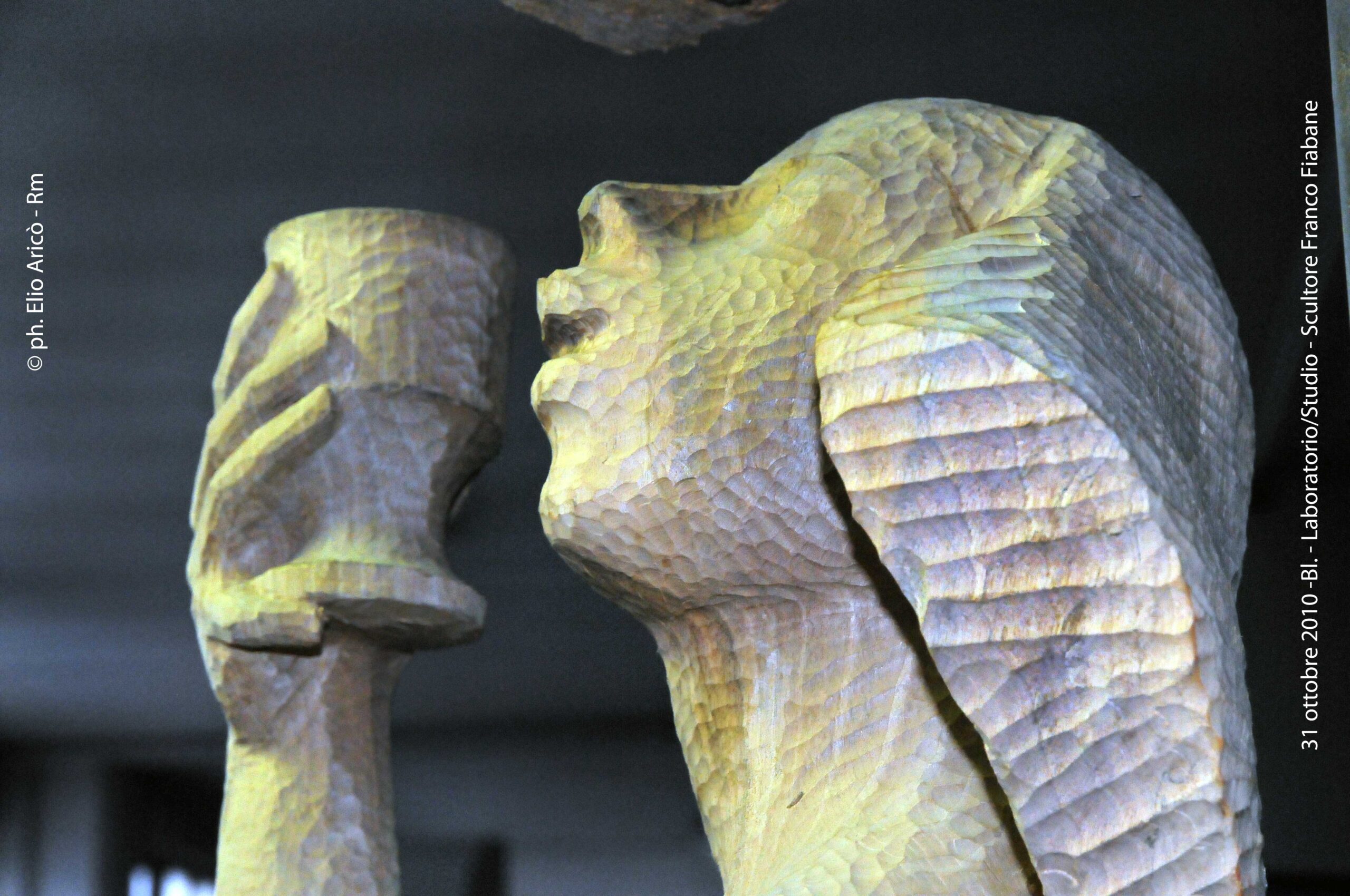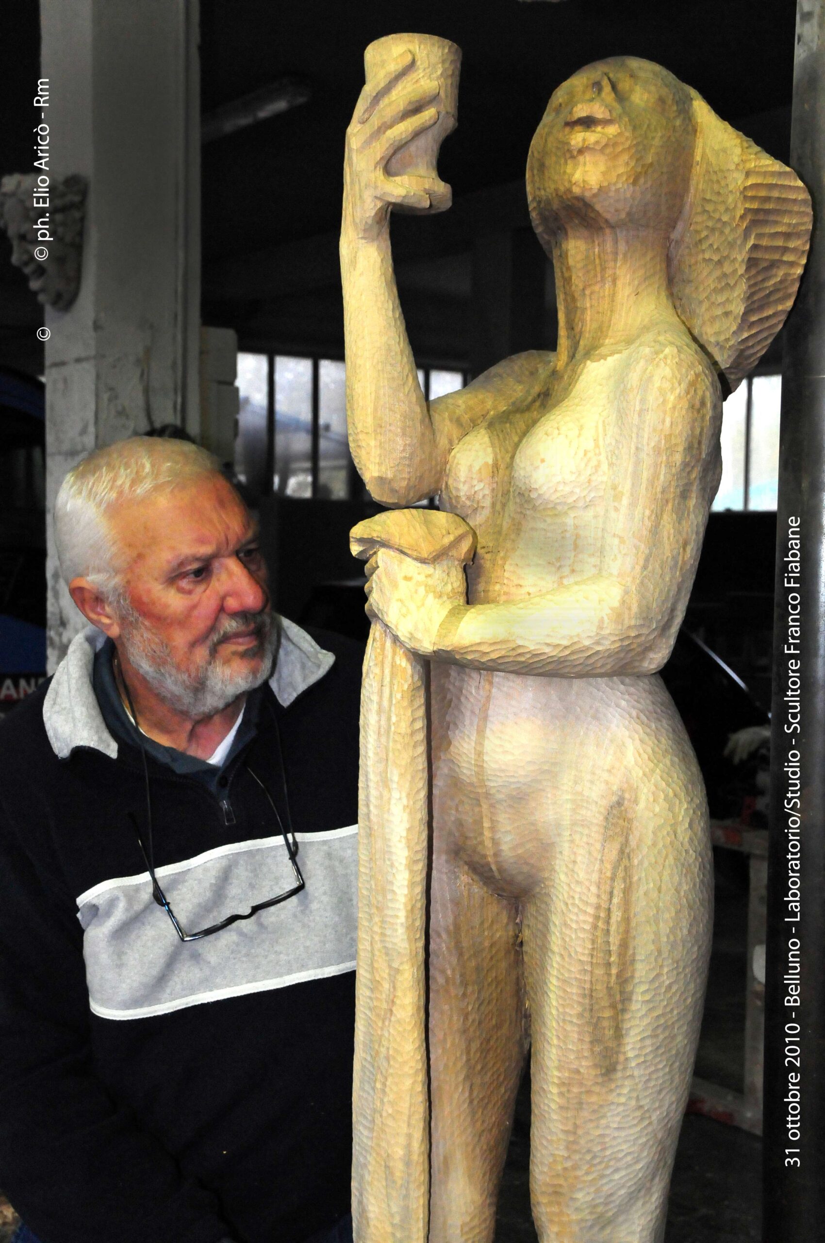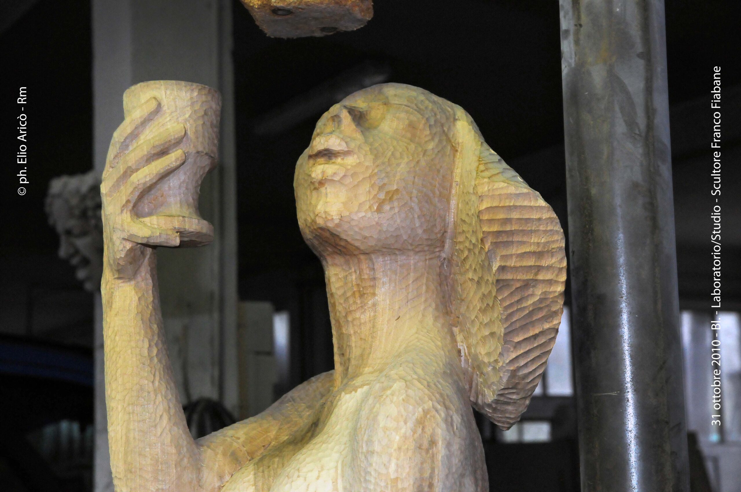 Le immagini di Elio Aricò raccontano non solo l’opera compiuta, ma anche il processo creativo: Fiabane colto nel gesto lento e concentrato dell’incisione, mentre definisce i volumi, leviga, approfondisce le ombre. È uno sguardo intimo dentro il laboratorio dell’artista, dove la scultura prende forma attraverso il rapporto fisico con il legno.