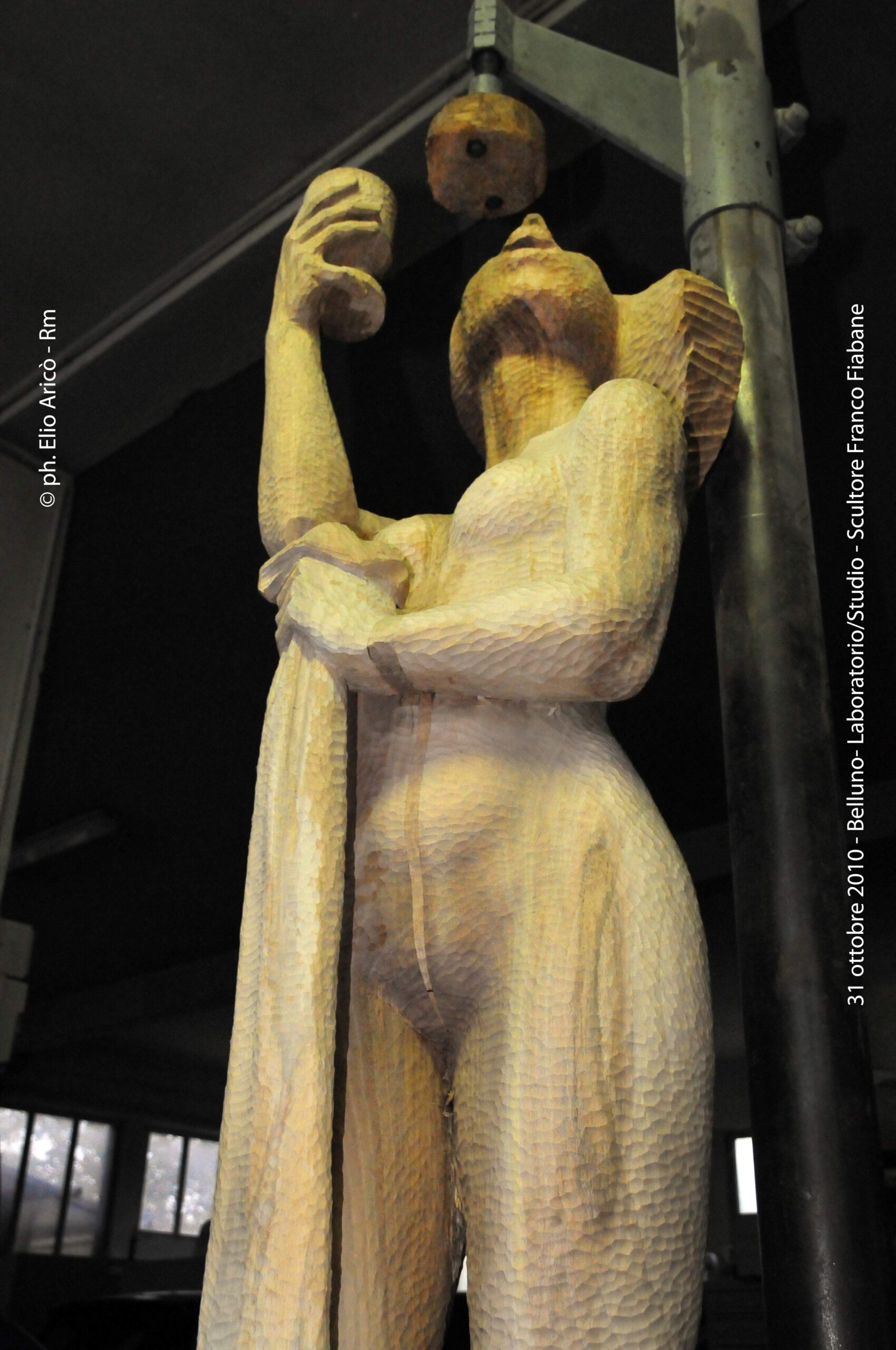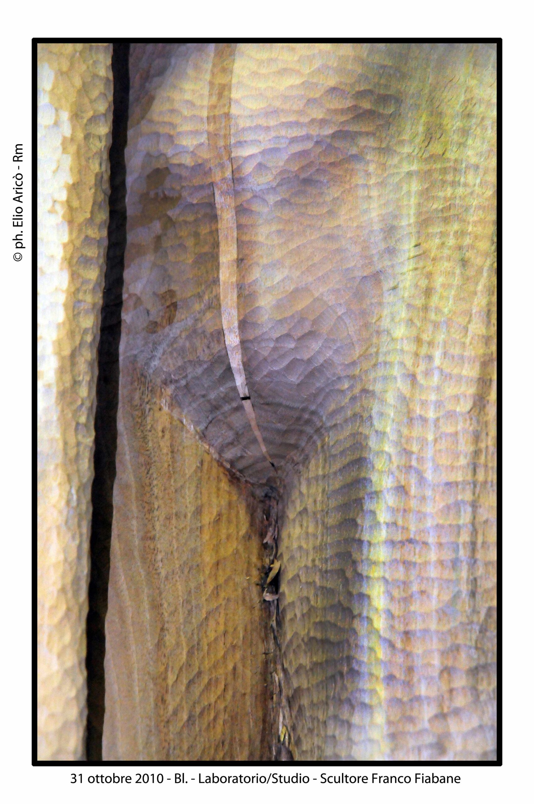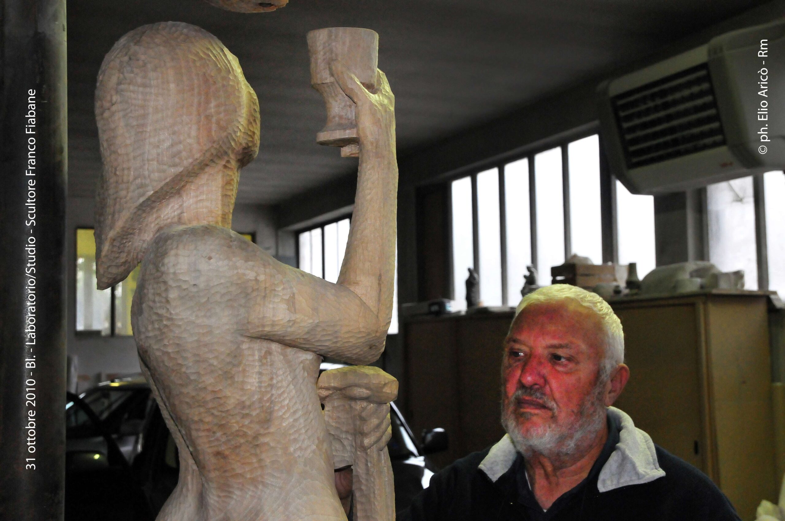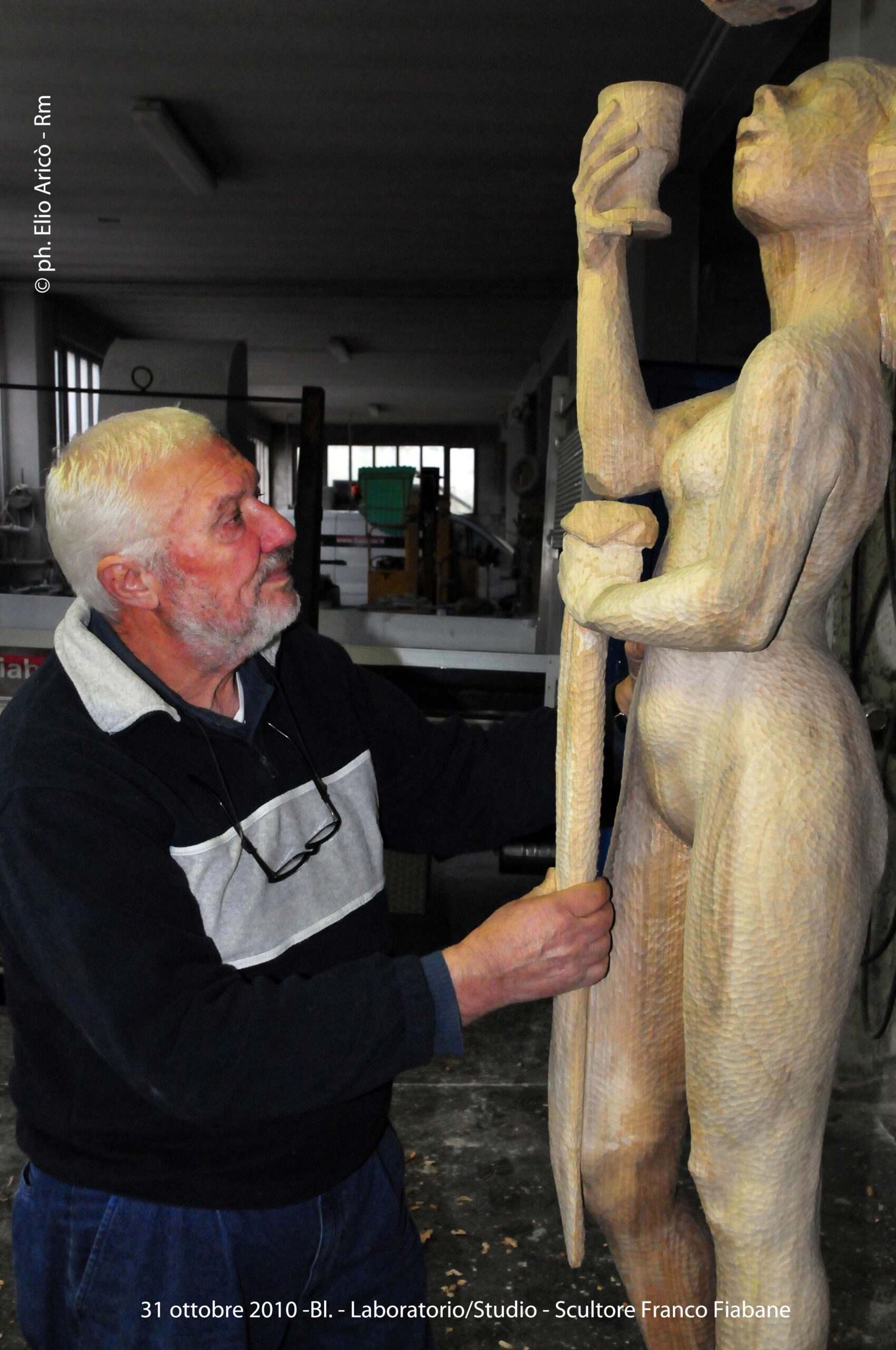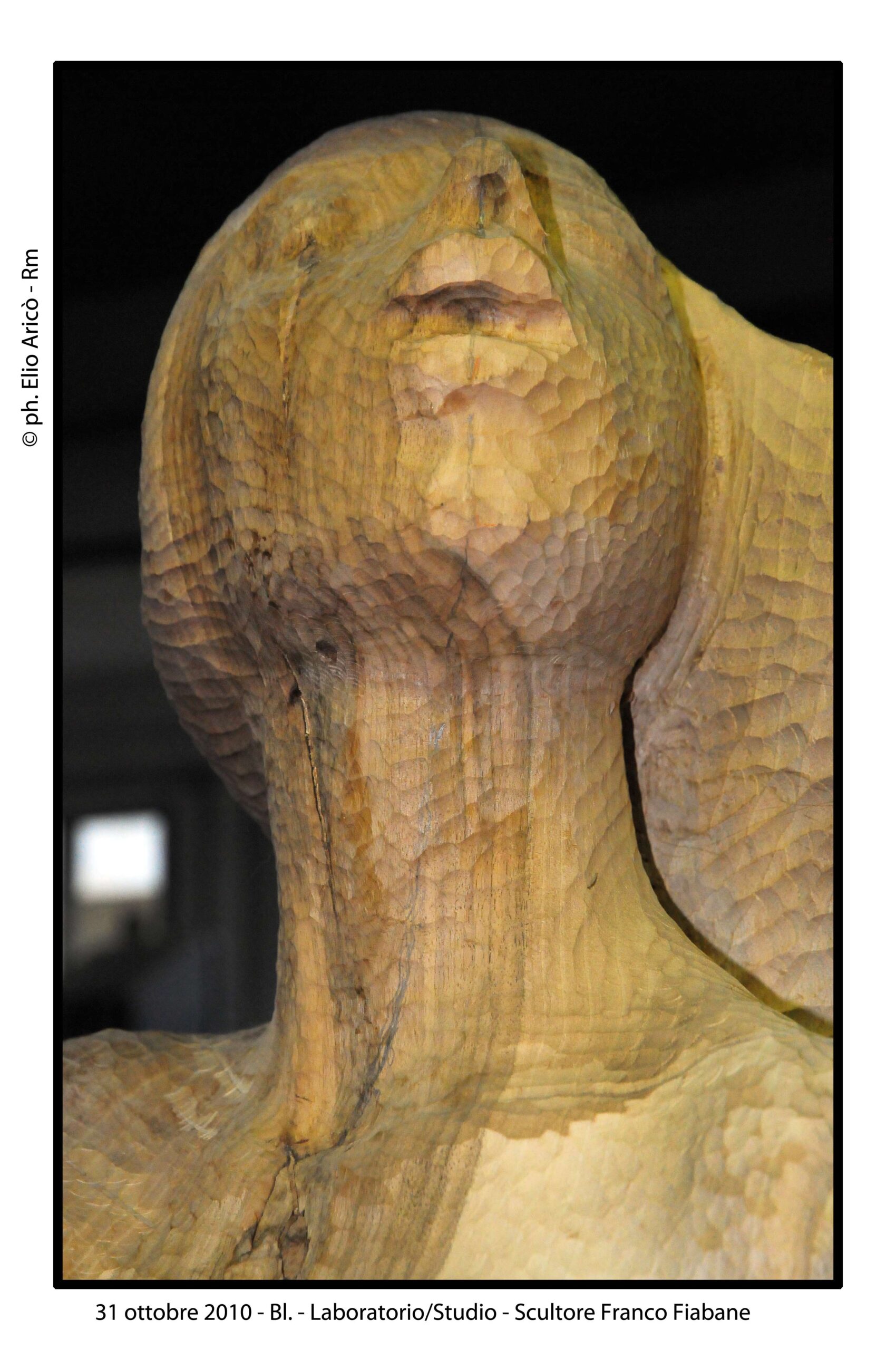 Le immagini di Elio Aricò raccontano non solo l’opera compiuta, ma anche il processo creativo: Fiabane colto nel gesto lento e concentrato dell’incisione, mentre definisce i volumi, leviga, approfondisce le ombre. È uno sguardo intimo dentro il laboratorio dell’artista, dove la scultura prende forma attraverso il rapporto fisico con il legno.