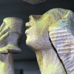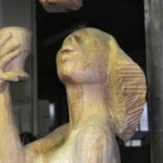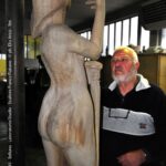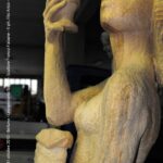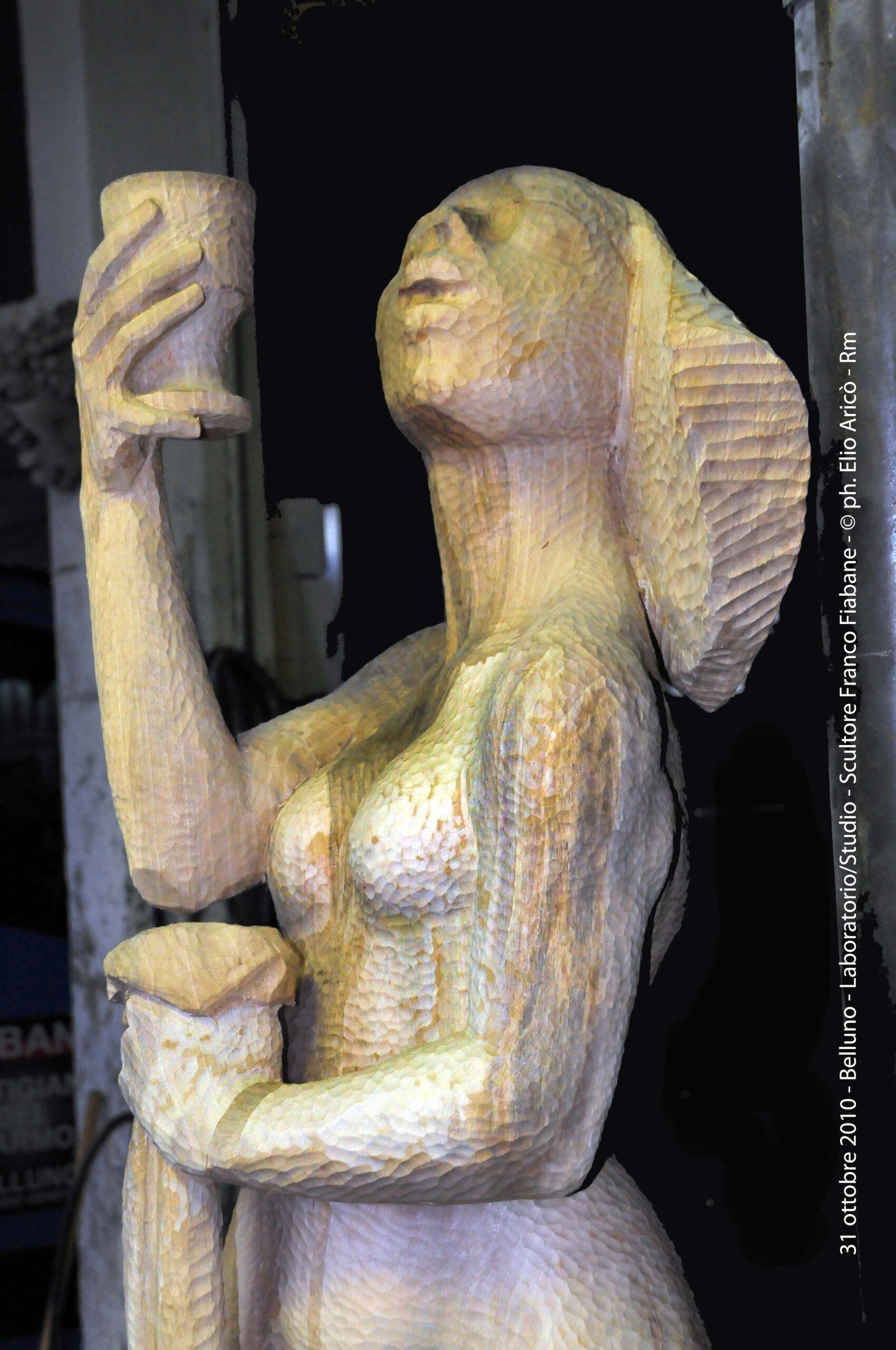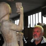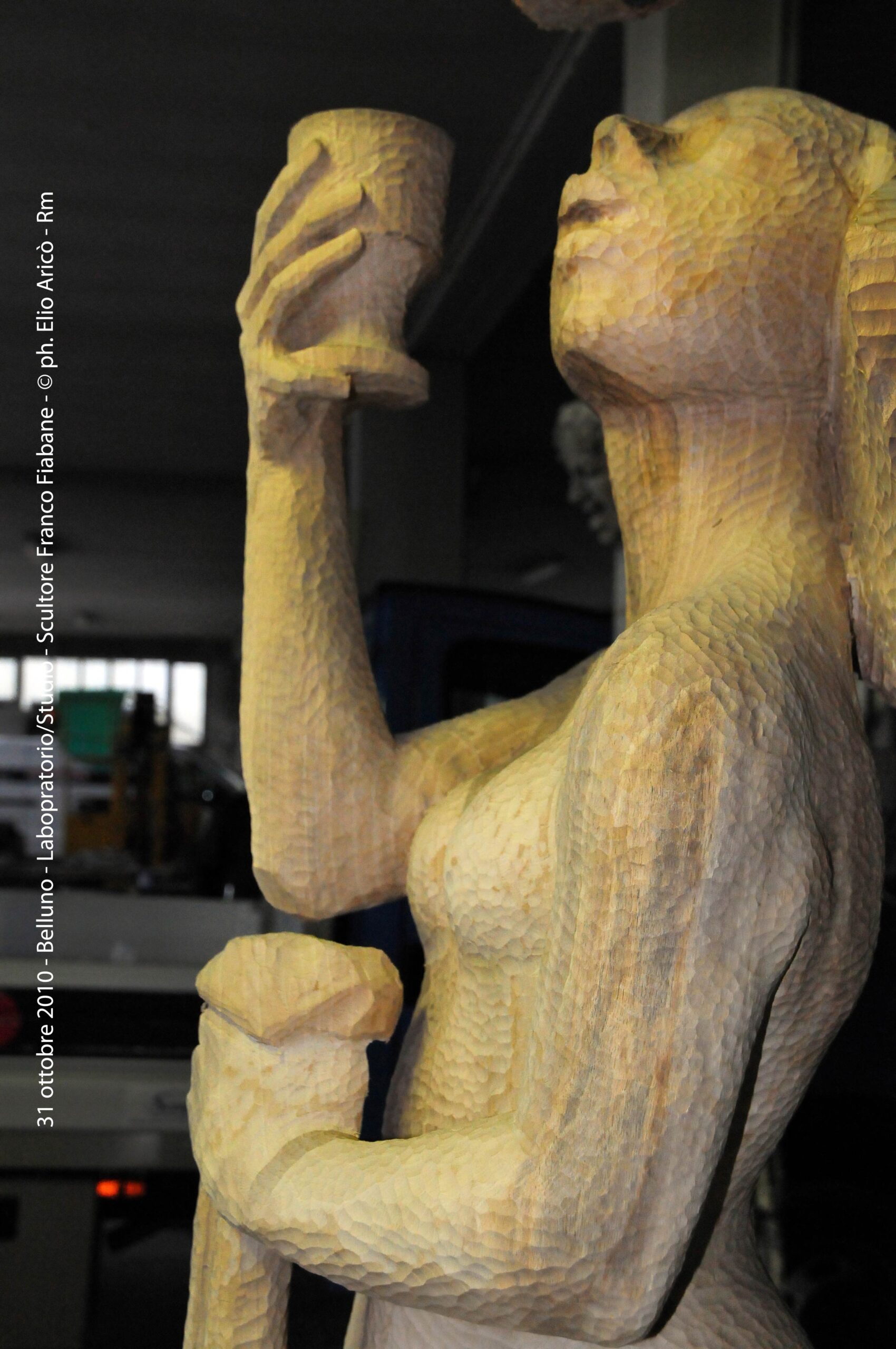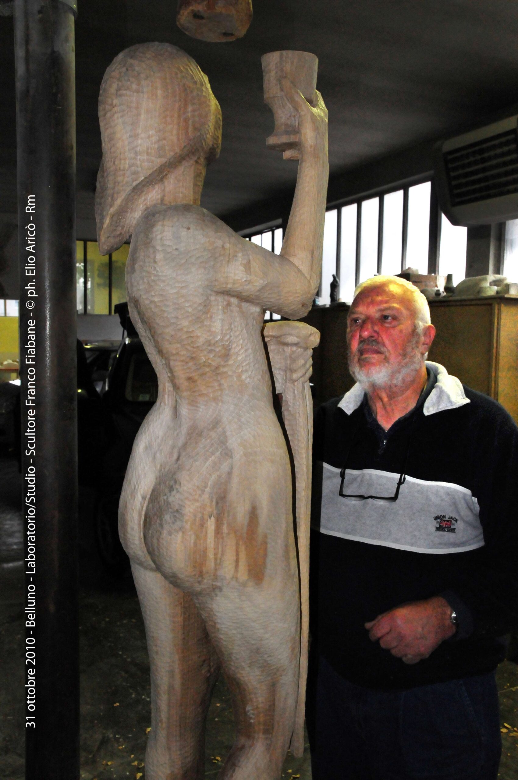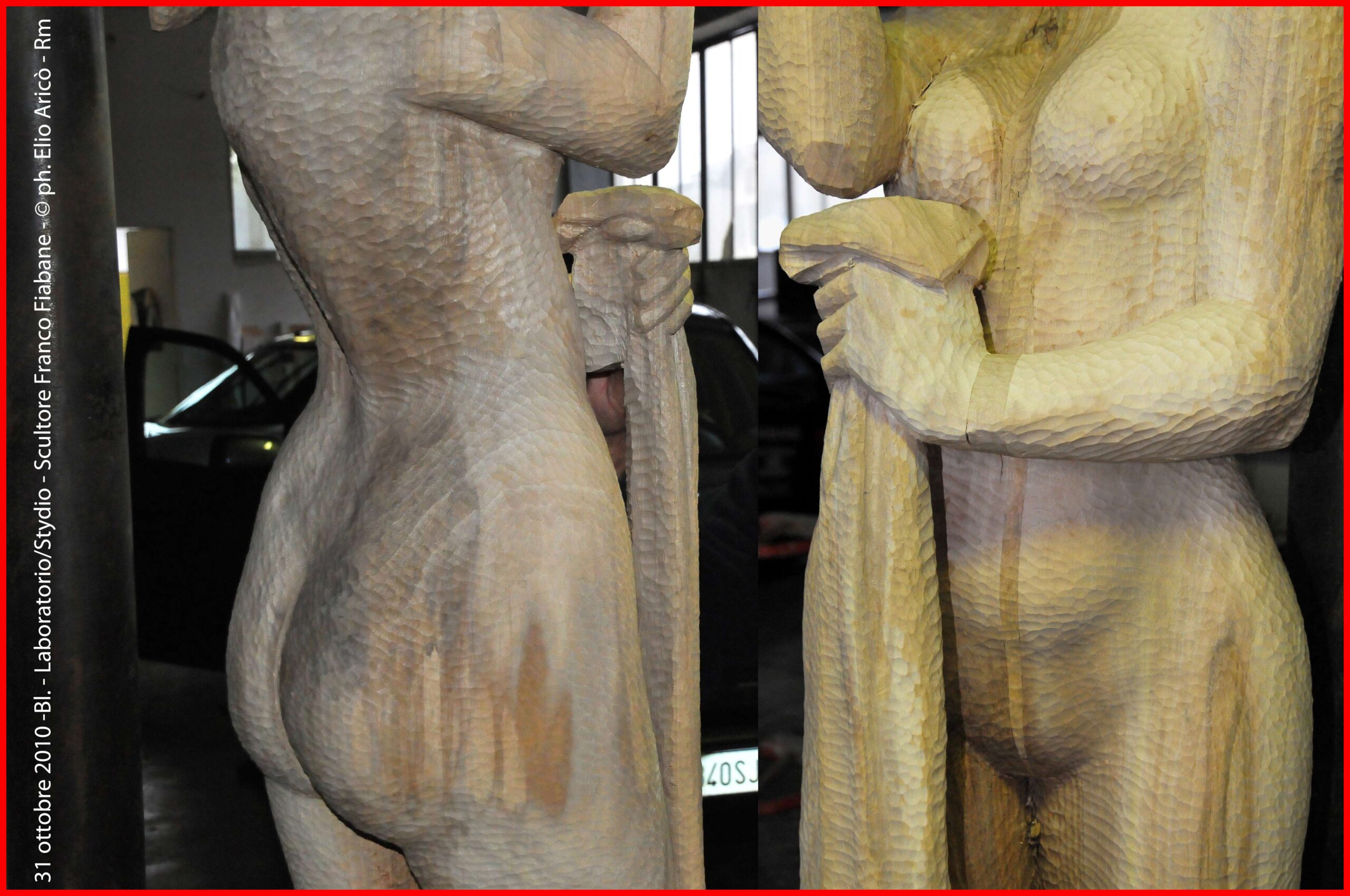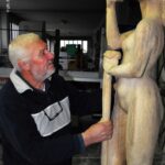Le immagini di Elio Aricò raccontano non solo l’opera compiuta, ma anche il processo creativo: Fiabane colto nel gesto lento e concentrato dell’incisione, mentre definisce i volumi, leviga, approfondisce le ombre. È uno sguardo intimo dentro il laboratorio dell’artista, dove la scultura prende forma attraverso il rapporto fisico con il legno.