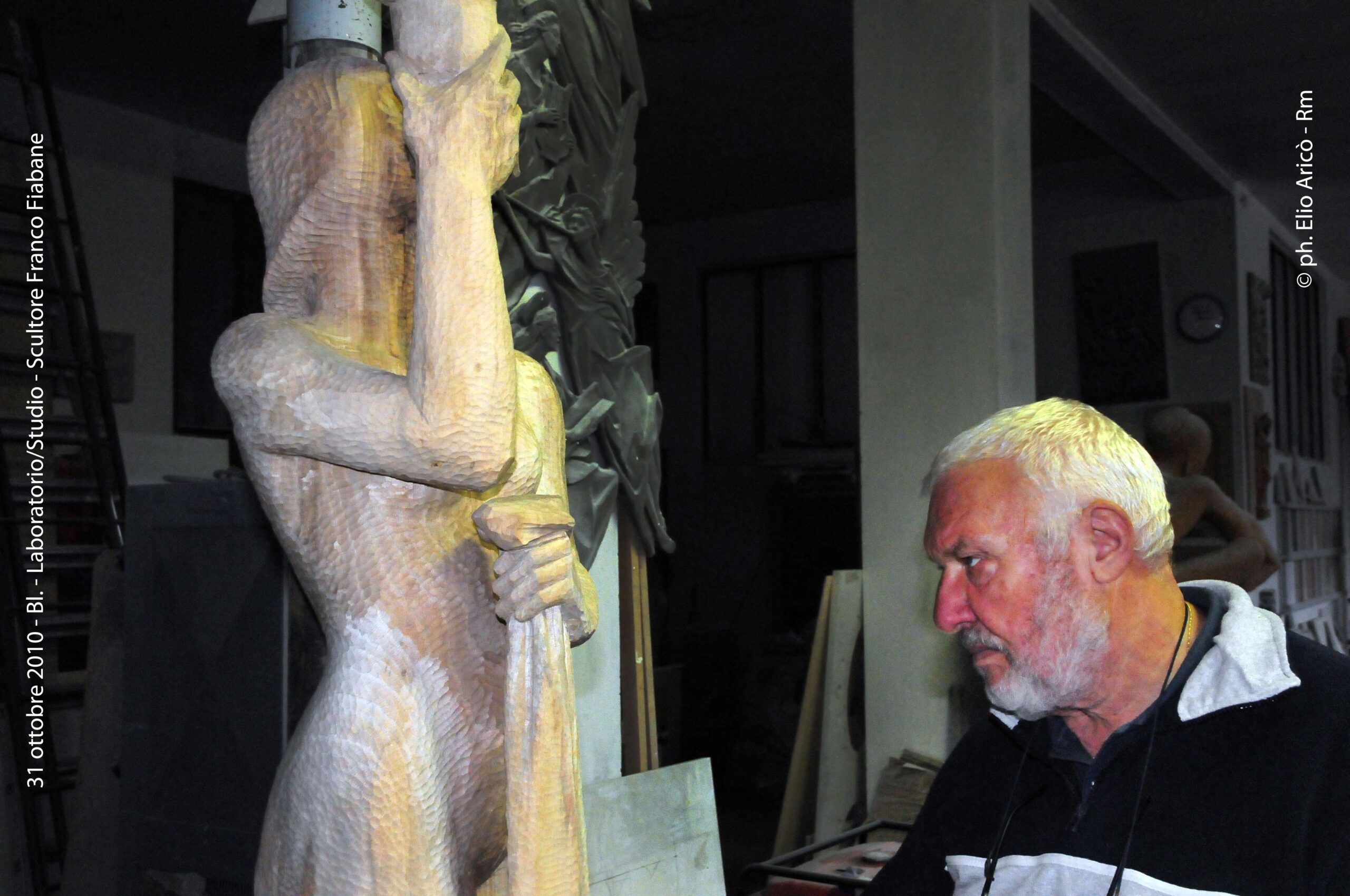 Il fotografo romano Elio Aricò ha inviato un nuovo prezioso contributo fotografico, riportando alla luce un momento intenso e profondamente umano vissuto nell’agosto del 2008. In quell’occasione, Elio e sua moglie Marcella visitarono l’atelier di Franco, maestro scultore capace di unire tecnica, sensibilità e una conoscenza anatomica fuori dal comune. Marcella – presente in alcune delle immagini – venne accolta dallo scultore con grande gentilezza. Franco si soffermò a spiegare le diverse tecniche che stava applicando al blocco “Saga familiare”, opera che già abbiamo avuto modo di commentare (vedi raccolta) e che rappresenta uno dei passaggi più significativi del suo percorso artistico. Non meno affascinante fu il momento dedicato al Cristo ligneo allora in lavorazione. Un’opera che, ricorda Elio, rivelava come pochi la capacità dello scultore di leggere il corpo umano, di comprenderne tensioni, pesi, dolori. Ed è proprio questa padronanza dell’anatomia a dare alla figura del Cristo in Croce quella forza drammatica che non è semplice rappresentazione, ma esperienza emotiva: la sofferenza dell’uomo che teme di essere abbandonato dal suo Dio. Elio Aricò, nel suo messaggio, accompagna le fotografie con un pensiero carico di stima e gratitudine, definendo quell’incontro una testimonianza viva della grandezza umana e artistica di Franco.