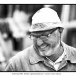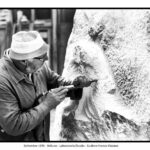Nel suo laboratorio il tempo sembra rallentare, seguendo il ritmo paziente delle mani e del legno. Le immagini raccontano Franco Fiabane al lavoro nell’estate del 2011: uno scultore immerso nel dialogo silenzioso con la materia, circondato da trucioli, attrezzi e forme che nascono poco alla volta. Nel laboratorio si vedono opere in diverse fasi di lavorazione: grandi tronchi appena sbozzati, figure ancora incomplete, parti separate – braccia, busti, rilievi – che attendono di essere ricomposte o rifinite. Accanto alle sculture tridimensionali compaiono pannelli scolpiti a bassorilievo, scene narrative che richiamano il racconto popolare, la memoria collettiva, la vita quotidiana. È un mondo coerente, in cui il gesto artigianale si intreccia alla dimensione simbolica. Le fotografie di Elio Arico’ mostrano Fiabane concentrato, a volte sorridente, a volte assorto. Indossa il grembiule da lavoro, osserva l’opera da vicino, la tocca, la gira, come per verificarne l’equilibrio e l’anima. Il rapporto con il legno è fisico e diretto: martello e scalpello diventano strumenti di dialogo più che di forza, capaci di seguire le venature naturali del materiale e assecondarne le imperfezioni.