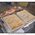 Nel suo laboratorio il tempo sembra rallentare, seguendo il ritmo paziente delle mani e del legno. Le immagini raccontano Franco Fiabane al lavoro nell’estate del 2011: uno scultore immerso nel dialogo silenzioso con la materia, circondato da trucioli, attrezzi e forme che nascono poco alla volta. Nel laboratorio si vedono opere in diverse fasi di lavorazione: grandi tronchi appena sbozzati, figure ancora incomplete, parti separate – braccia, busti, rilievi – che attendono di essere ricomposte o rifinite. Accanto alle sculture tridimensionali compaiono pannelli scolpiti a bassorilievo, scene narrative che richiamano il racconto popolare, la memoria collettiva, la vita quotidiana. È un mondo coerente, in cui il gesto artigianale si intreccia alla dimensione simbolica. Le fotografie di Elio Arico’ mostrano Fiabane concentrato, a volte sorridente, a volte assorto. Indossa il grembiule da lavoro, osserva l’opera da vicino, la tocca, la gira, come per verificarne l’equilibrio e l’anima. Il rapporto con il legno è fisico e diretto: martello e scalpello diventano strumenti di dialogo più che di forza, capaci di seguire le venature naturali del materiale e assecondarne le imperfezioni.