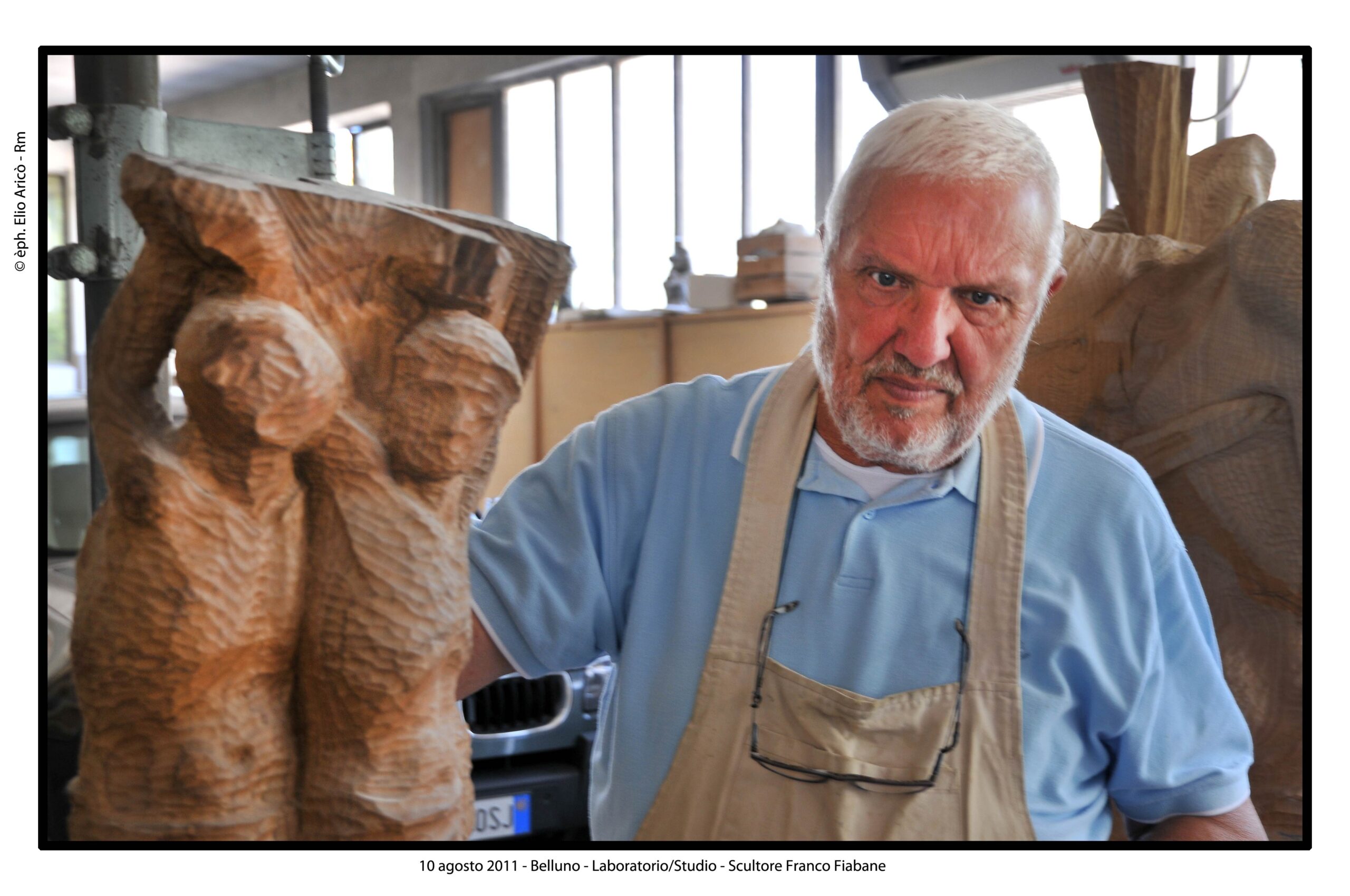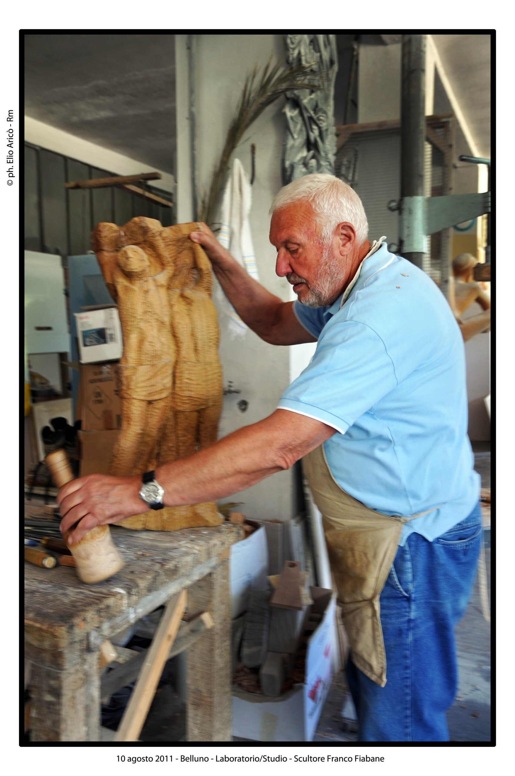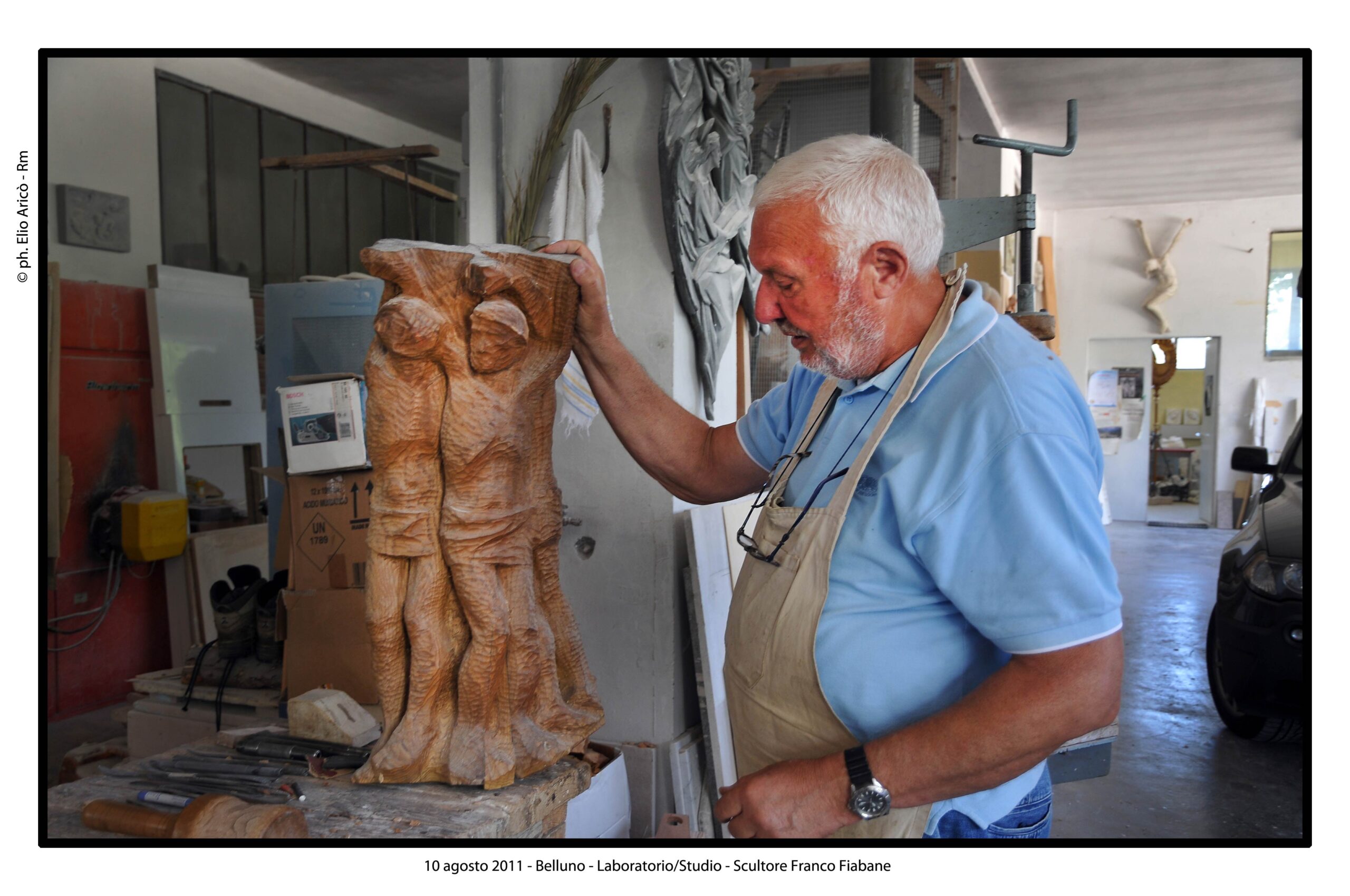 Nel suo laboratorio il tempo sembra rallentare, seguendo il ritmo paziente delle mani e del legno. Le immagini raccontano Franco Fiabane al lavoro nell’estate del 2011: uno scultore immerso nel dialogo silenzioso con la materia, circondato da trucioli, attrezzi e forme che nascono poco alla volta. Nel laboratorio si vedono opere in diverse fasi di lavorazione: grandi tronchi appena sbozzati, figure ancora incomplete, parti separate – braccia, busti, rilievi – che attendono di essere ricomposte o rifinite. Accanto alle sculture tridimensionali compaiono pannelli scolpiti a bassorilievo, scene narrative che richiamano il racconto popolare, la memoria collettiva, la vita quotidiana. È un mondo coerente, in cui il gesto artigianale si intreccia alla dimensione simbolica. Le fotografie di Elio Arico’ mostrano Fiabane concentrato, a volte sorridente, a volte assorto. Indossa il grembiule da lavoro, osserva l’opera da vicino, la tocca, la gira, come per verificarne l’equilibrio e l’anima. Il rapporto con il legno è fisico e diretto: martello e scalpello diventano strumenti di dialogo più che di forza, capaci di seguire le venature naturali del materiale e assecondarne le imperfezioni.