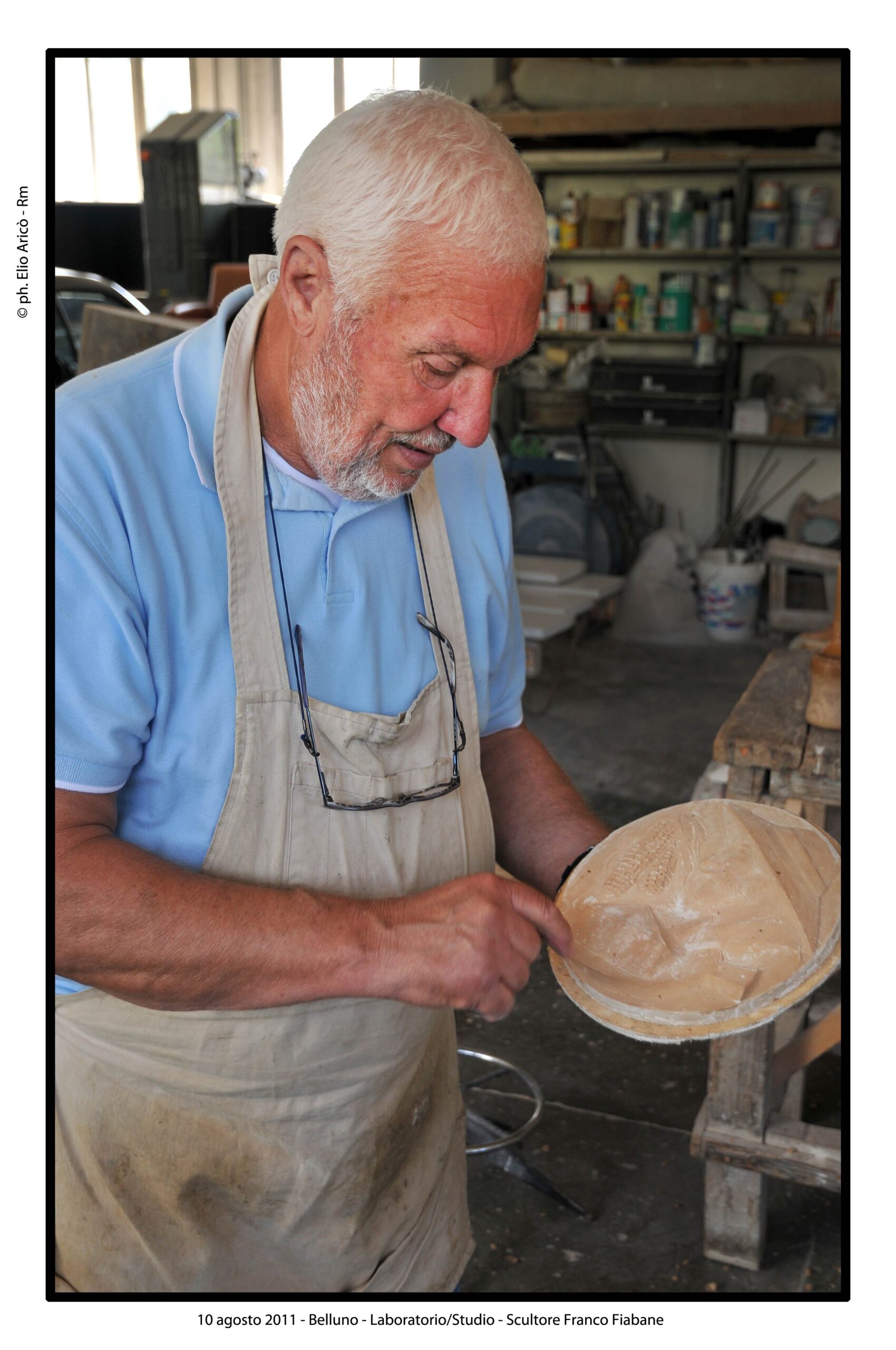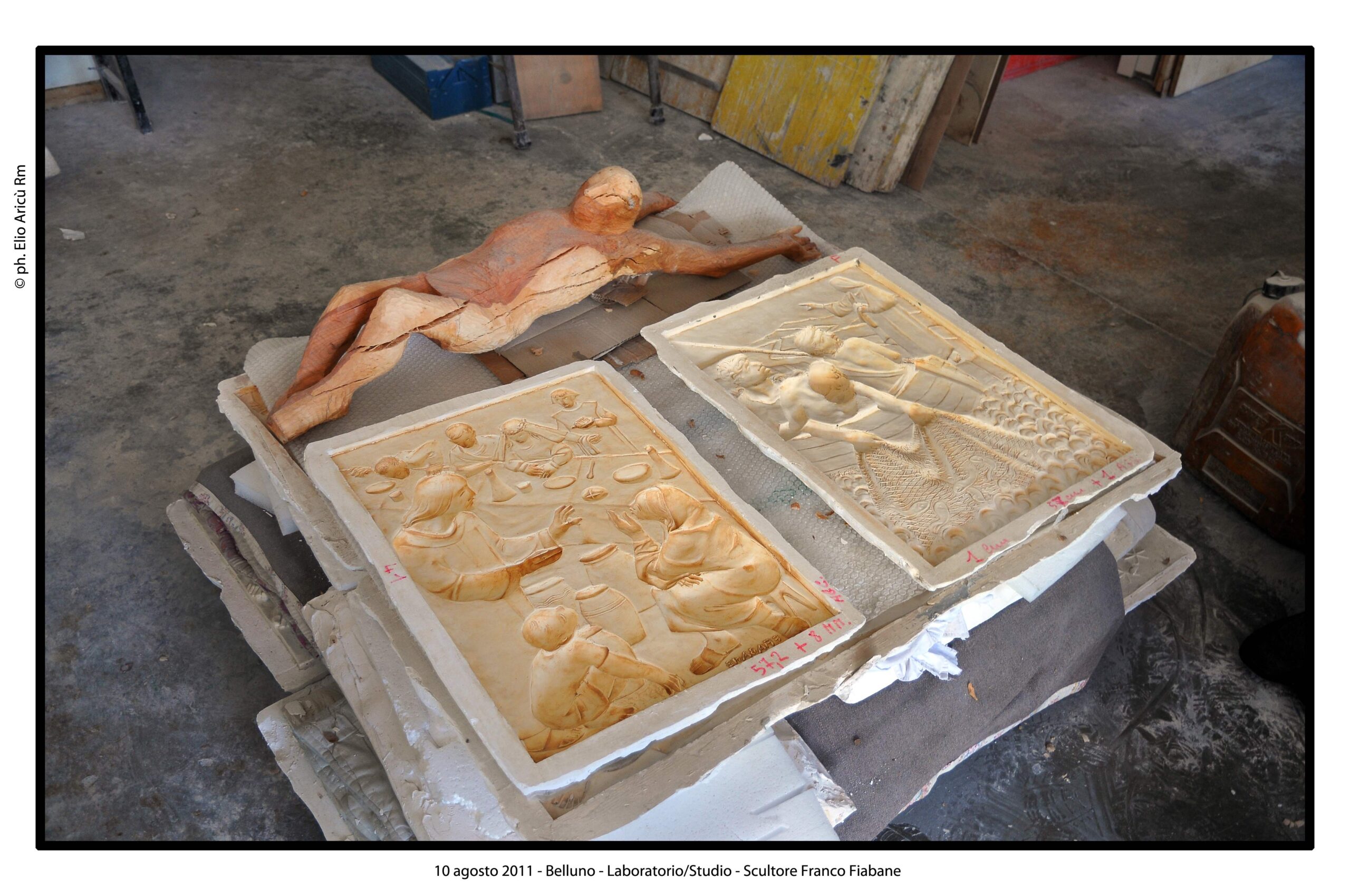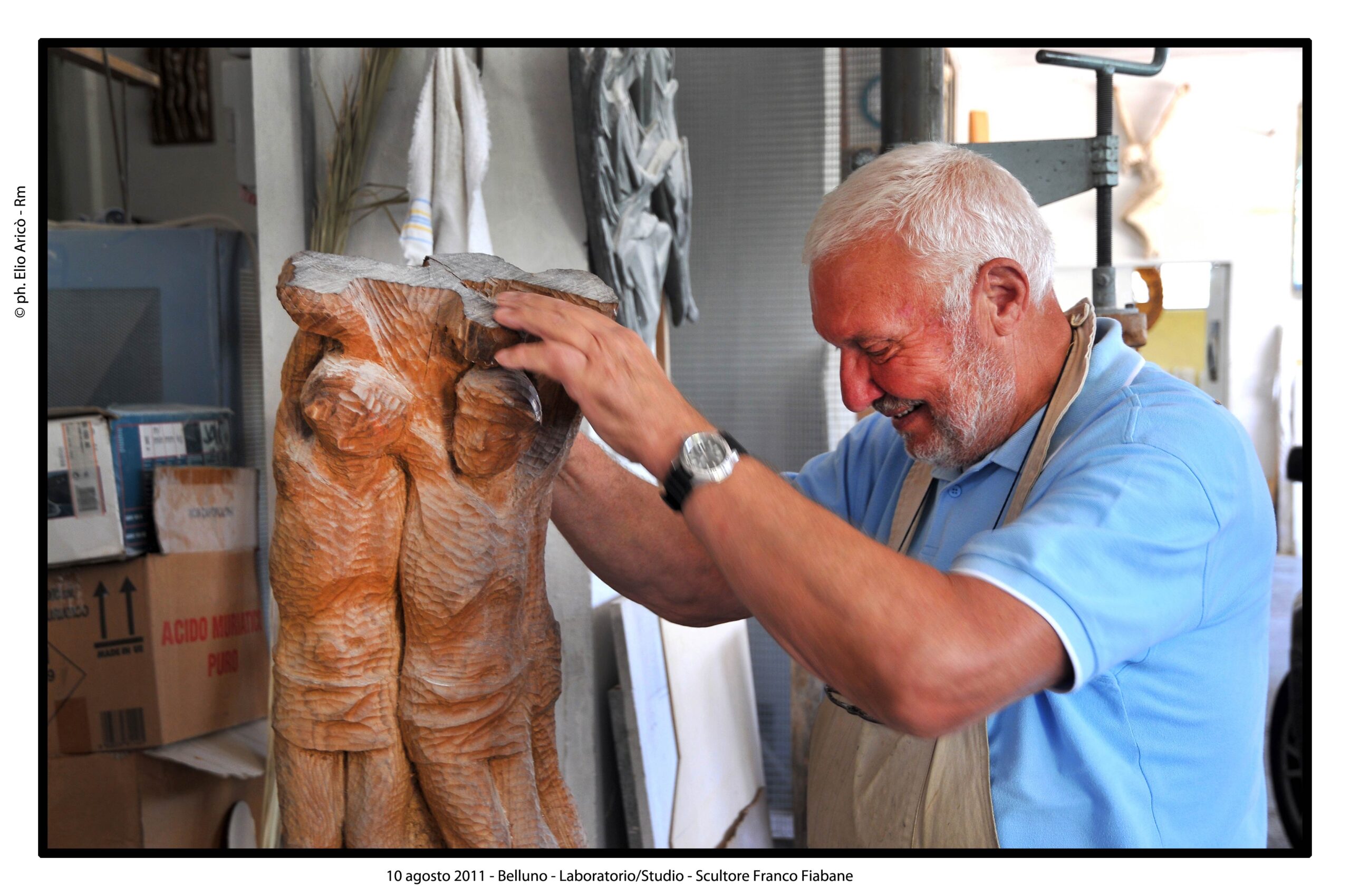 Nel suo laboratorio il tempo sembra rallentare, seguendo il ritmo paziente delle mani e del legno. Le immagini raccontano Franco Fiabane al lavoro nell’estate del 2011: uno scultore immerso nel dialogo silenzioso con la materia, circondato da trucioli, attrezzi e forme che nascono poco alla volta. Nel laboratorio si vedono opere in diverse fasi di lavorazione: grandi tronchi appena sbozzati, figure ancora incomplete, parti separate – braccia, busti, rilievi – che attendono di essere ricomposte o rifinite. Accanto alle sculture tridimensionali compaiono pannelli scolpiti a bassorilievo, scene narrative che richiamano il racconto popolare, la memoria collettiva, la vita quotidiana. È un mondo coerente, in cui il gesto artigianale si intreccia alla dimensione simbolica. Le fotografie di Elio Arico’ mostrano Fiabane concentrato, a volte sorridente, a volte assorto. Indossa il grembiule da lavoro, osserva l’opera da vicino, la tocca, la gira, come per verificarne l’equilibrio e l’anima. Il rapporto con il legno è fisico e diretto: martello e scalpello diventano strumenti di dialogo più che di forza, capaci di seguire le venature naturali del materiale e assecondarne le imperfezioni.