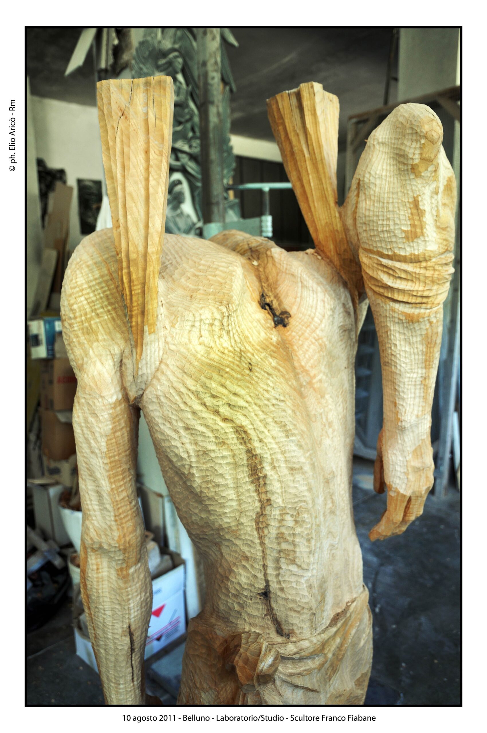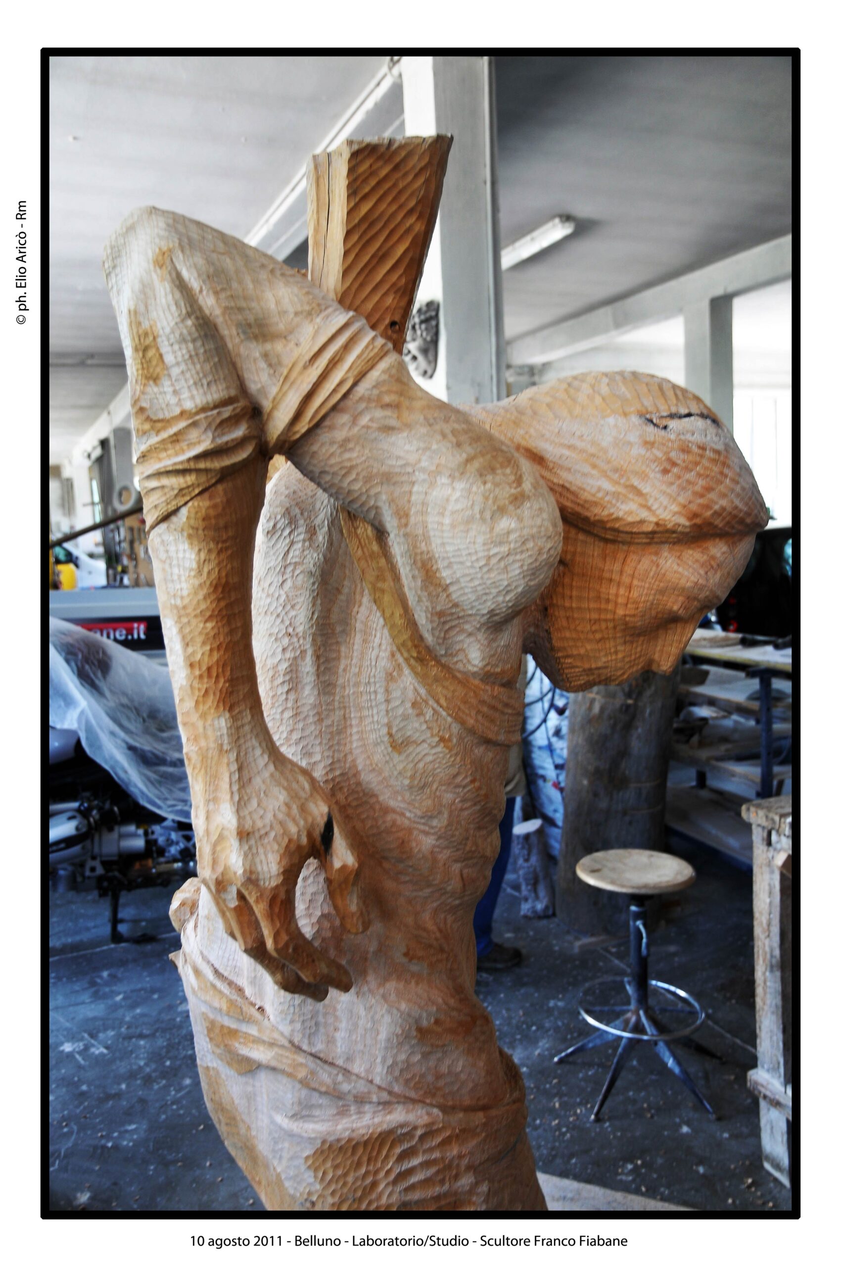 Le immagini di Elio Aricò raccontano non solo l’opera compiuta, ma anche il processo creativo: Fiabane colto nel gesto lento e concentrato dell’incisione, mentre definisce i volumi, leviga, approfondisce le ombre. È uno sguardo intimo dentro il laboratorio dell’artista, dove la scultura prende forma attraverso il rapporto fisico con il legno.