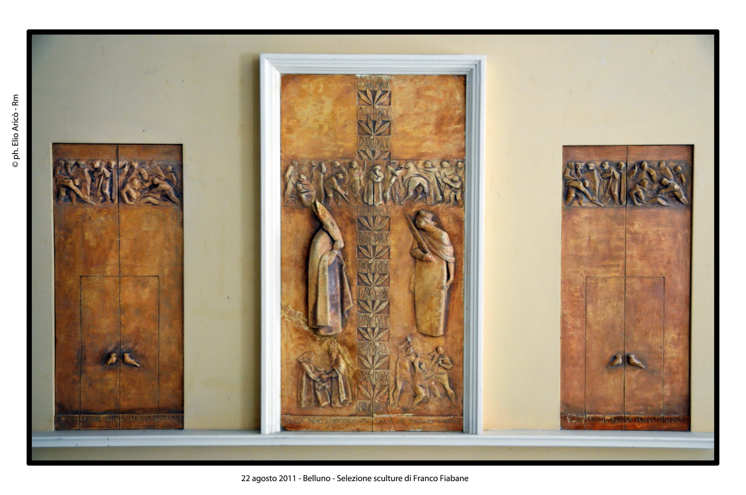 è il bassorilievo ligneo realizzato da Franco Fiabane per il paliotto d’altare della Cappella dei Seminaristi del Seminario Vescovile. Il fotografo Elio Aricò, che negli anni ha documentato molte opere dell’artista, ricorda così la genesi del lavoro: «Io ricordo che Franco lo titolava La pesca miracolosa, sul catalogo è indicato come L’Eucarestia». Due titoli, nessuna contraddizione: soltanto il riflesso della ricchezza simbolica con cui Fiabane sapeva rivestire la materia. Il legno scolpito da Fiabane conserva un linguaggio essenziale e insieme vibrante, capace di parlare ai seminaristi di ieri e di oggi, invitando al servizio e alla gratitudine.