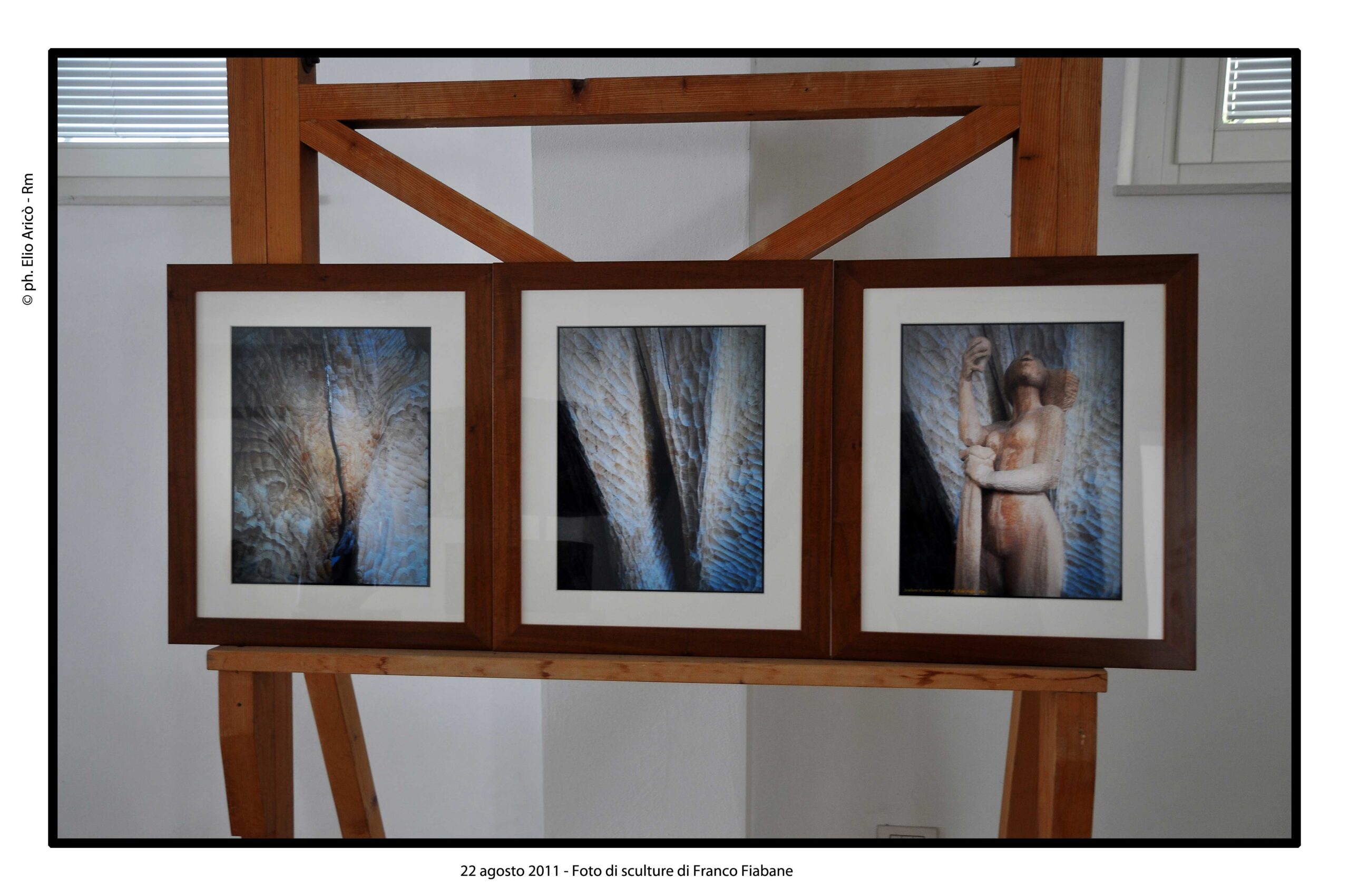 Nel suo laboratorio il tempo sembra rallentare, seguendo il ritmo paziente delle mani e del legno. Le immagini raccontano Franco Fiabane al lavoro nell’estate del 2011: uno scultore immerso nel dialogo silenzioso con la materia, circondato da trucioli, attrezzi e forme che nascono poco alla volta. Nel laboratorio si vedono opere in diverse fasi di lavorazione: grandi tronchi appena sbozzati, figure ancora incomplete, parti separate – braccia, busti, rilievi – che attendono di essere ricomposte o rifinite. Accanto alle sculture tridimensionali compaiono pannelli scolpiti a bassorilievo, scene narrative che richiamano il racconto popolare, la memoria collettiva, la vita quotidiana. È un mondo coerente, in cui il gesto artigianale si intreccia alla dimensione simbolica. Le fotografie di Elio Arico’ mostrano Fiabane concentrato, a volte sorridente, a volte assorto. Indossa il grembiule da lavoro, osserva l’opera da vicino, la tocca, la gira, come per verificarne l’equilibrio e l’anima. Il rapporto con il legno è fisico e diretto: martello e scalpello diventano strumenti di dialogo più che di forza, capaci di seguire le venature naturali del materiale e assecondarne le imperfezioni.